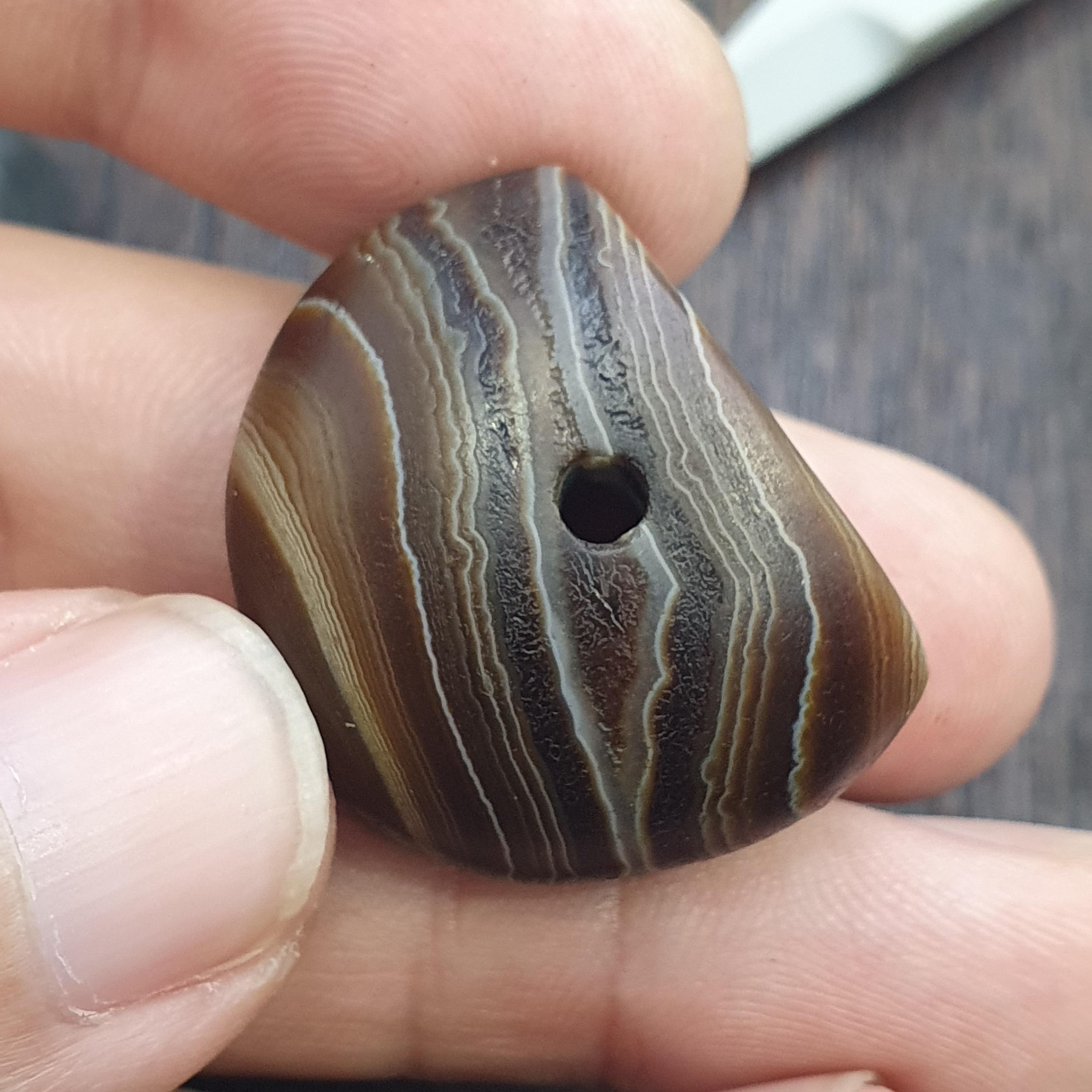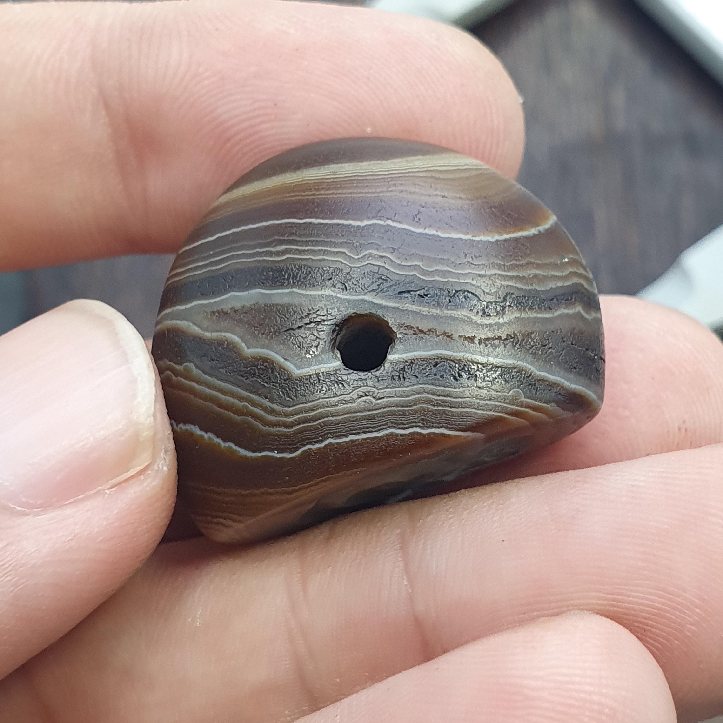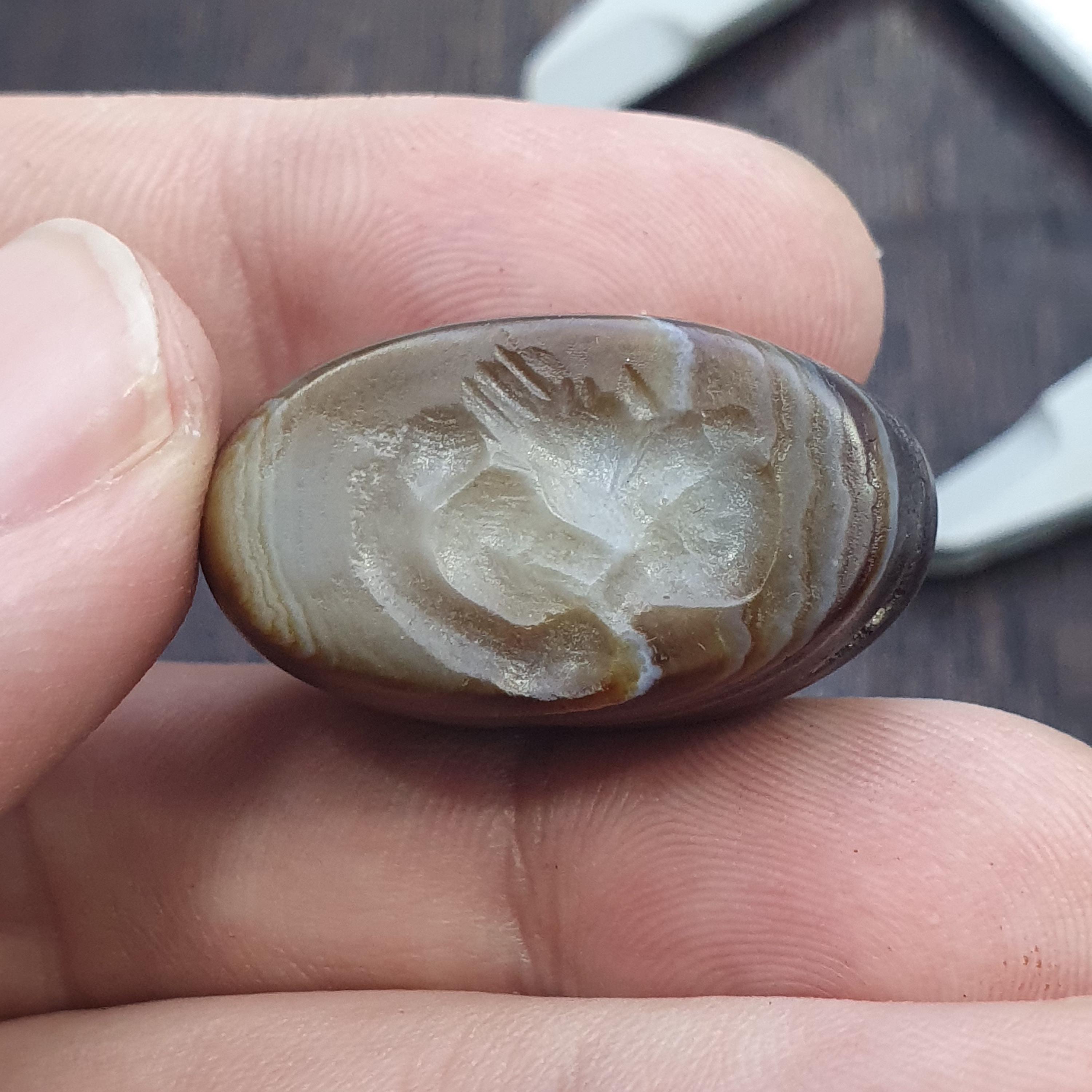 This antique Banded Agate Cylinder Seal features intricately carved figure in intaglio style. Made from Agate stone , this unique piece showcases the craftsmanship of the Near Eastern region. The original design on the agate material adds a touch of history and artistry to any collection of decorative collectibles.