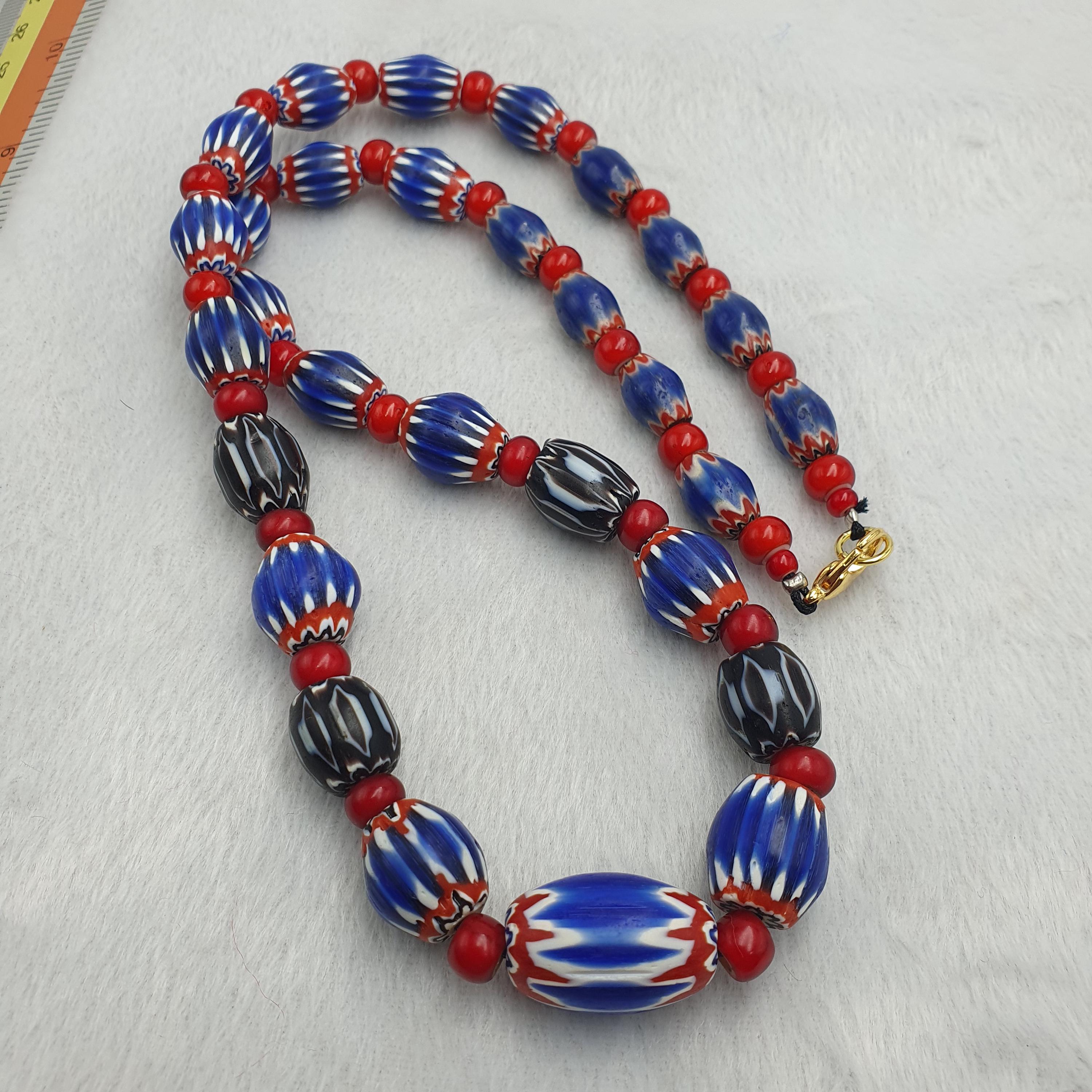 Made from high-quality glass beads, this necklace showcases a striking combination of red, white, and blue hues, with intricate striped patterns that reflect the masterful craftsmanship of late 20th-century artisans. The multi-layered chevron design adds depth and visual interest, making it an eye-catching accessory for both casual and formal occasions.