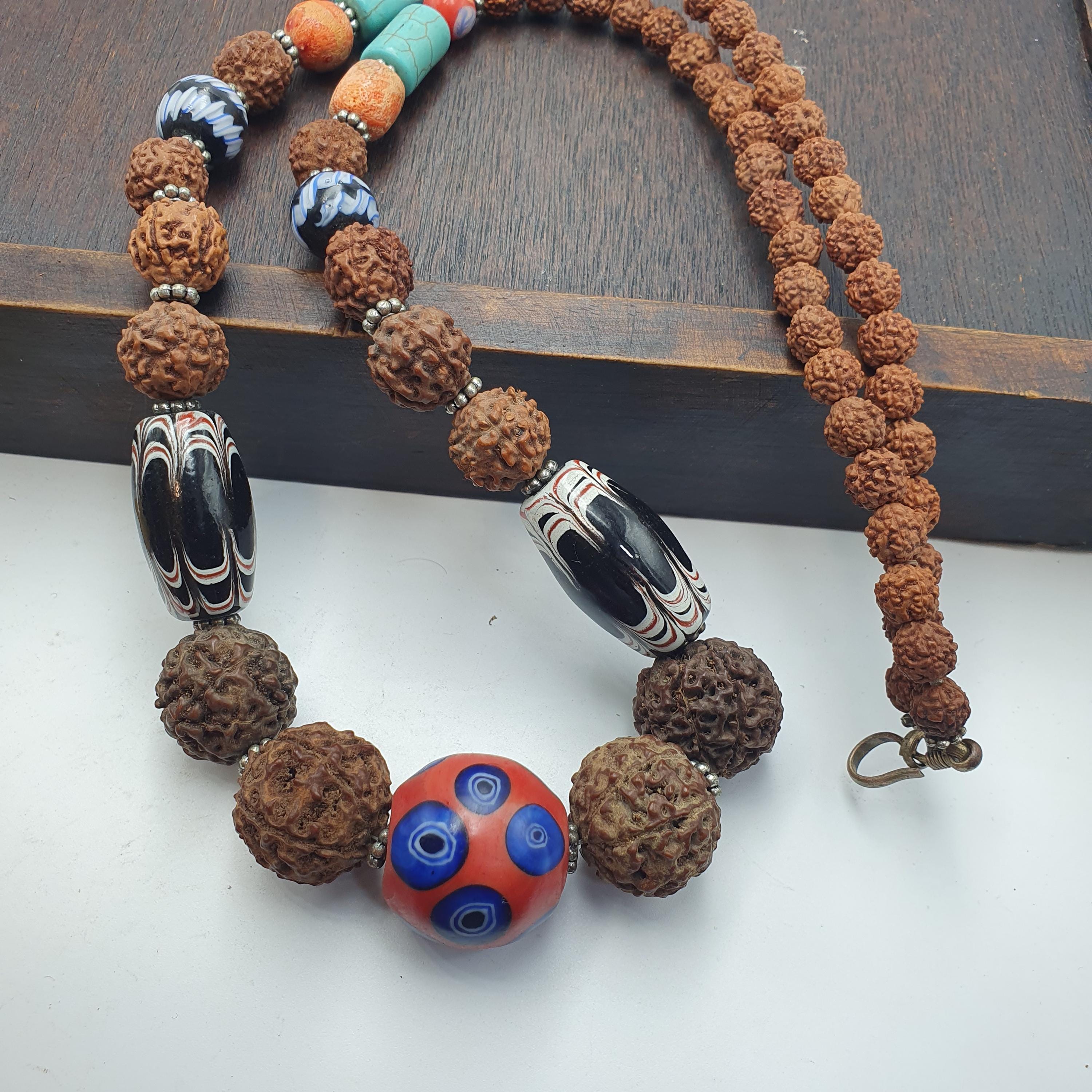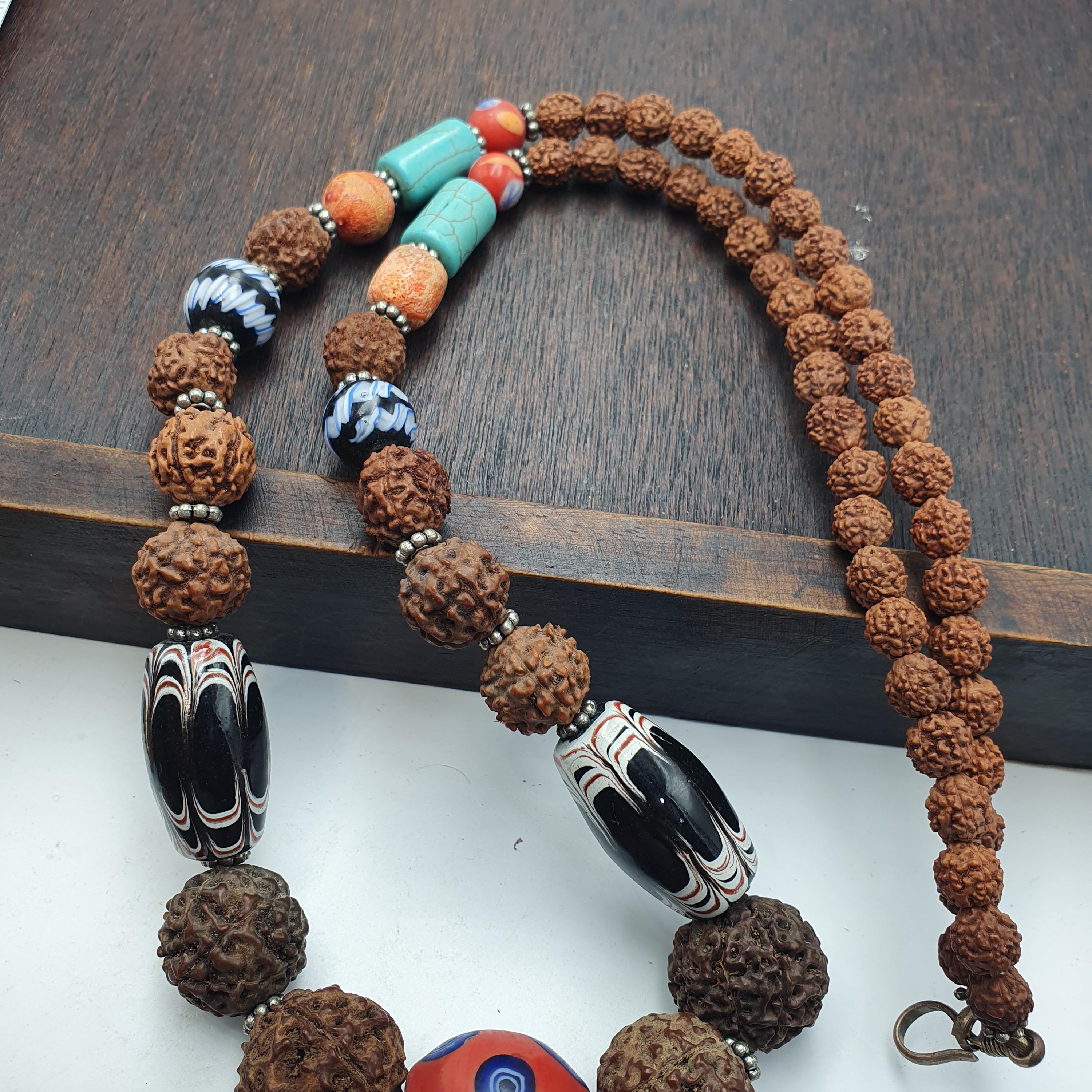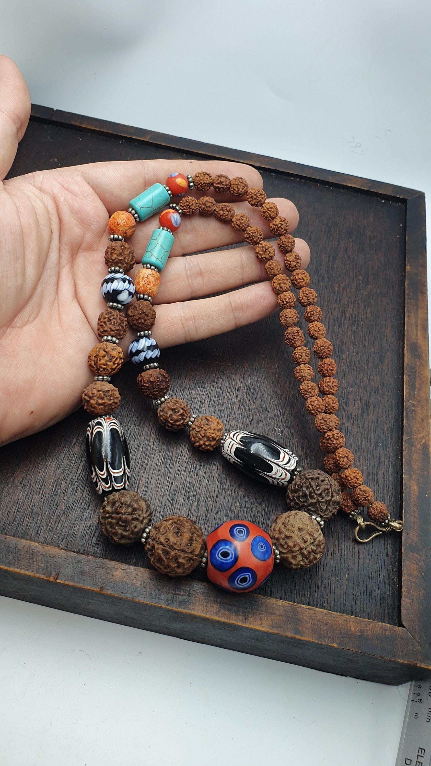Crafted with care, this beaded necklace features authentic Rudraksha seeds known for their spiritual significance and healing properties. The addition of evil eye glass beads offers protection and positive energy, while the turquoise stones add a pop of color and tranquility. Whether you're looking for a meaningful gift for a loved one or a special piece to elevate your own jewelry collection, this handmade necklace is an exceptional choice.