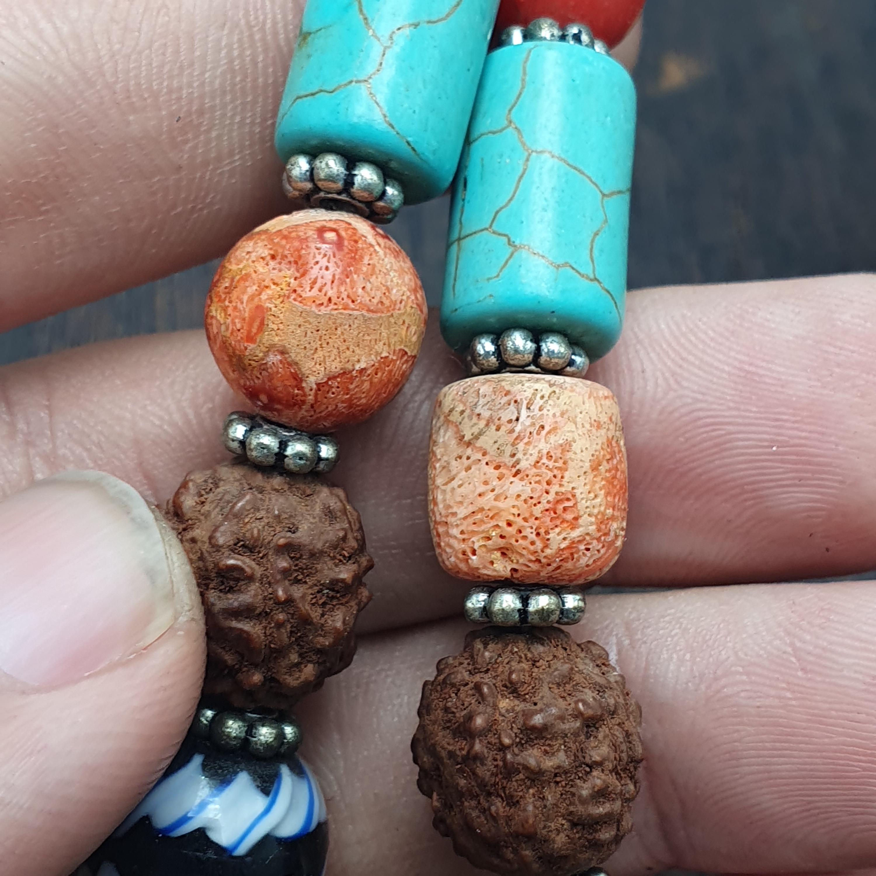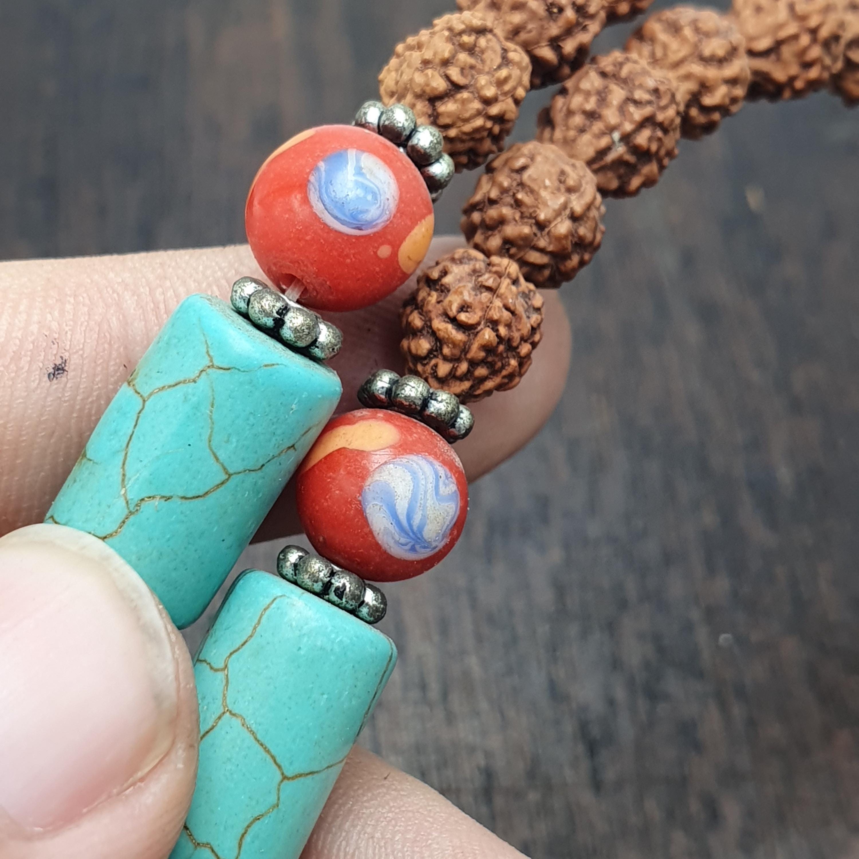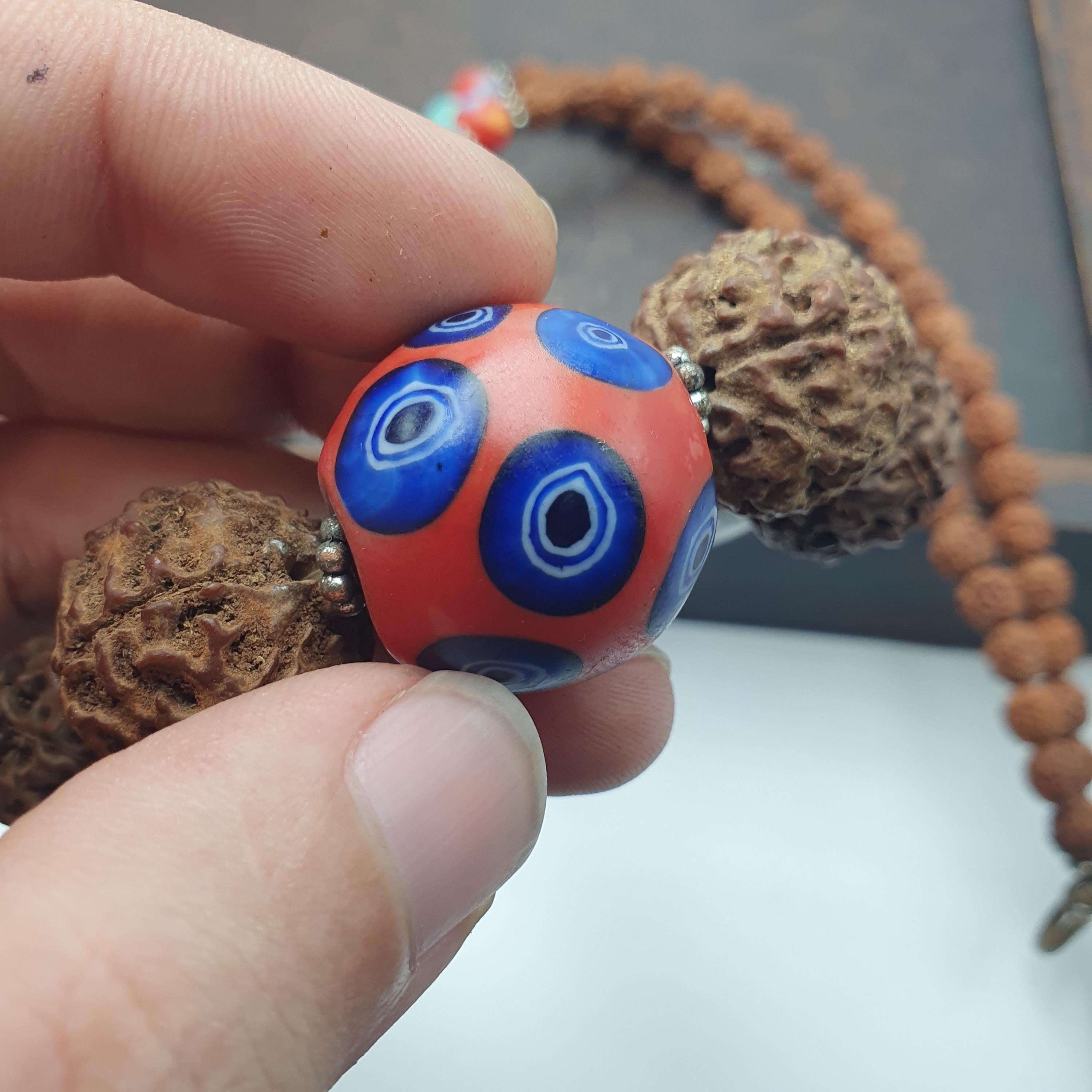 Crafted with care, this beaded necklace features authentic Rudraksha seeds known for their spiritual significance and healing properties. The addition of evil eye glass beads offers protection and positive energy, while the turquoise stones add a pop of color and tranquility. Whether you're looking for a meaningful gift for a loved one or a special piece to elevate your own jewelry collection, this handmade necklace is an exceptional choice.
