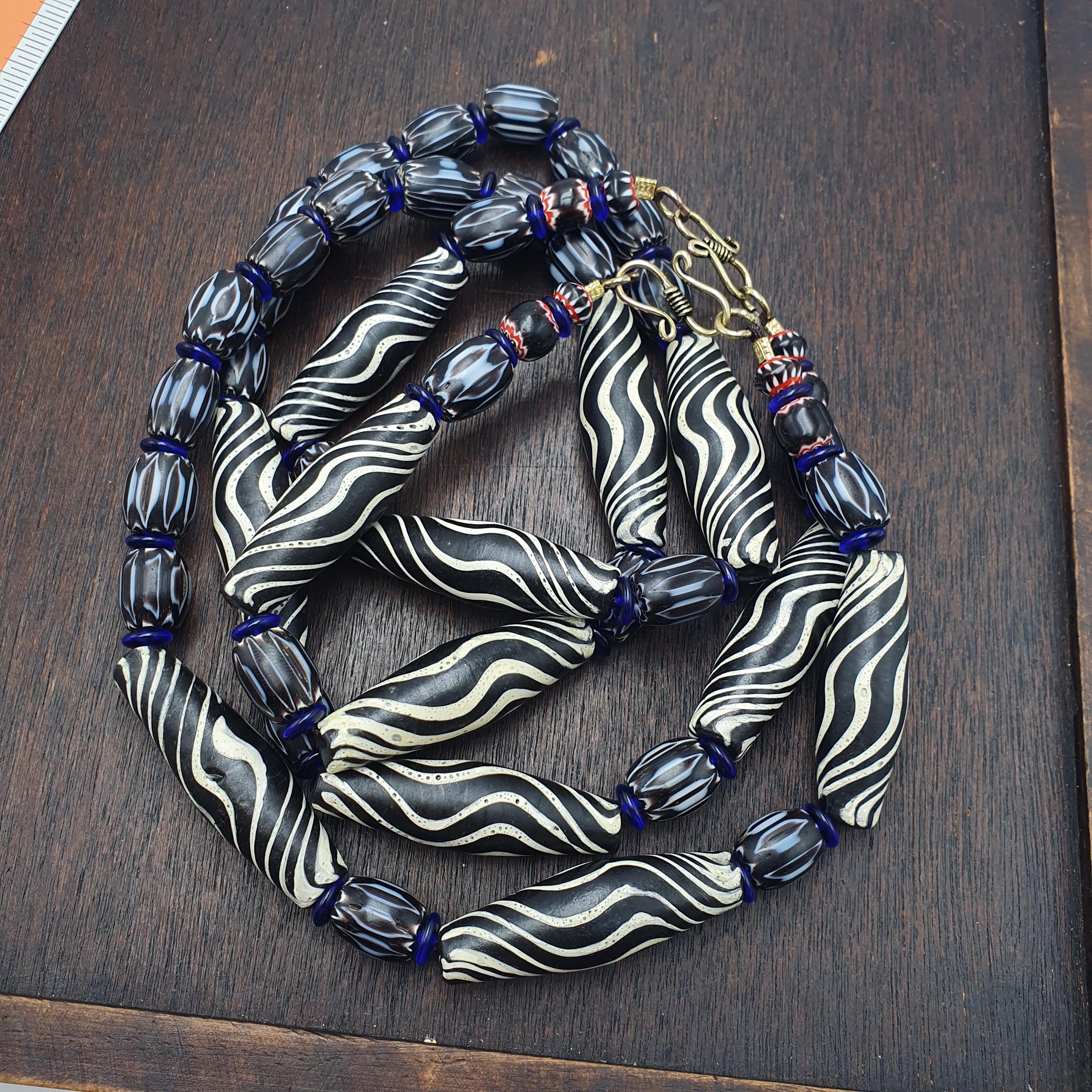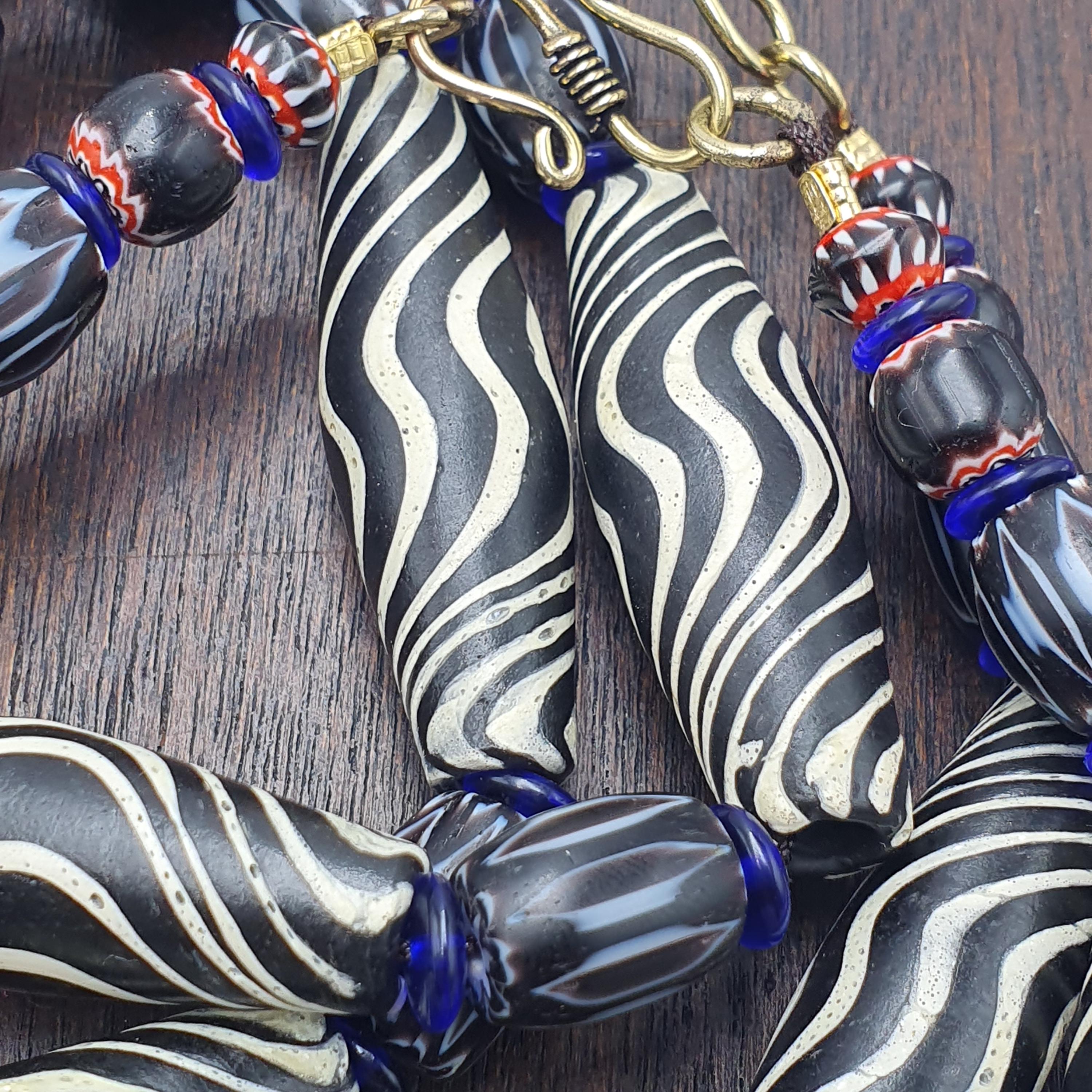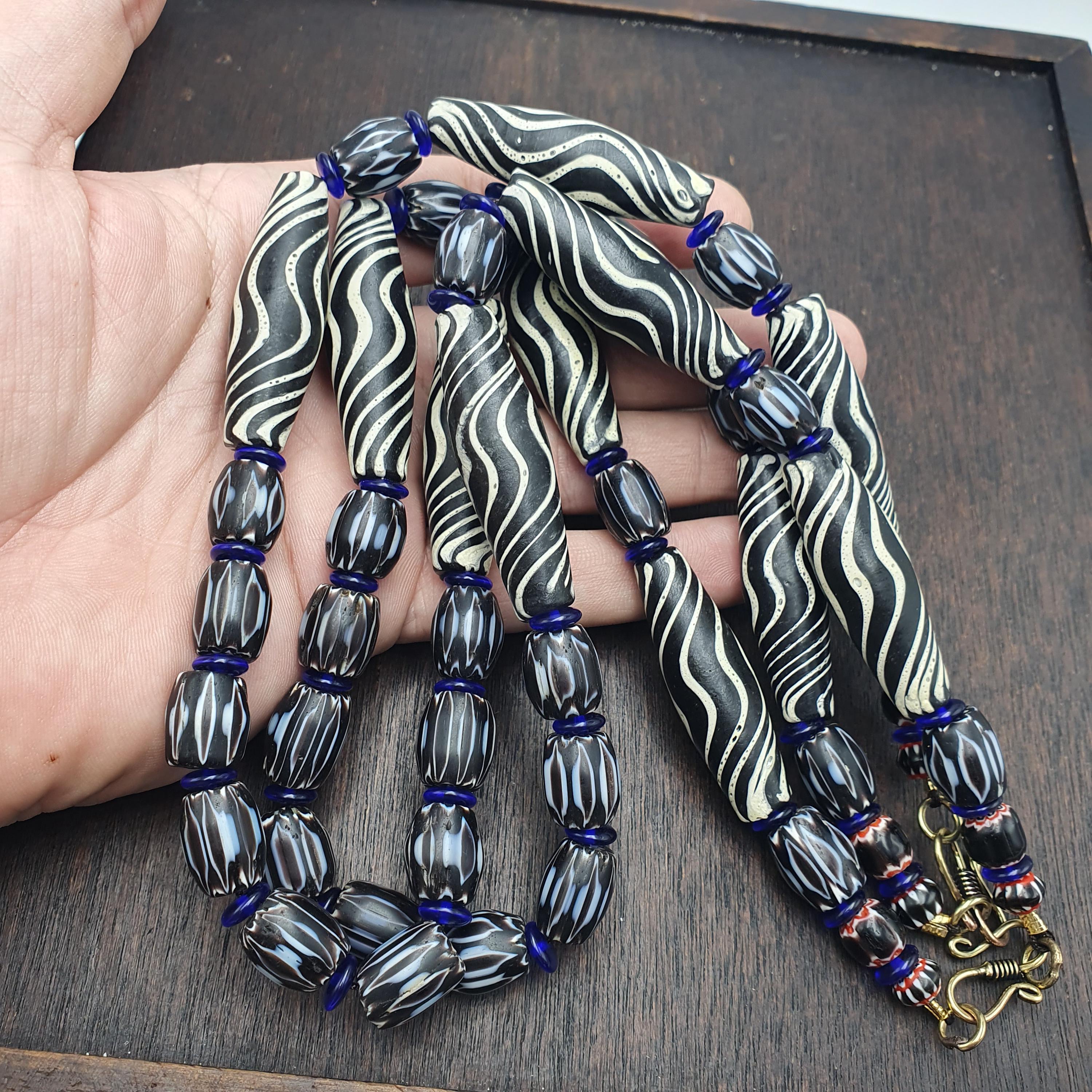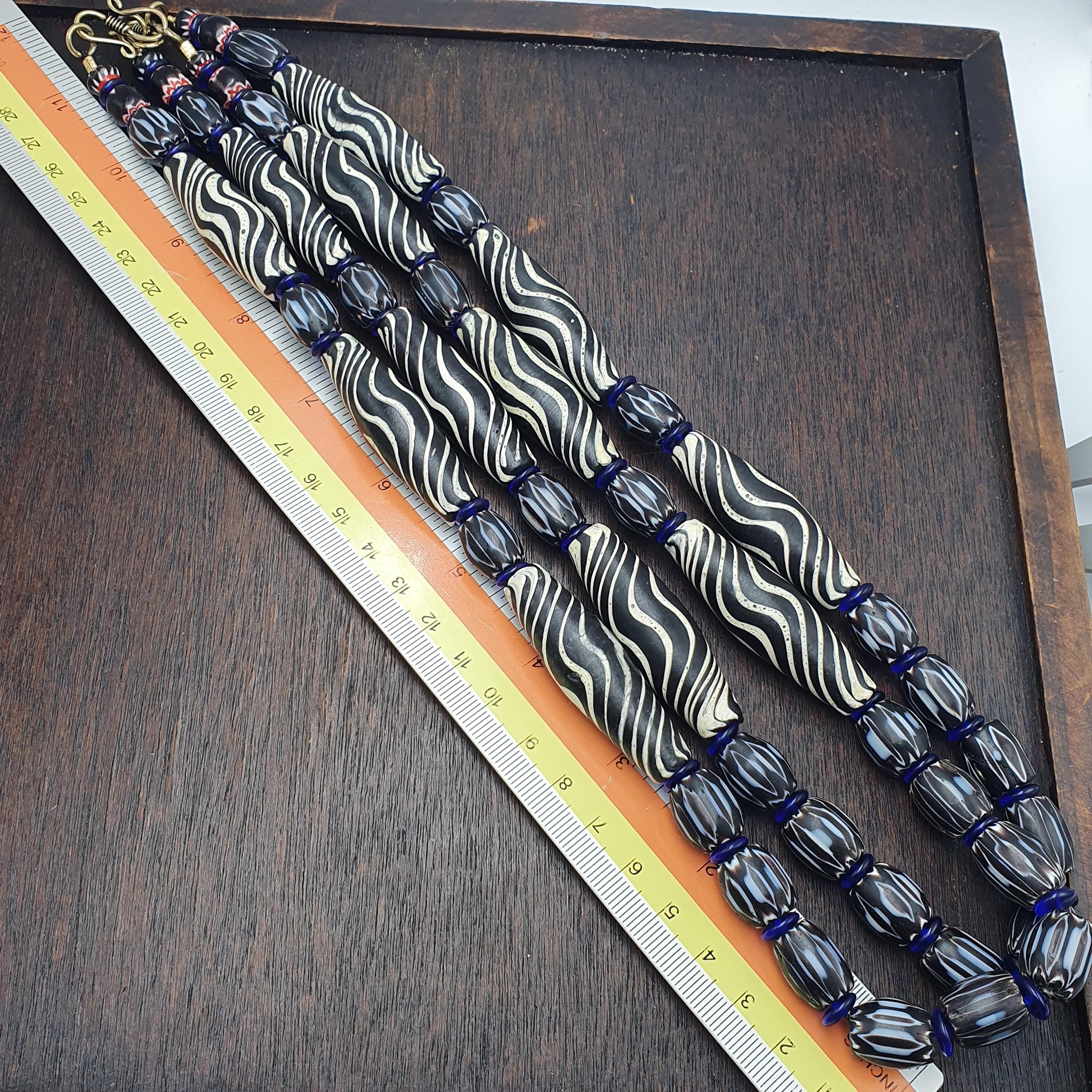 Discover the striking beauty of this Venetian Style Glass Trade Bead Necklace featuring black and white swirl feathered tribal beads and bold black chevron accents. Perfect for adding a touch of boho elegance to any outfit, this handcrafted necklace captures the timeless artistry of traditional glass bead-making with a contemporary tribal twist.