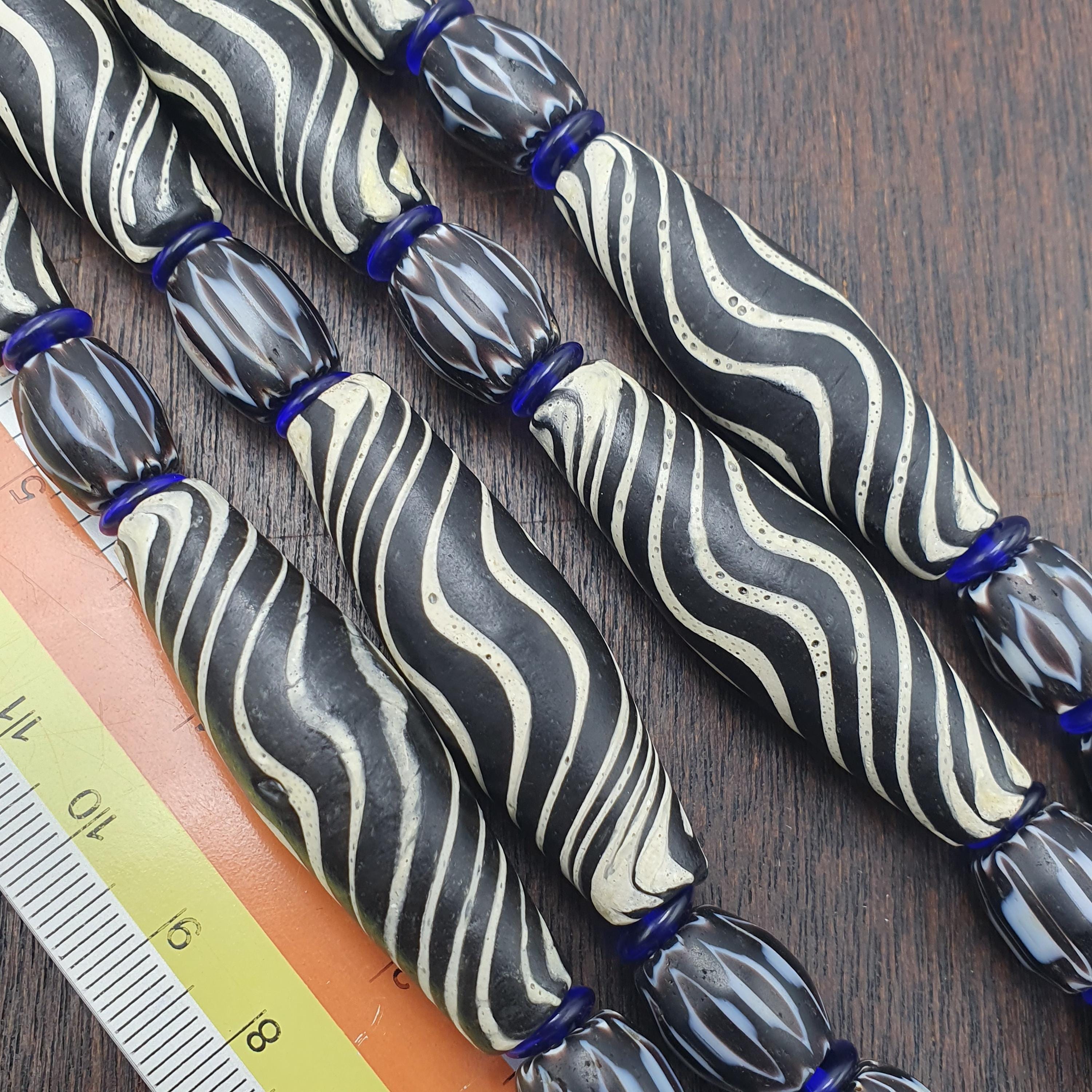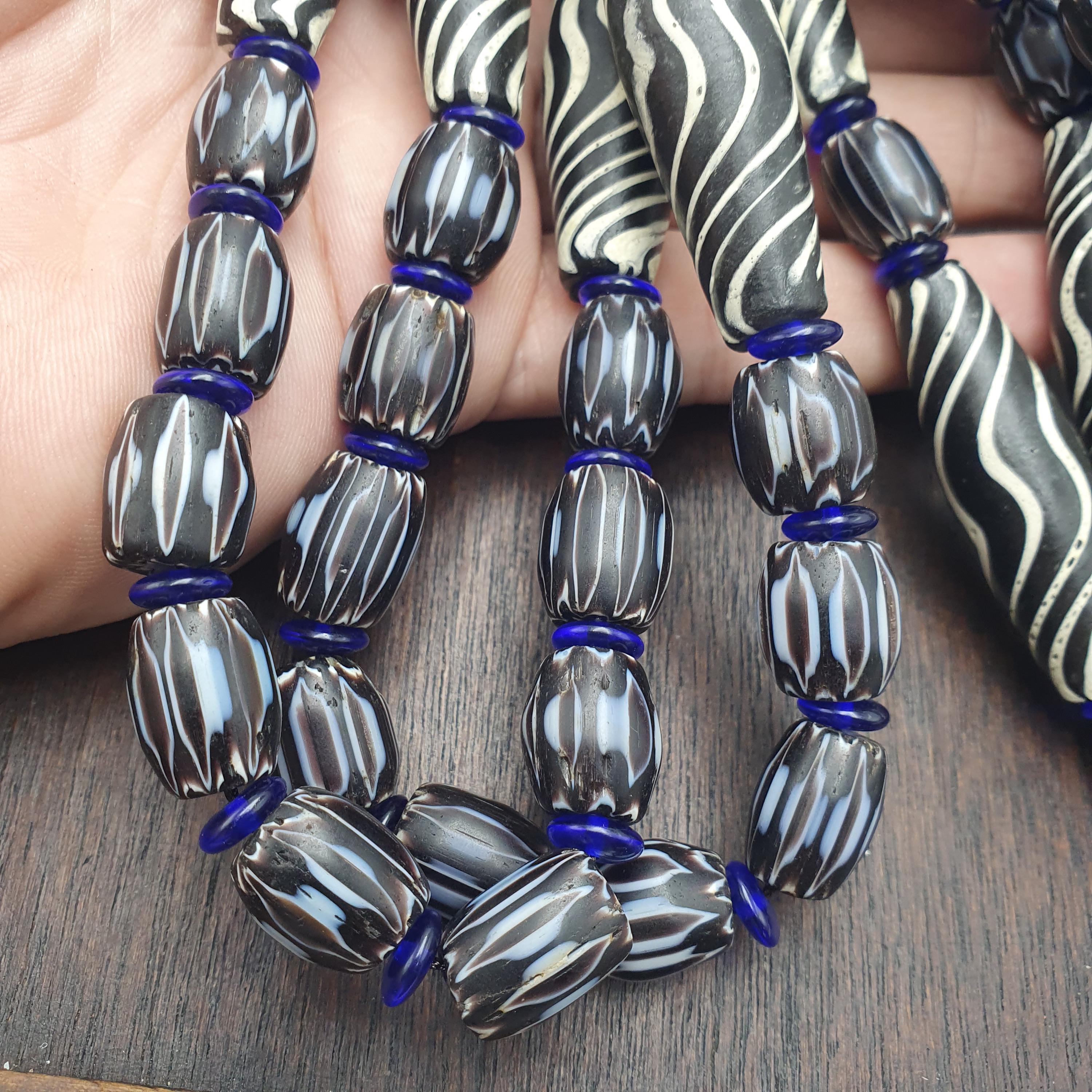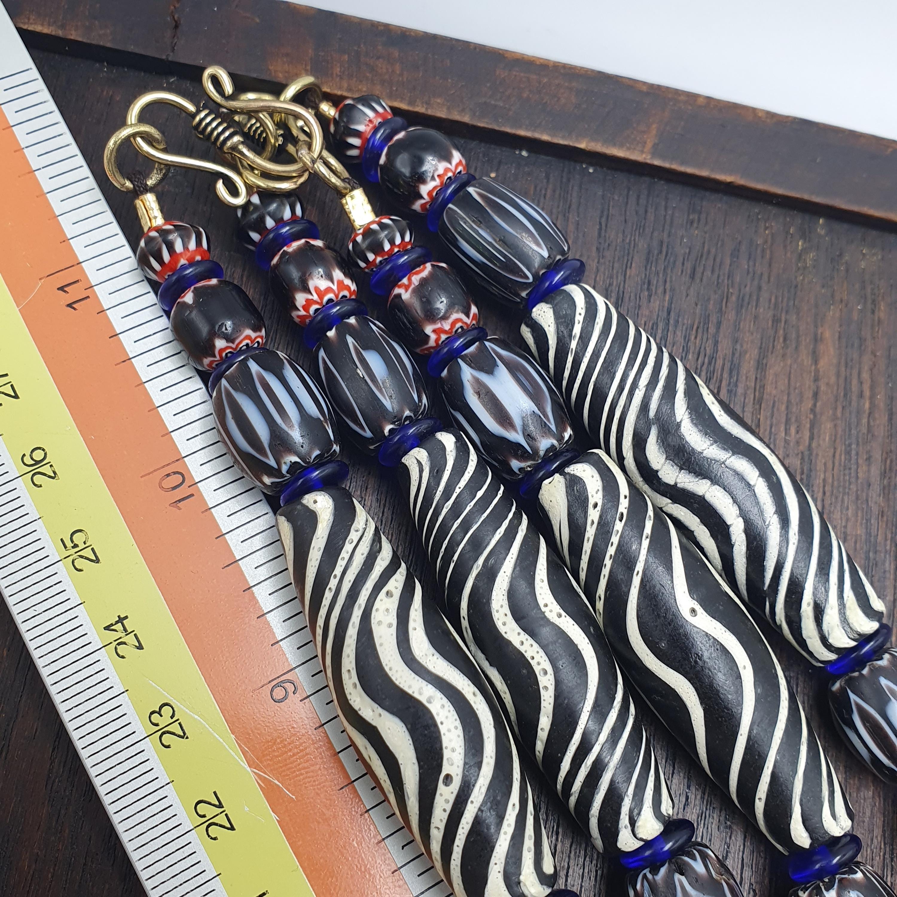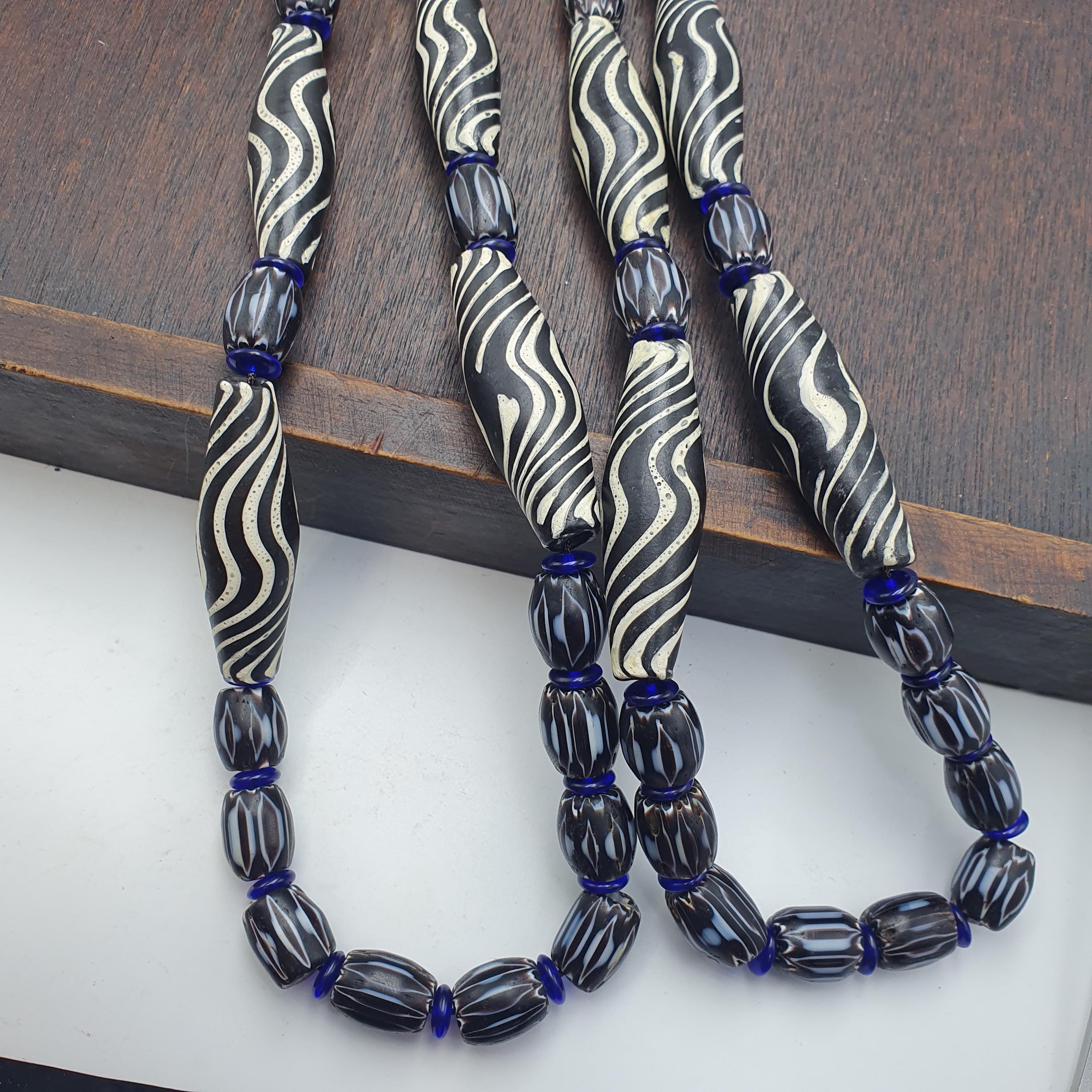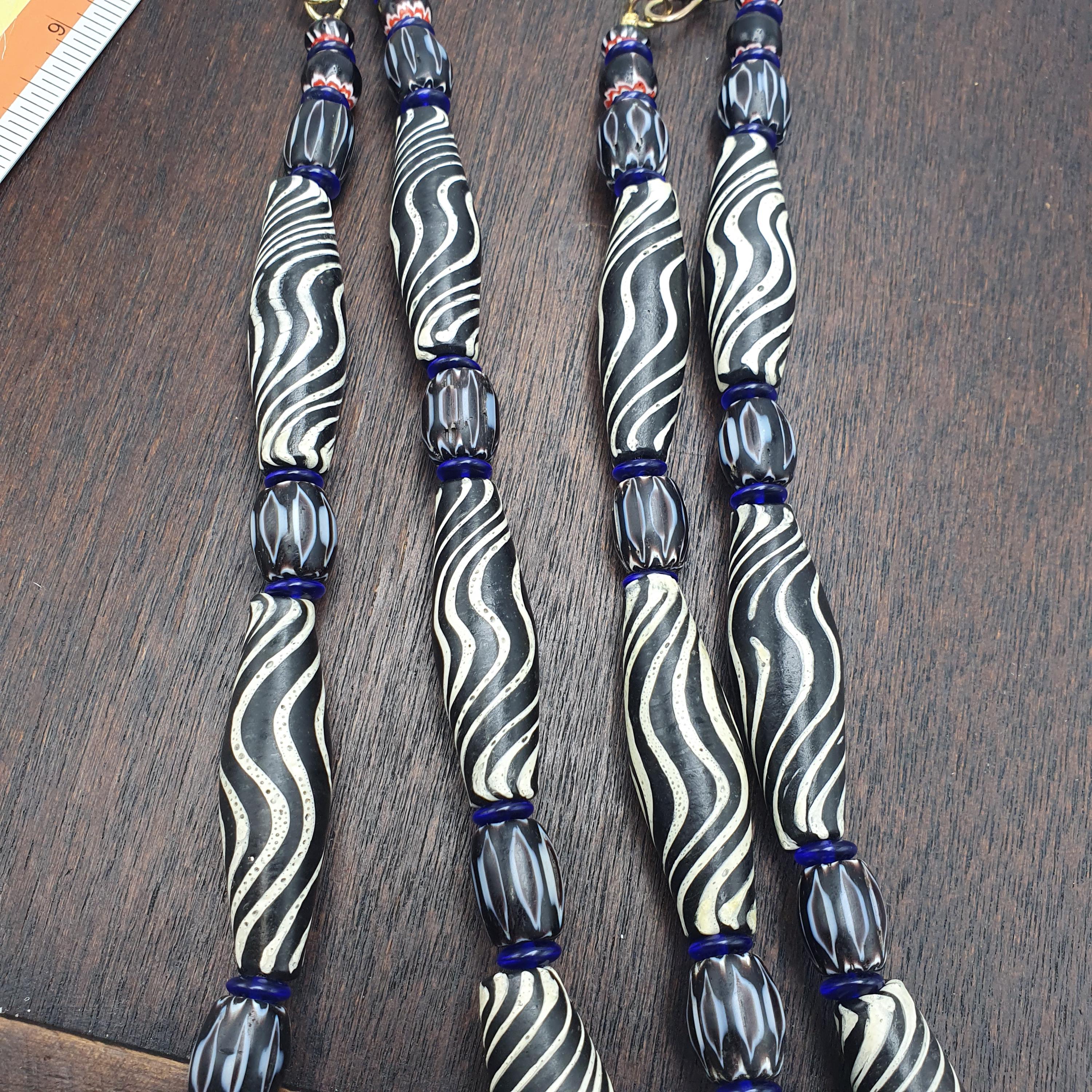 Discover the striking beauty of this Venetian Style Glass Trade Bead Necklace featuring black and white swirl feathered tribal beads and bold black chevron accents. Perfect for adding a touch of boho elegance to any outfit, this handcrafted necklace captures the timeless artistry of traditional glass bead-making with a contemporary tribal twist.