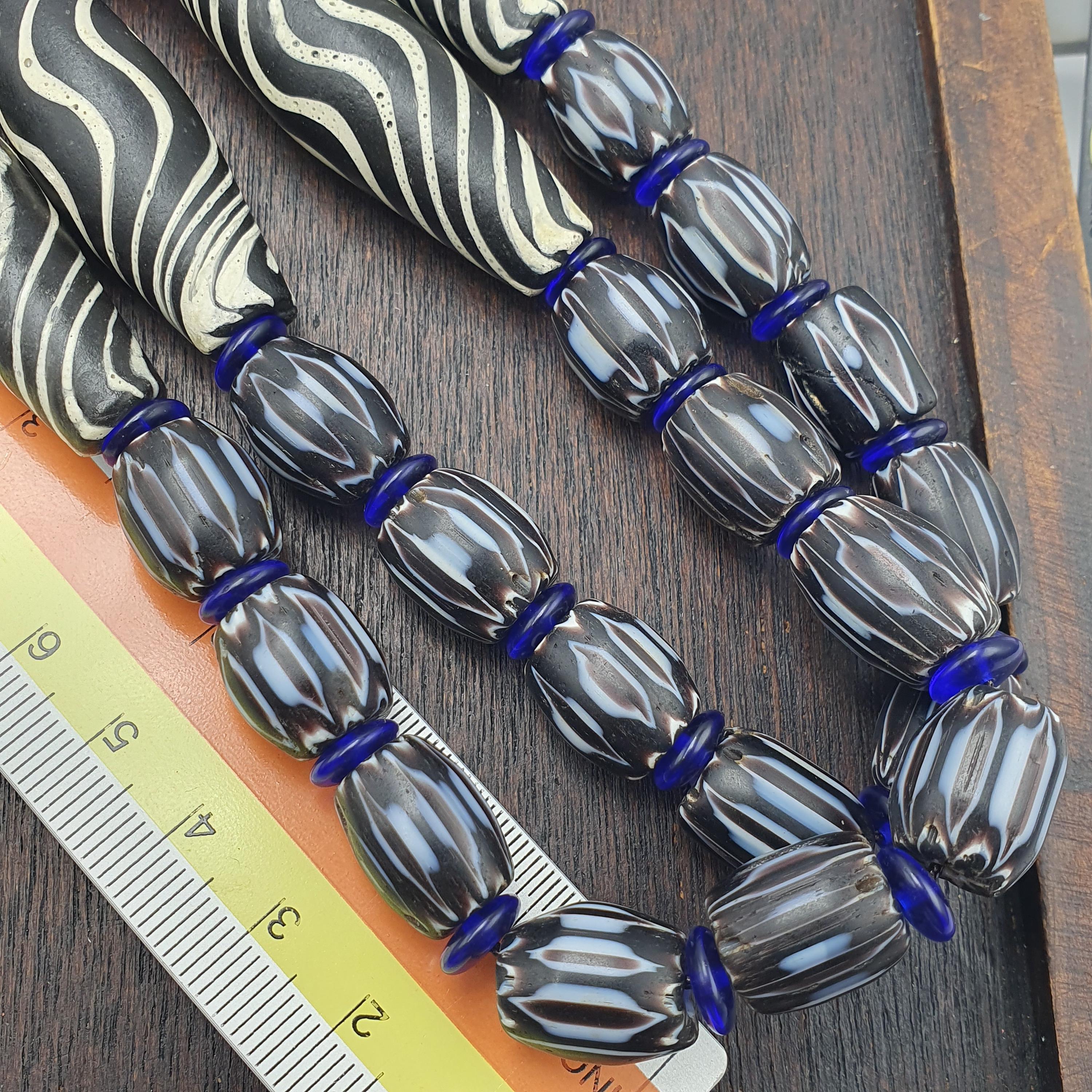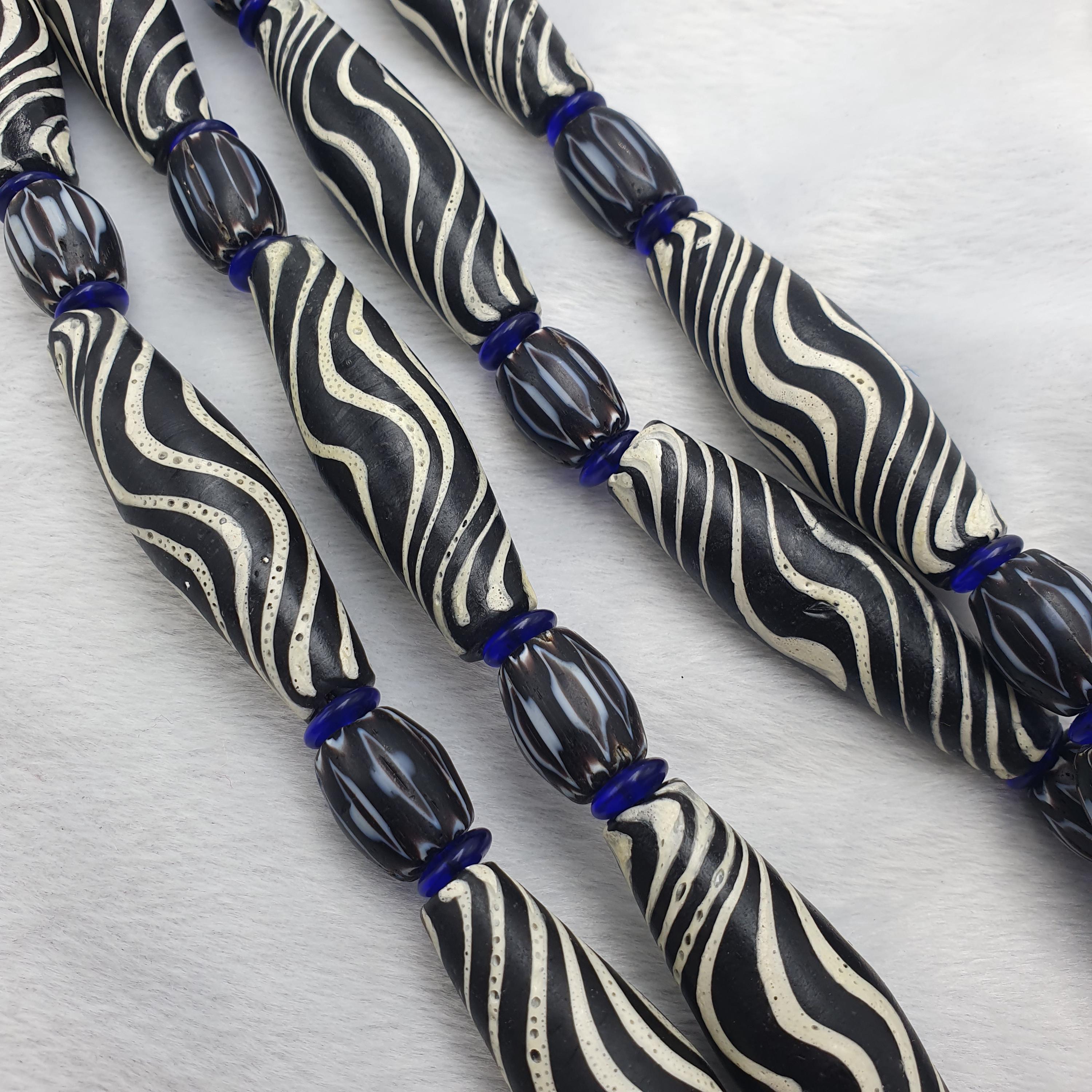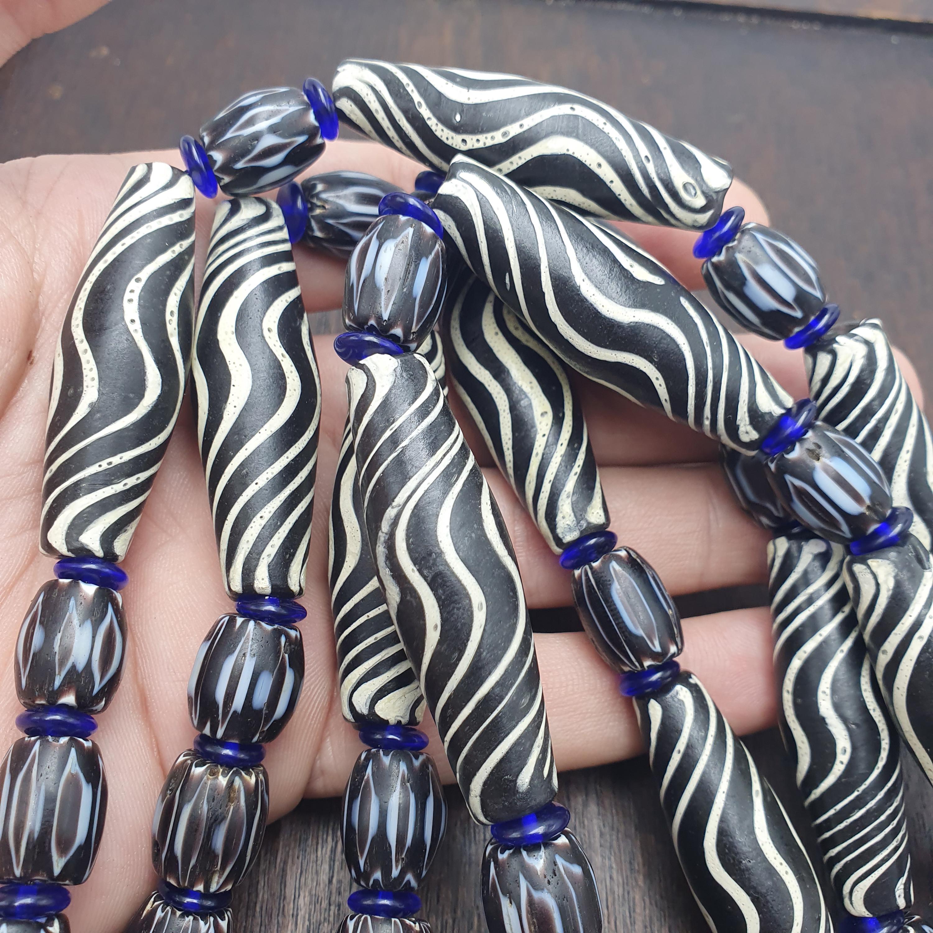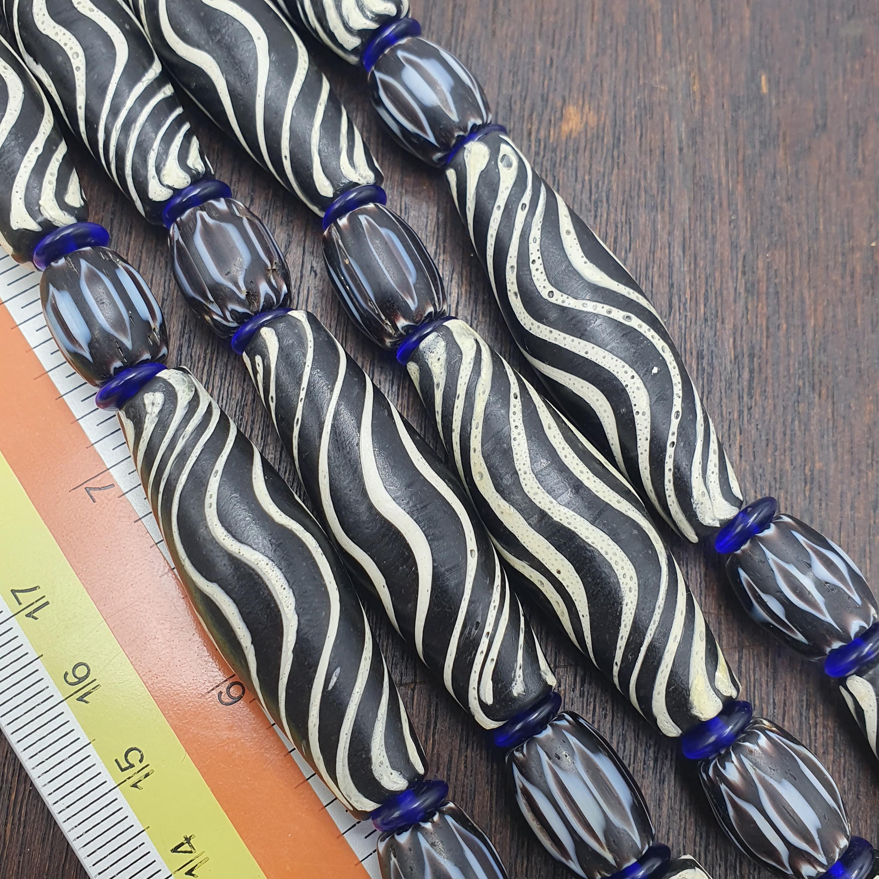 Discover the striking beauty of this Venetian Style Glass Trade Bead Necklace featuring black and white swirl feathered tribal beads and bold black chevron accents. Perfect for adding a touch of boho elegance to any outfit, this handcrafted necklace captures the timeless artistry of traditional glass bead-making with a contemporary tribal twist.