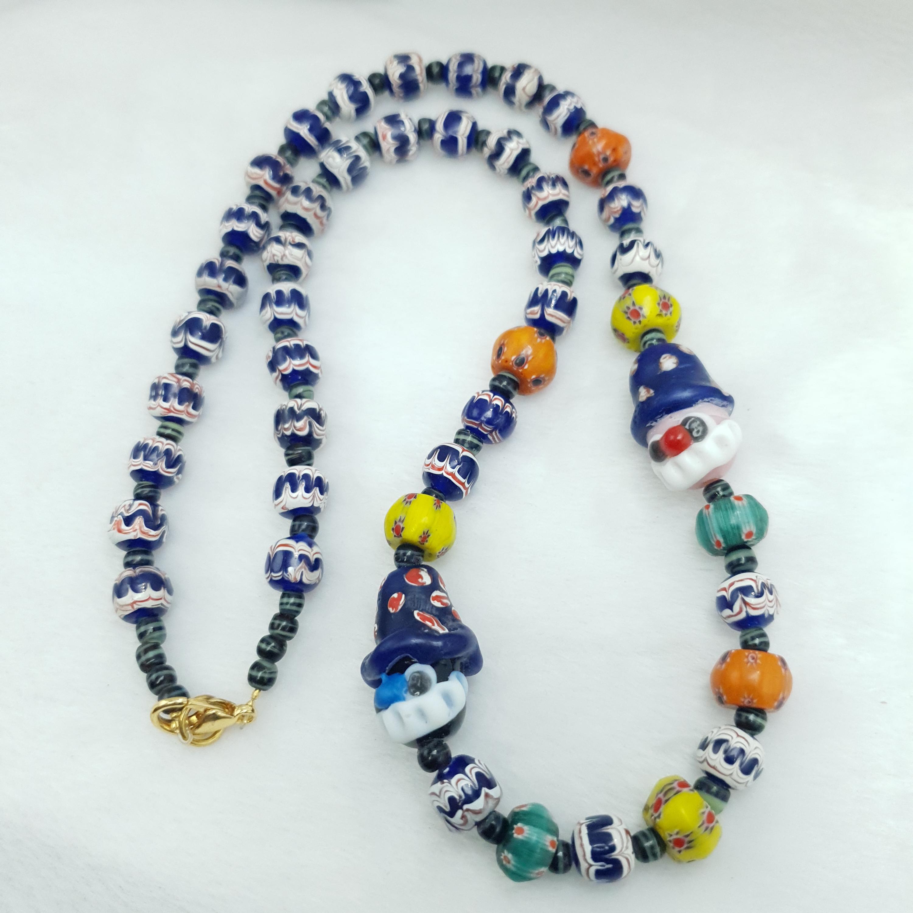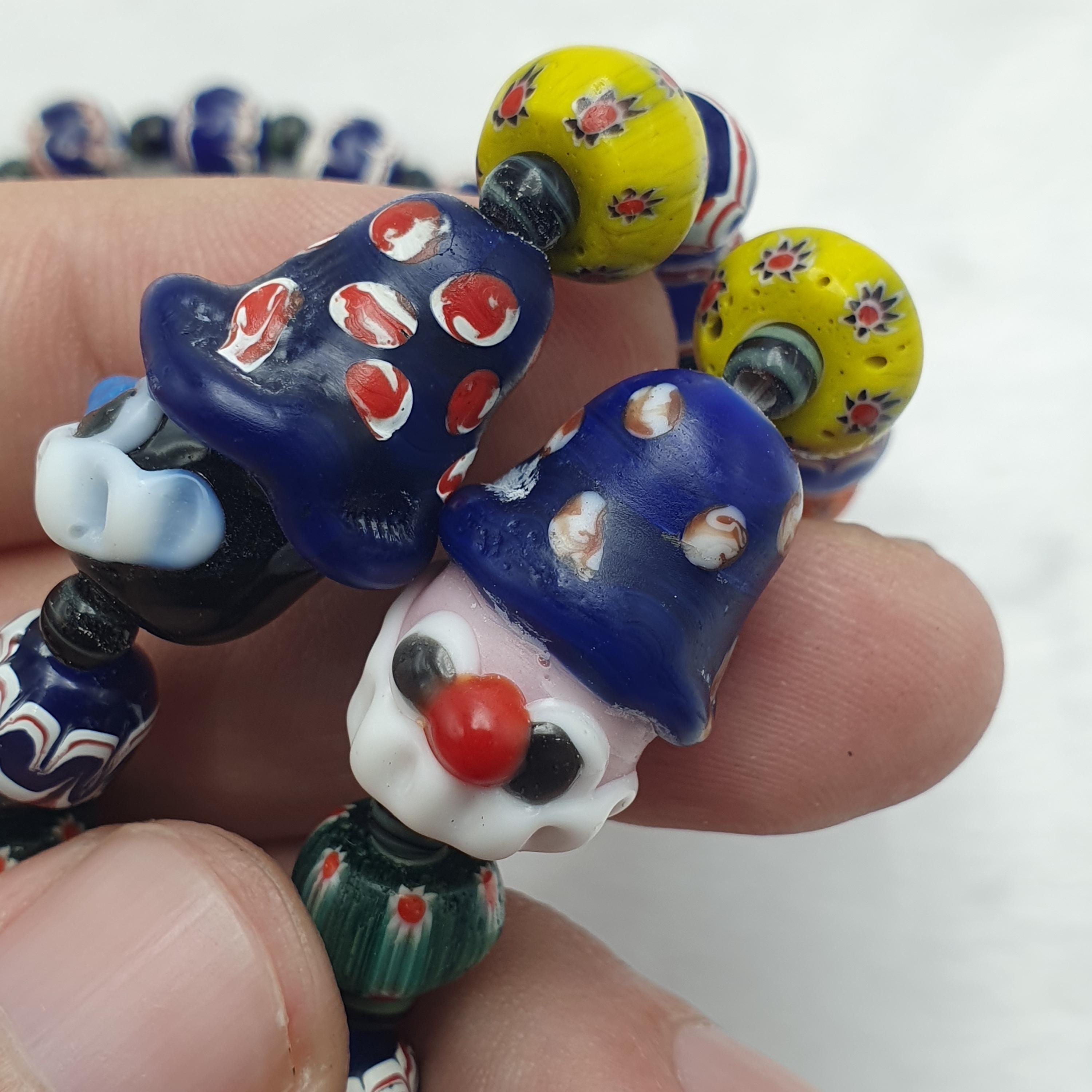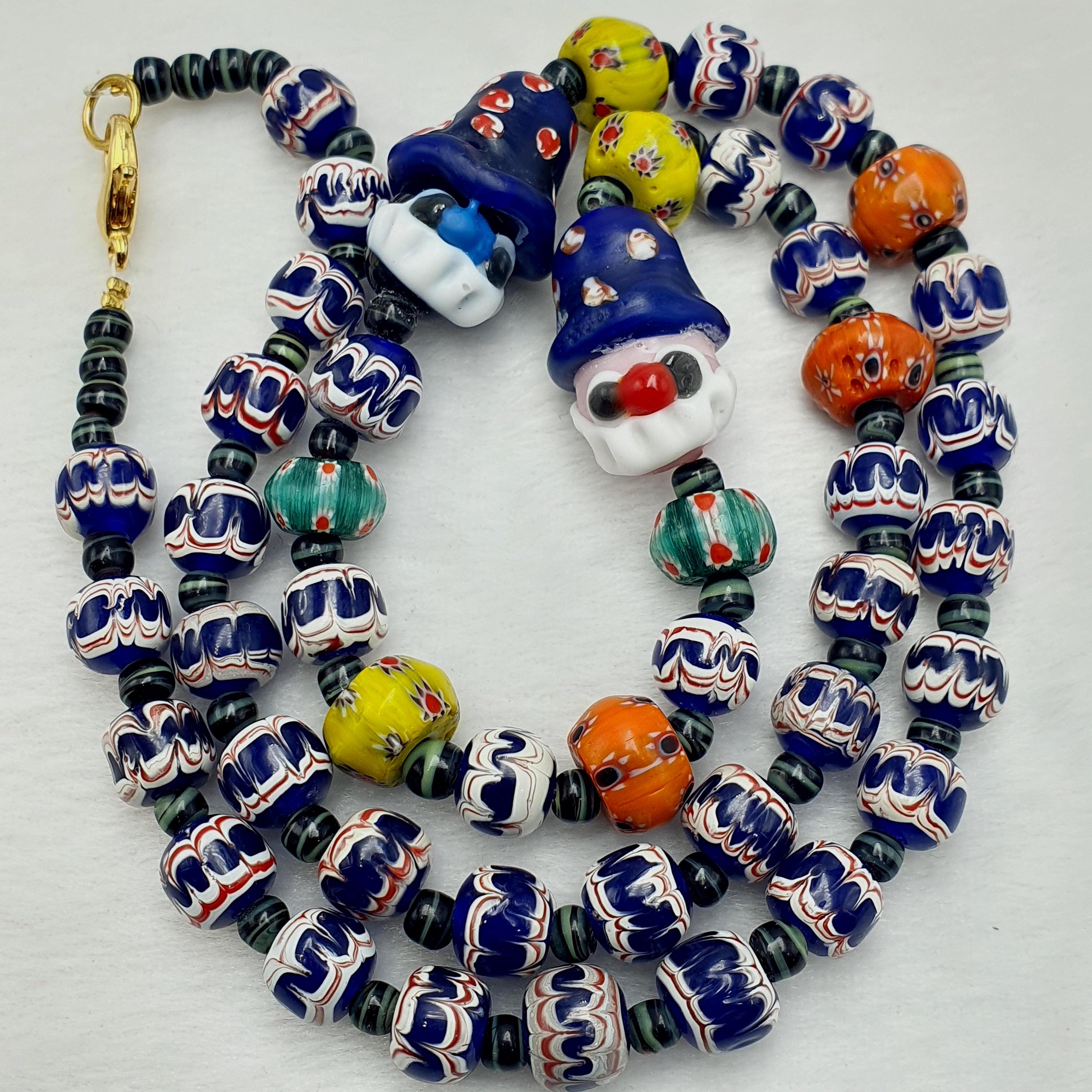 Designed to capture attention and ignite conversations, each bead is carefully handmade, showcasing intricate patterns and bold colors. The playful clown face beads add a touch of fun and personality, making this necklace an ideal gift for her or him, or a special addition to your vintage jewelry collection.