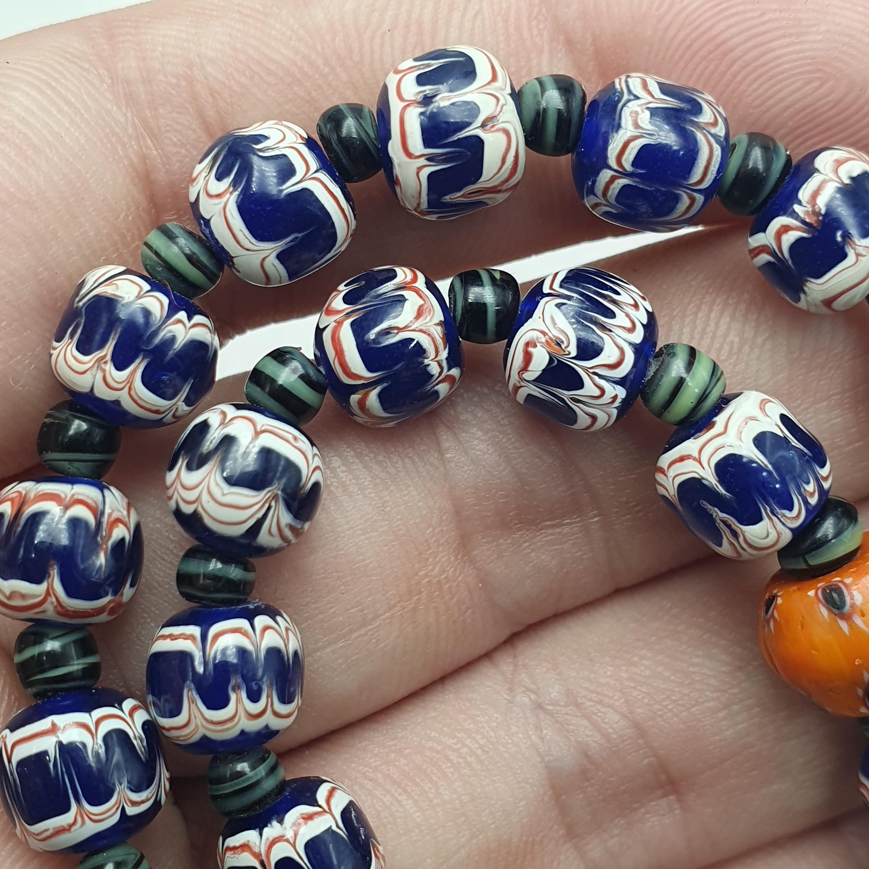 - Handcrafted Venetian style chevron beads with vibrant blue Murano Millefiori style zigzag patterns