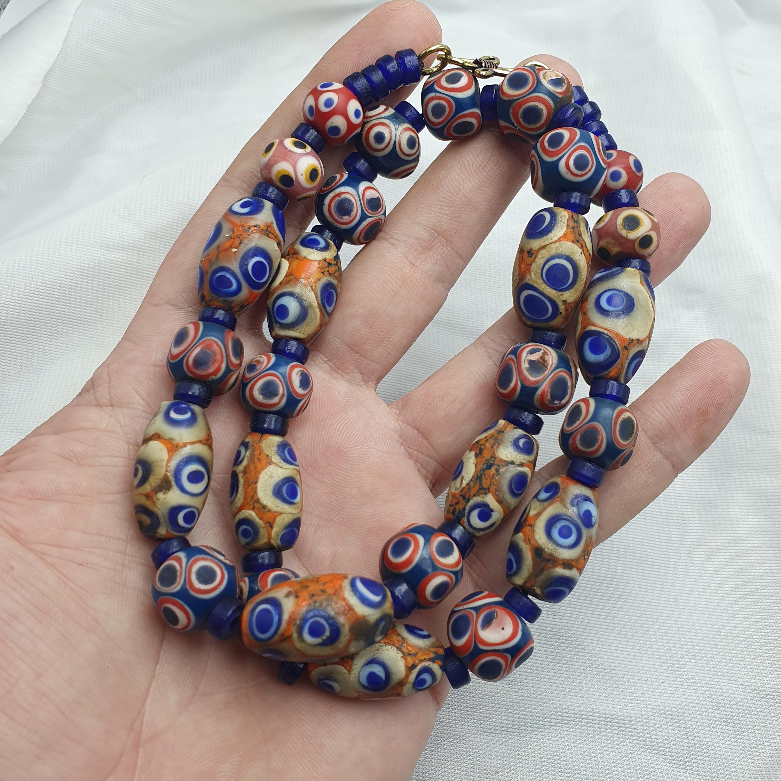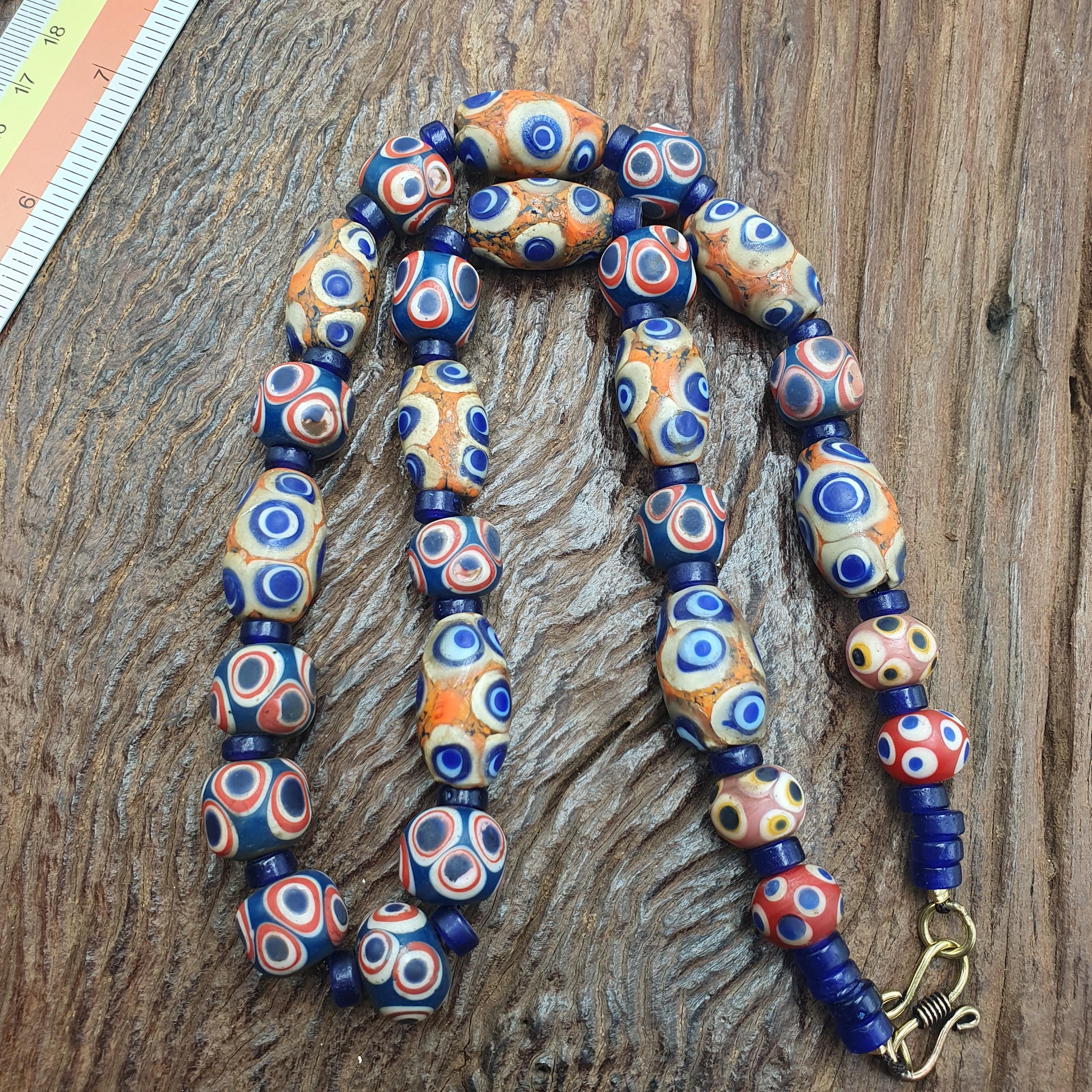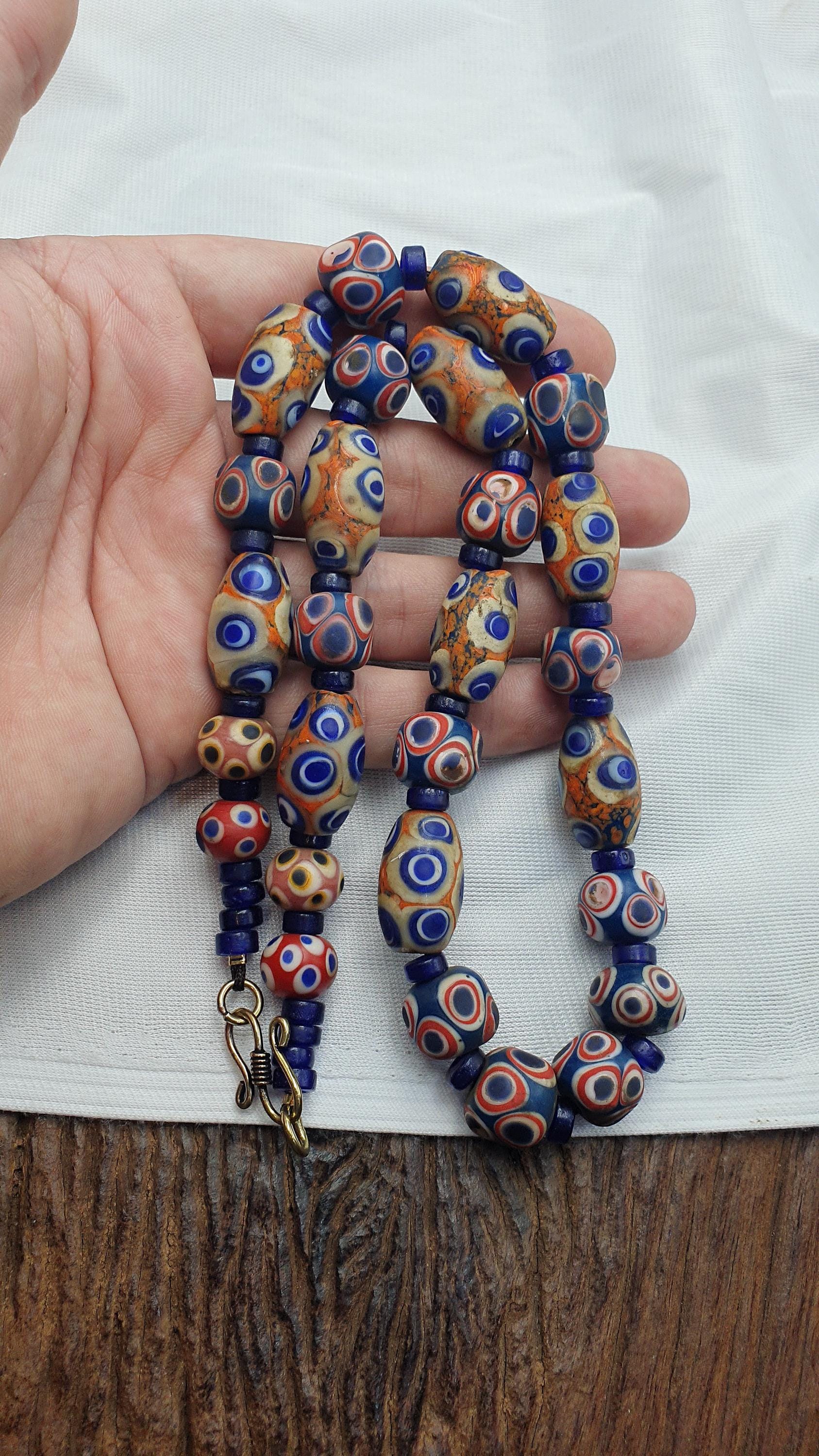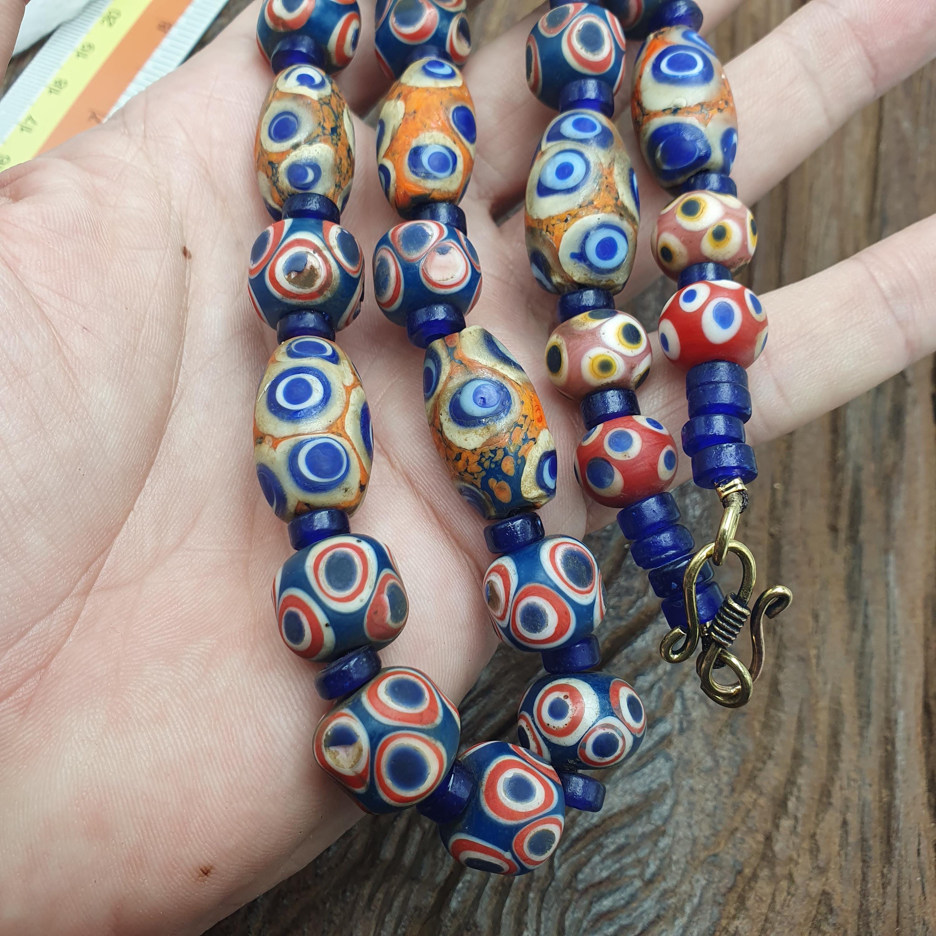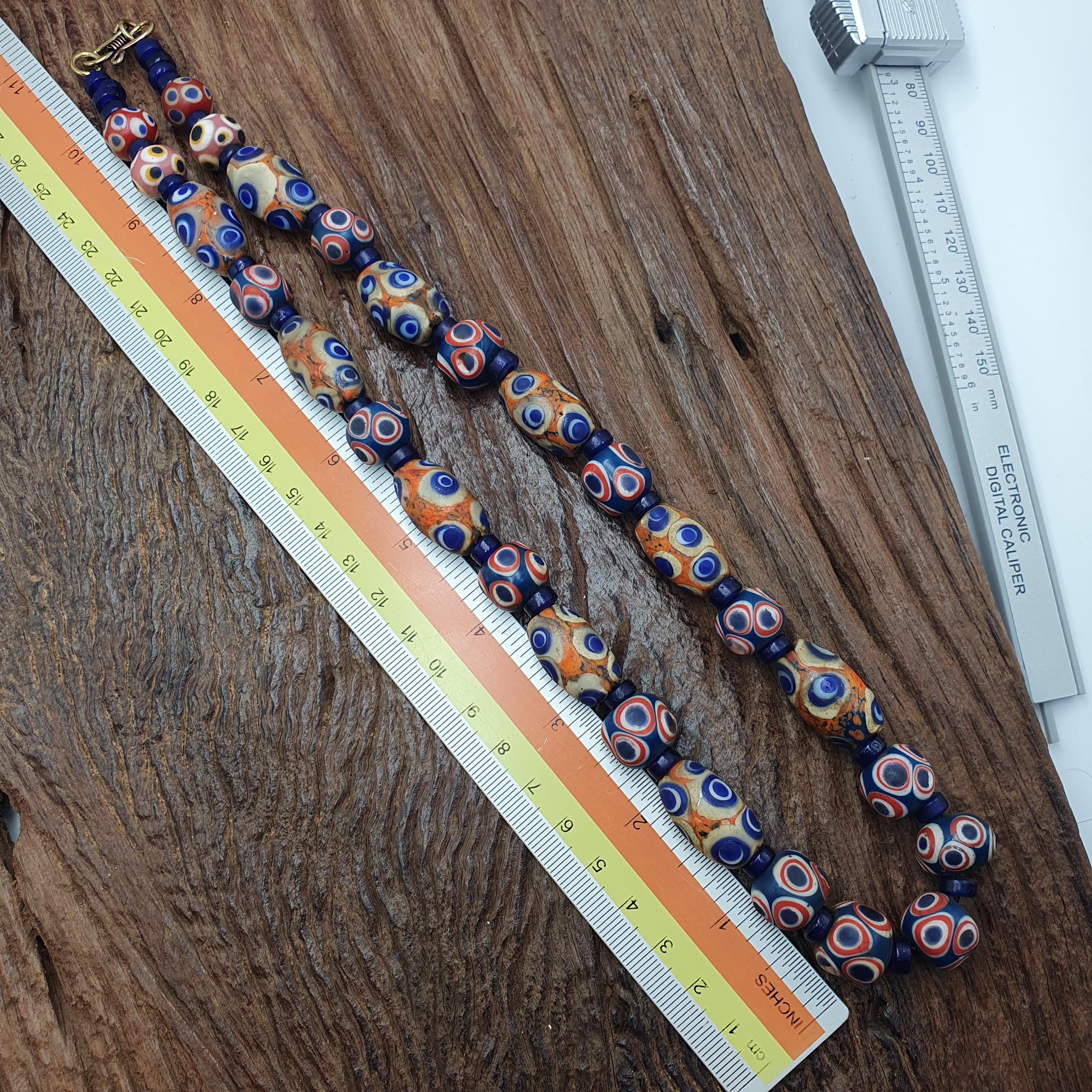 Discover the timeless elegance of our Venetian Style Hundred Eyes Skunk Beads Necklace, a stunning statement piece measuring 22 inches long with 10mm beads that beautifully showcase intricate craftsmanship. Crafted from vibrant glass, this vintage-inspired necklace features distinctive black skunk trade beads, also known as hundred eyes skunk beads, renowned for their unique dot pattern resembling tiny eyes — a true collector’s delight!