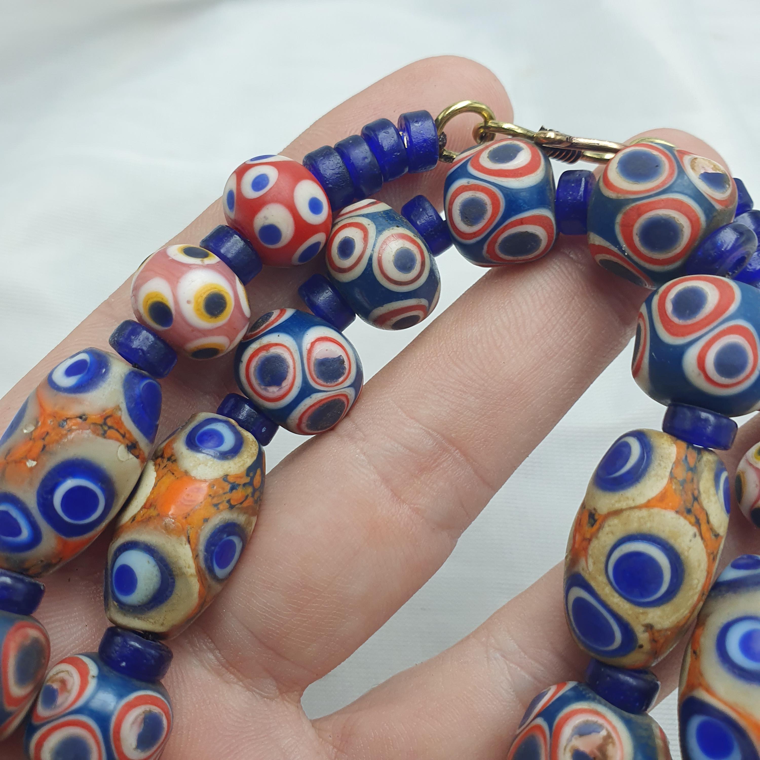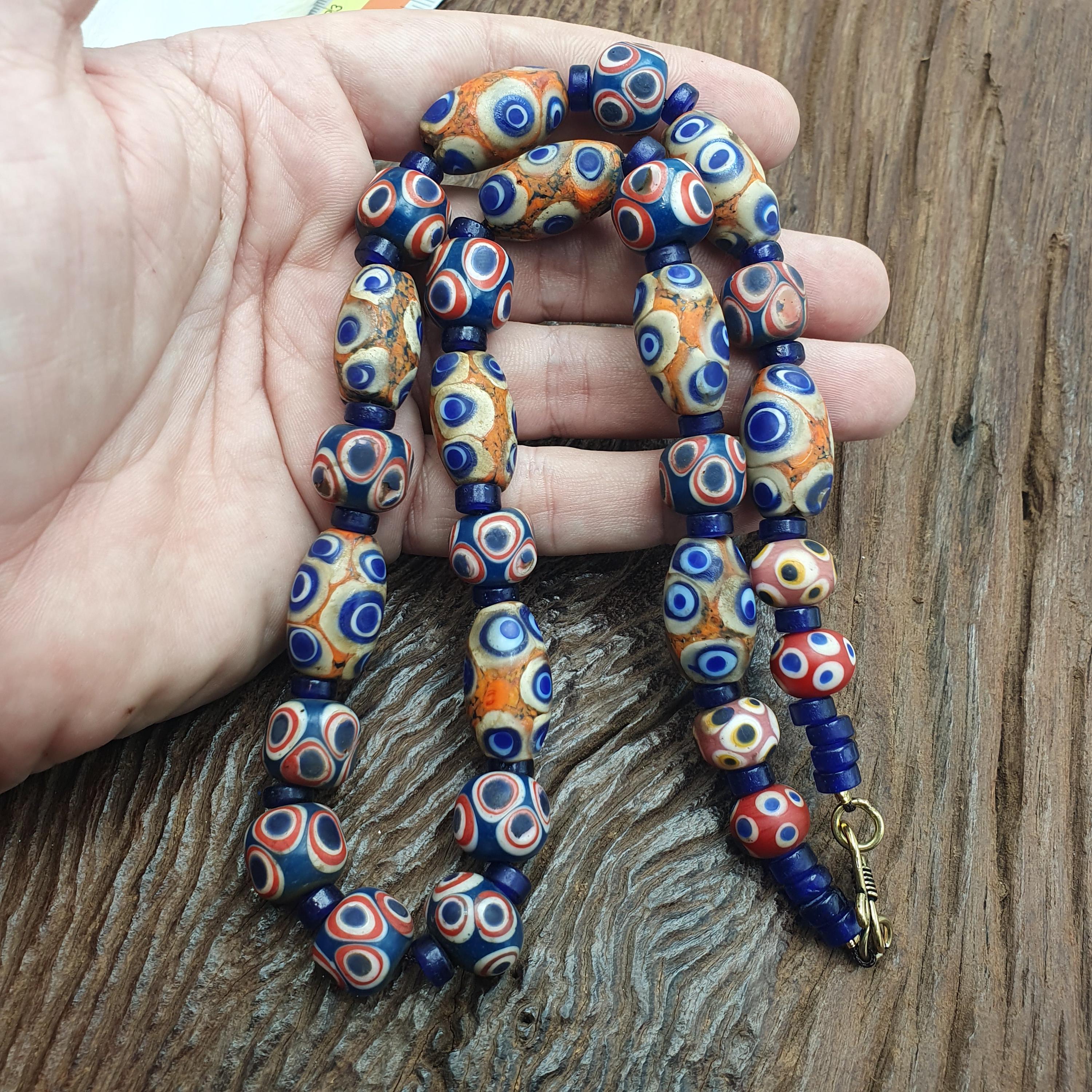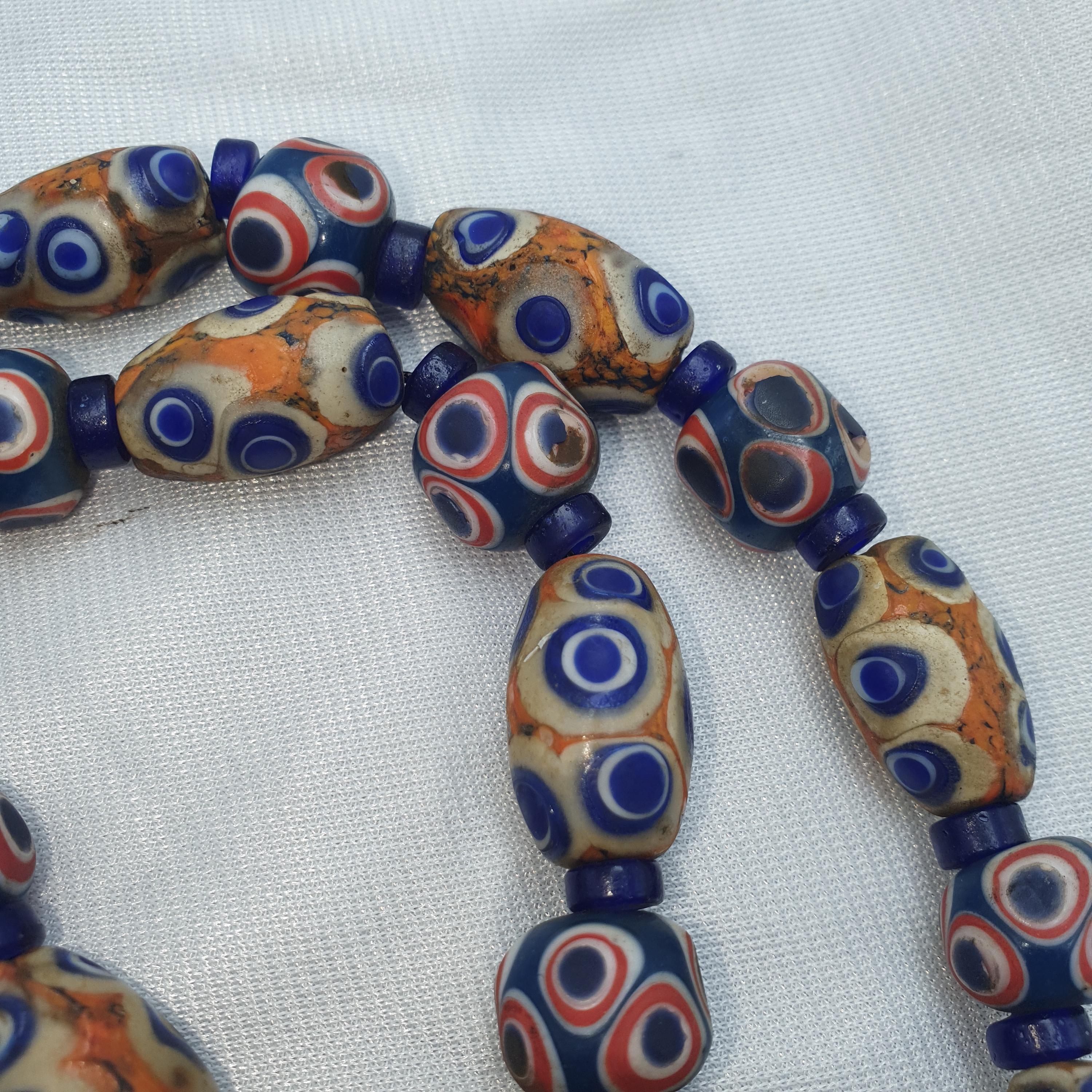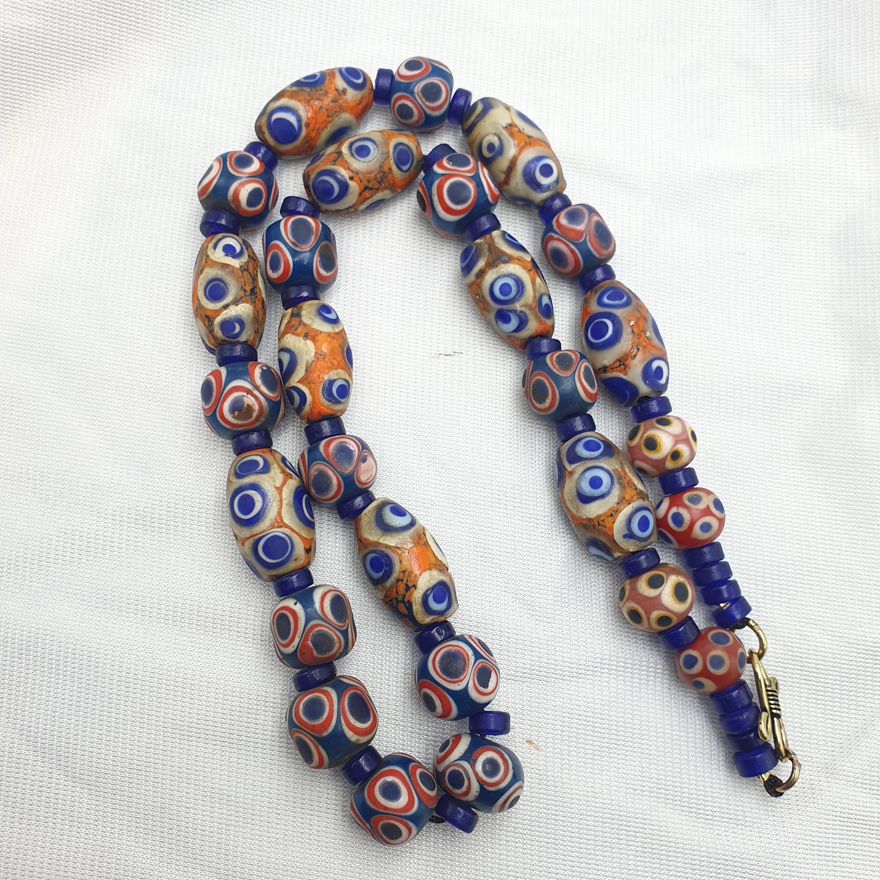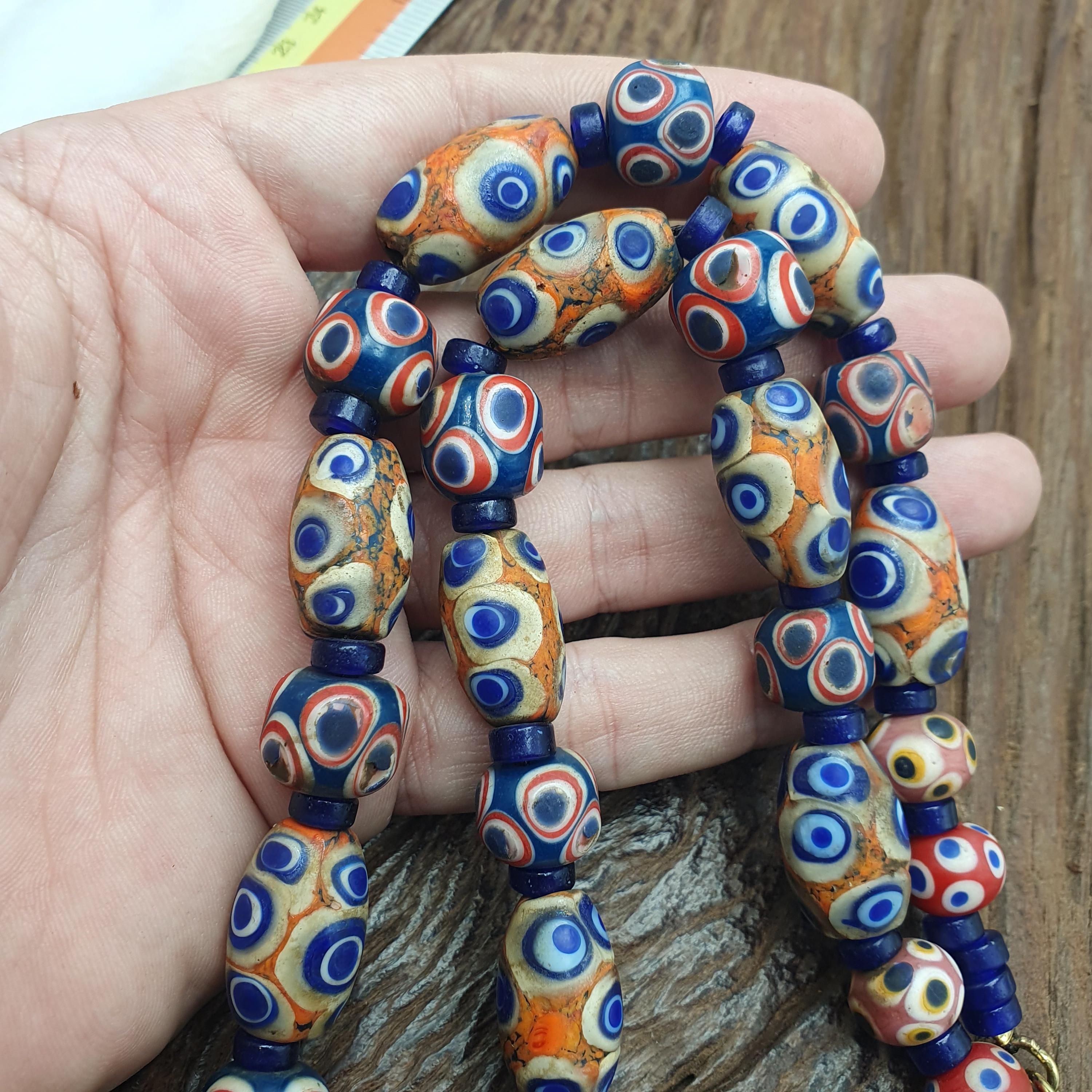 Discover the timeless elegance of our Venetian Style Hundred Eyes Skunk Beads Necklace, a stunning statement piece measuring 22 inches long with 10mm beads that beautifully showcase intricate craftsmanship. Crafted from vibrant glass, this vintage-inspired necklace features distinctive black skunk trade beads, also known as hundred eyes skunk beads, renowned for their unique dot pattern resembling tiny eyes — a true collector’s delight!