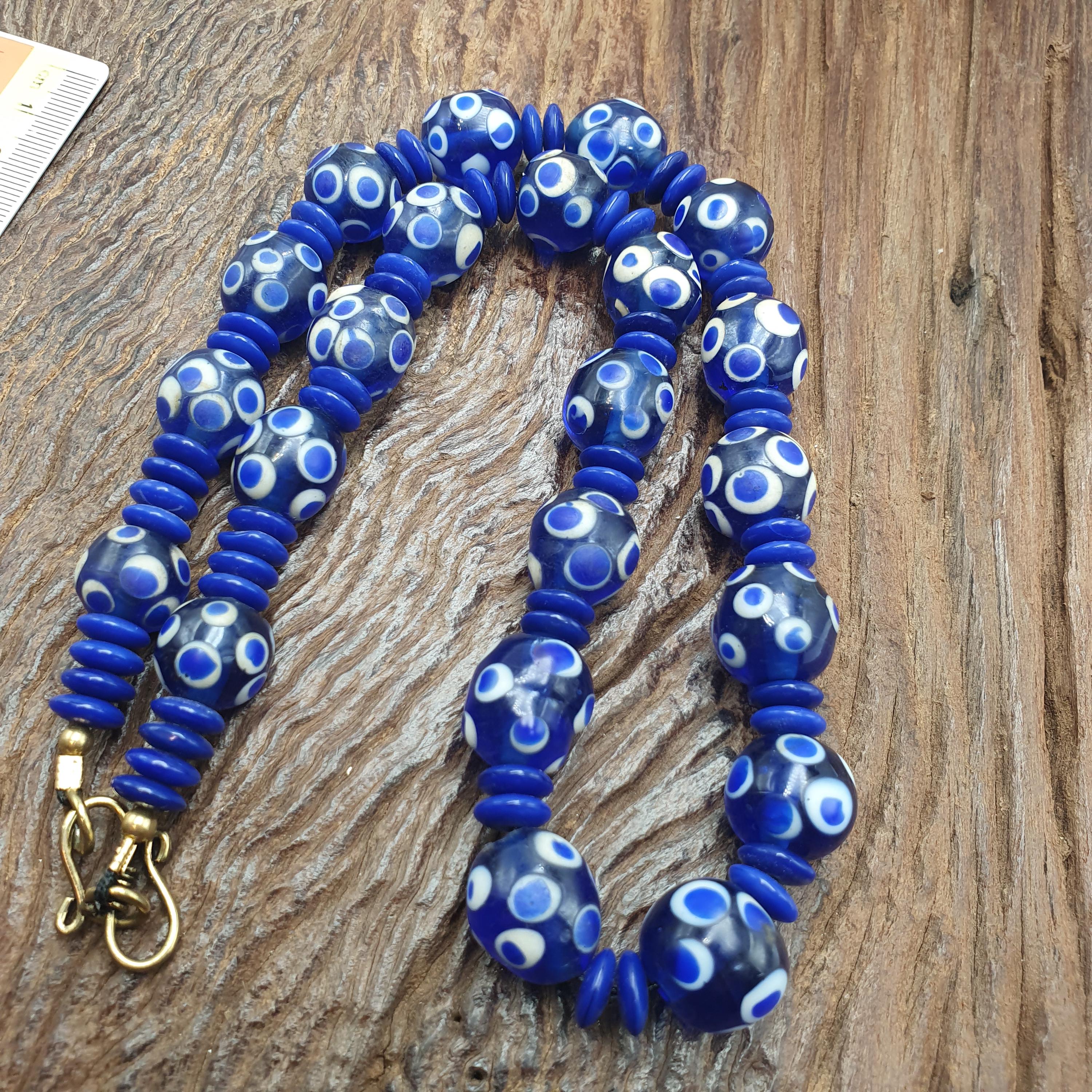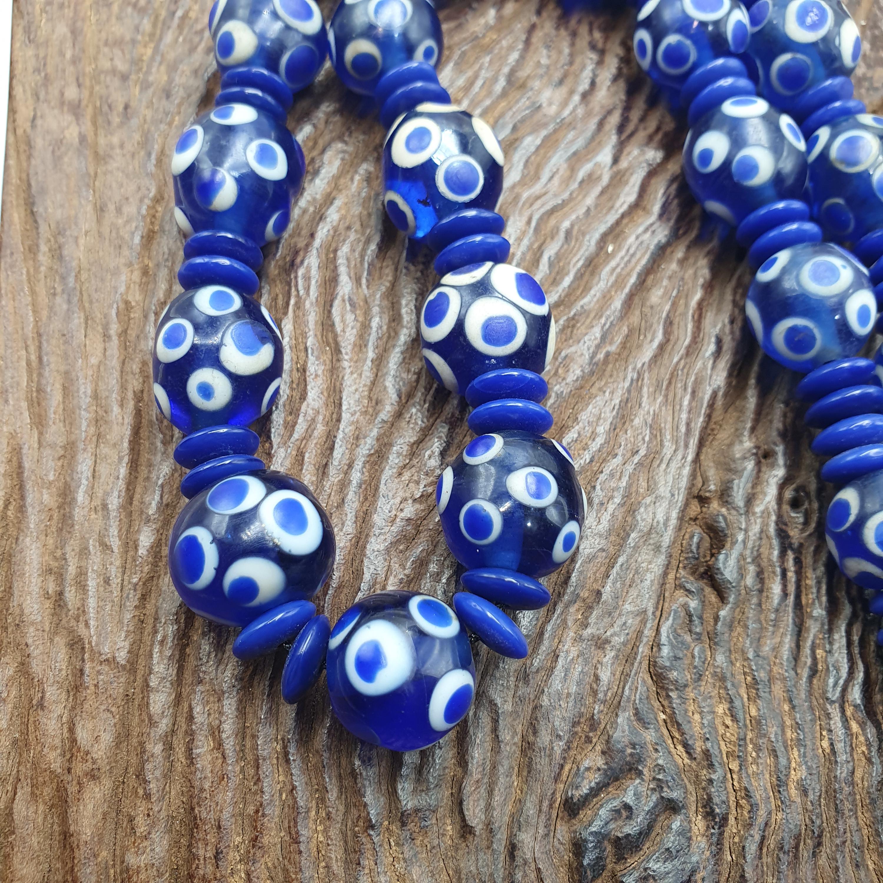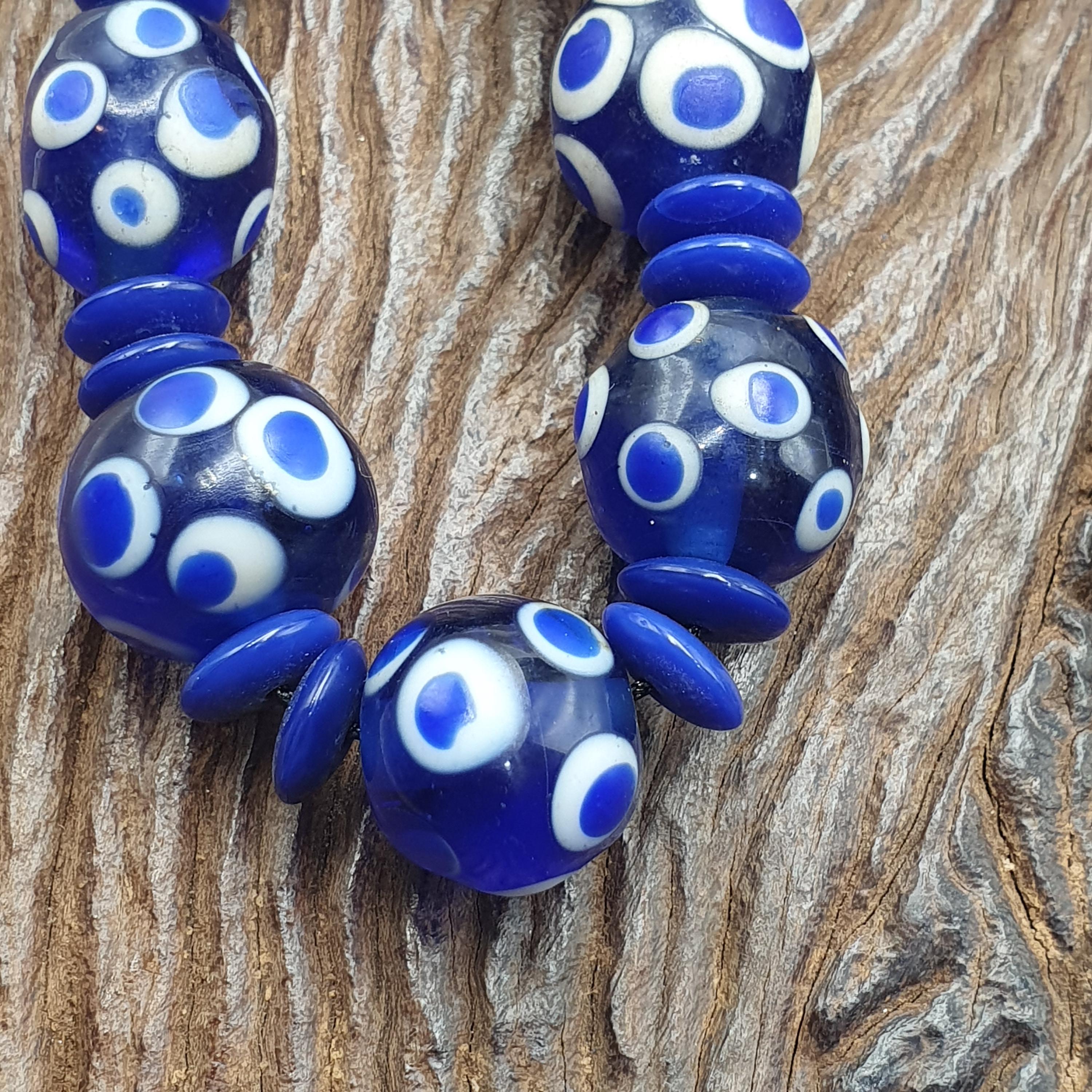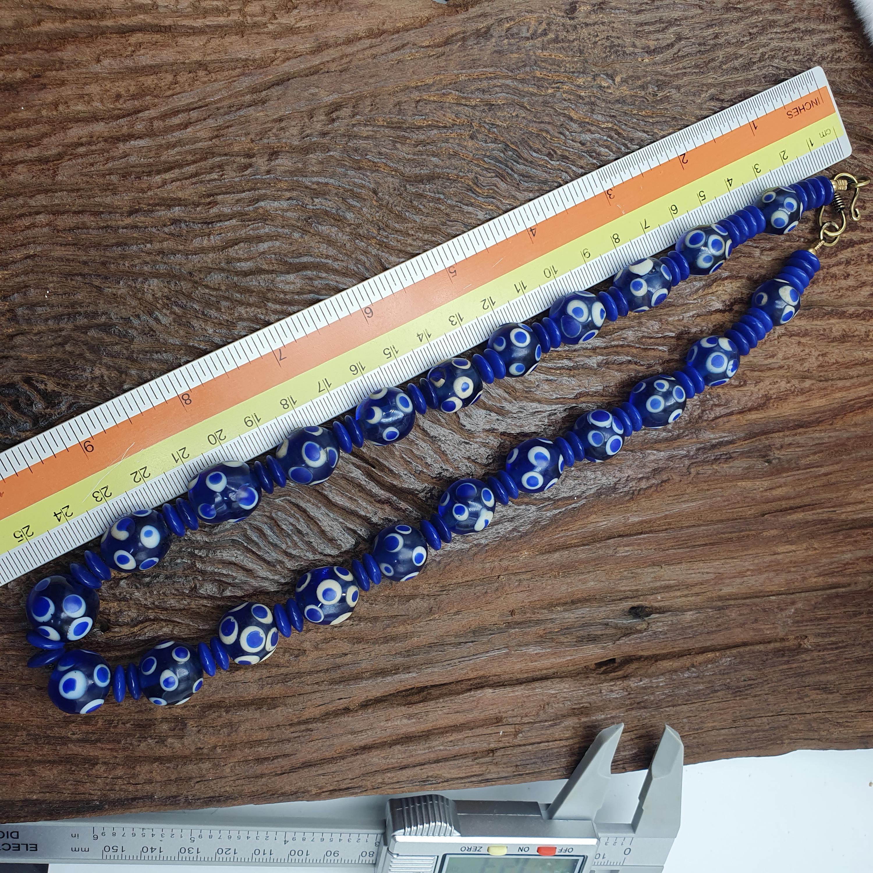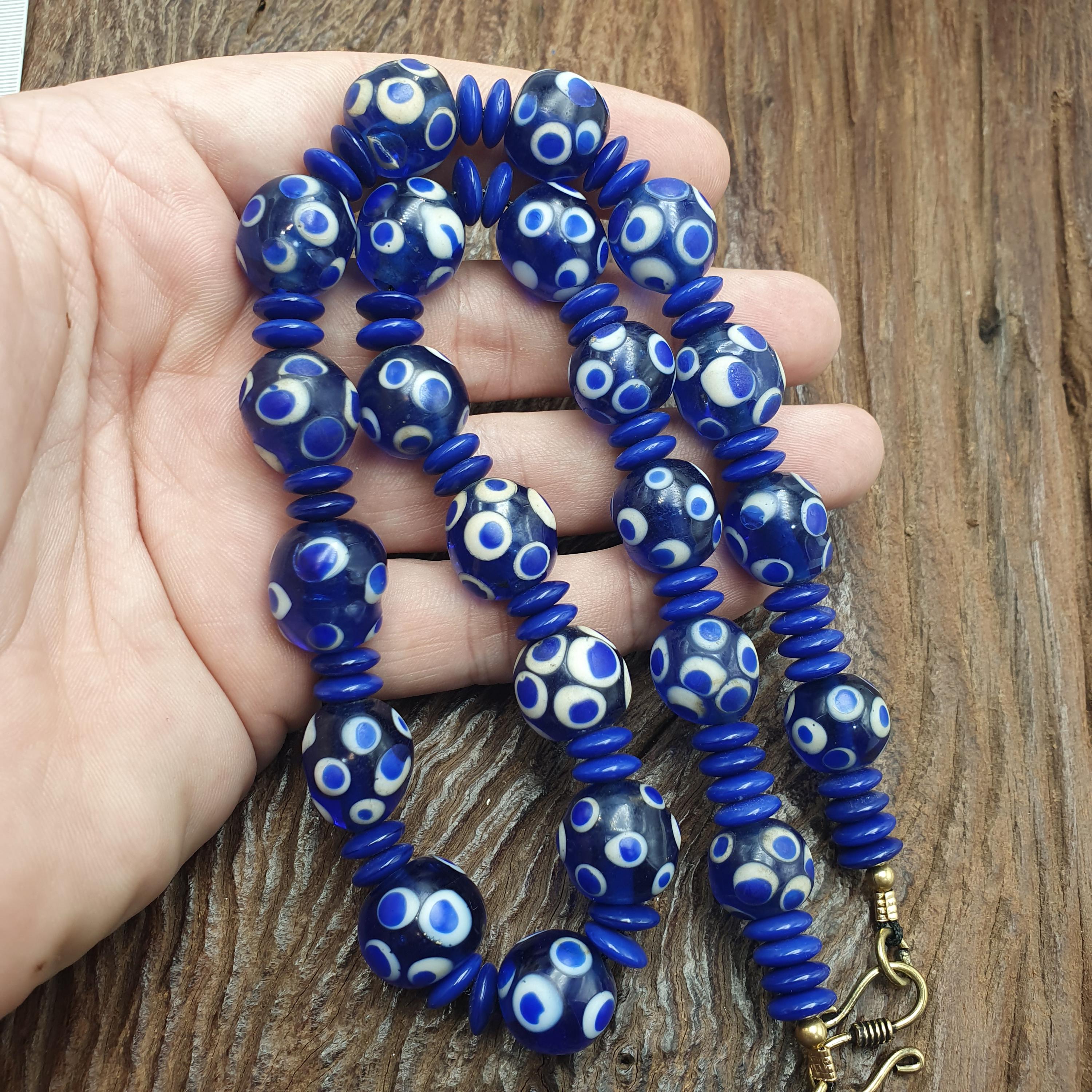 Discover the bold charm of this Venetian Style Blue Polka Dot Beads Vintage Skunk Beads Necklace, a stunning statement piece that combines vintage glass craftsmanship with modern boho chic flair. Measuring 14mm for the beads and 22 inches in length, this handmade beaded jewelry piece is perfect for layering or making a standout impression on its own.