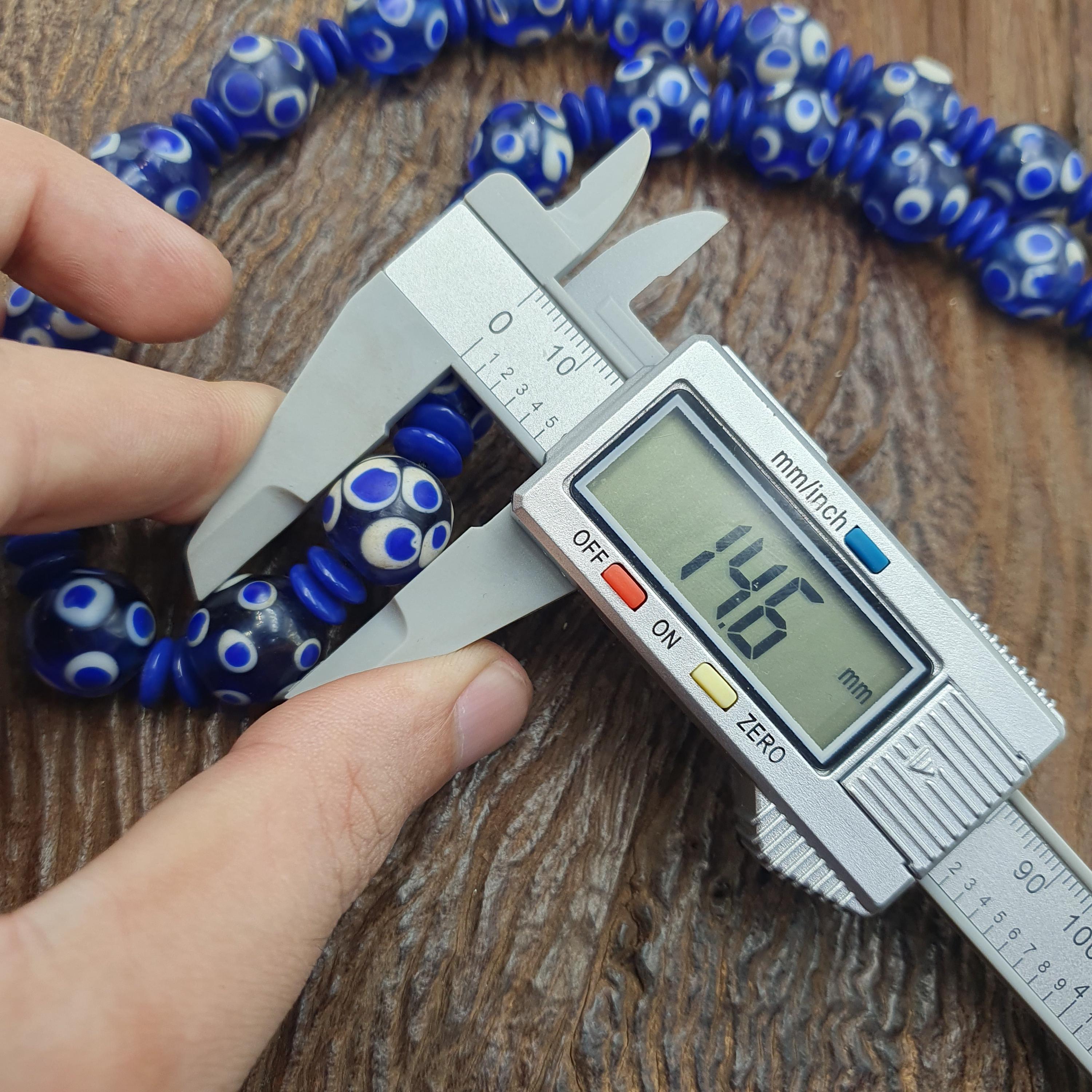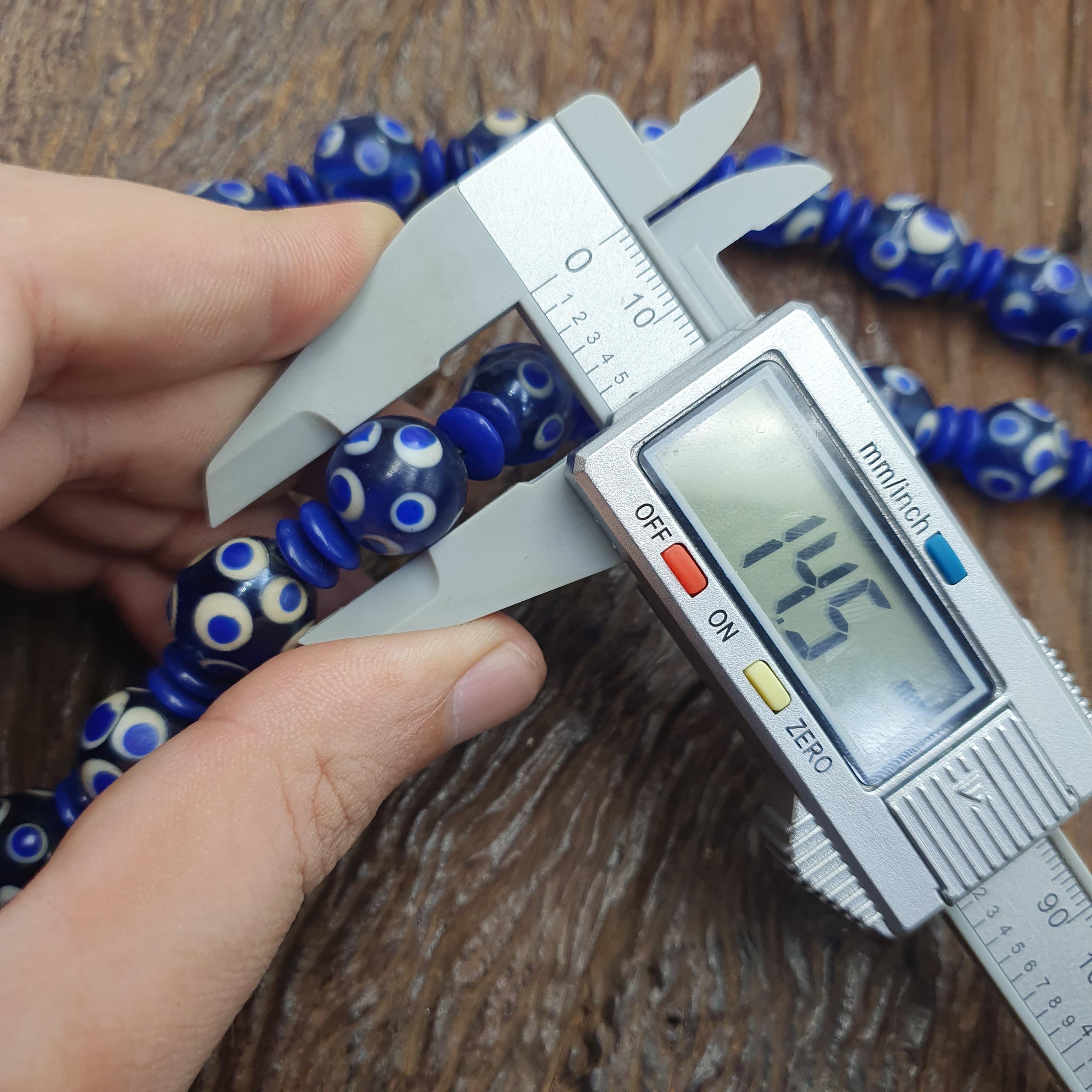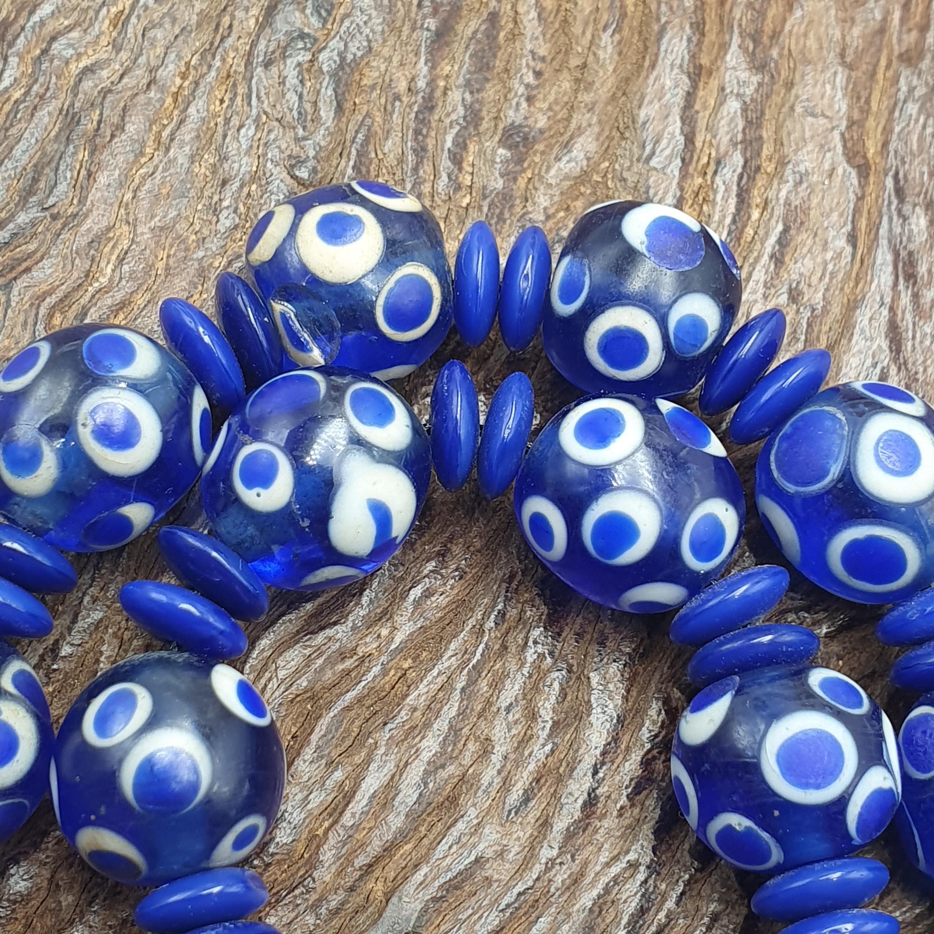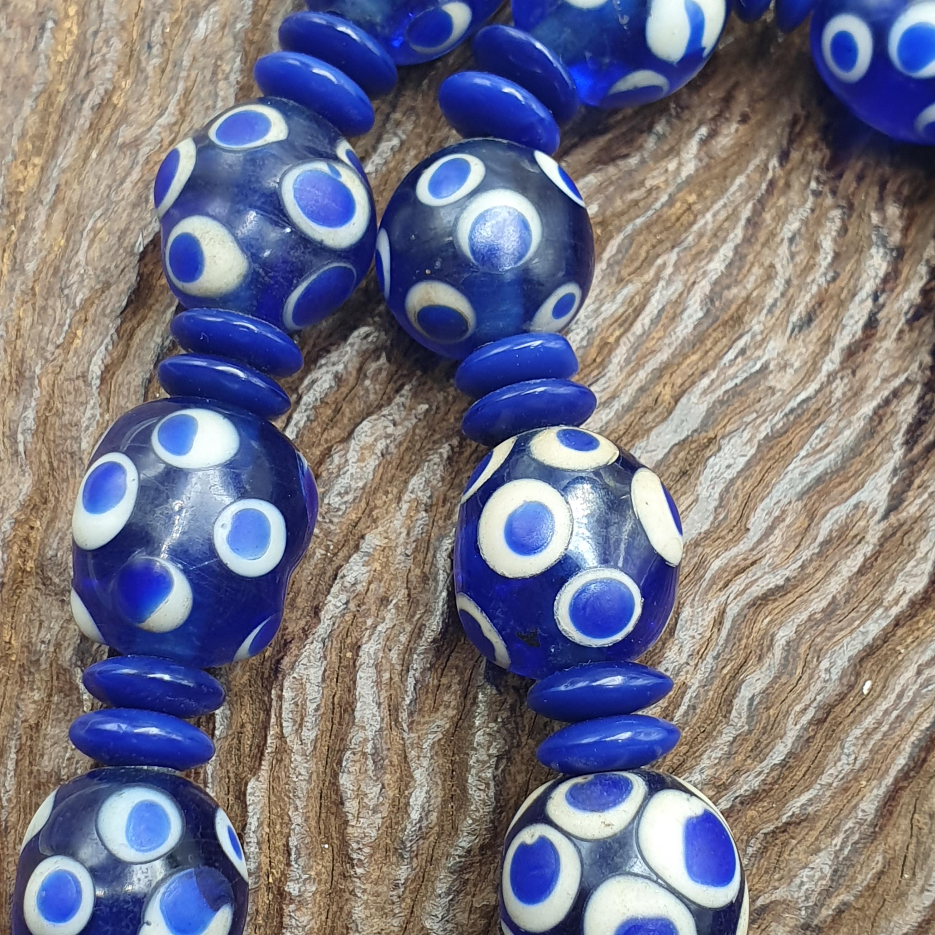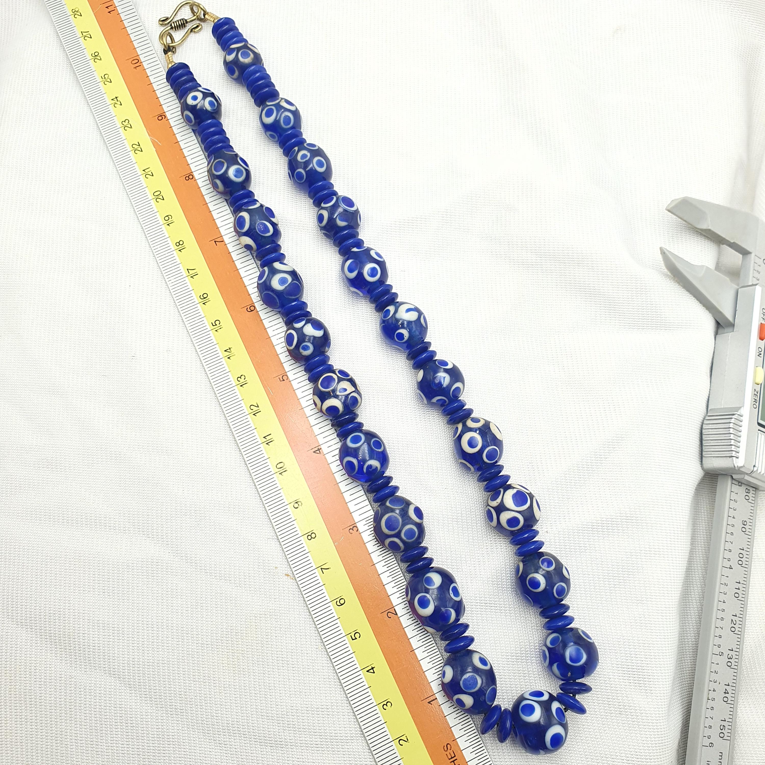 Discover the bold charm of this Venetian Style Blue Polka Dot Beads Vintage Skunk Beads Necklace, a stunning statement piece that combines vintage glass craftsmanship with modern boho chic flair. Measuring 14mm for the beads and 22 inches in length, this handmade beaded jewelry piece is perfect for layering or making a standout impression on its own.