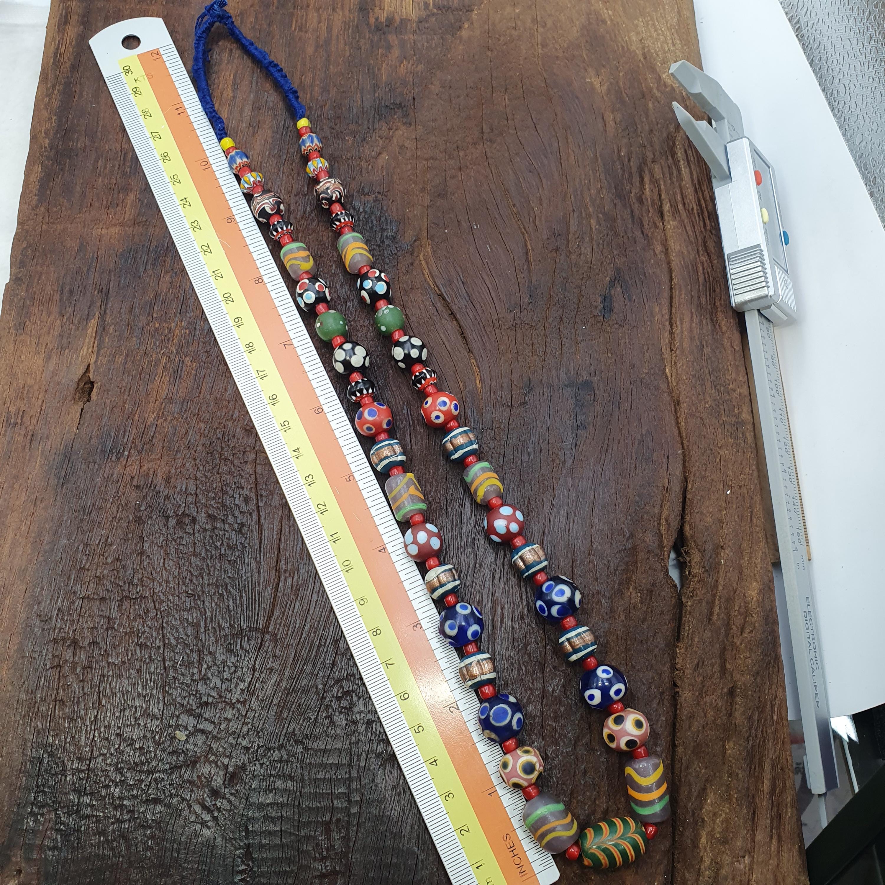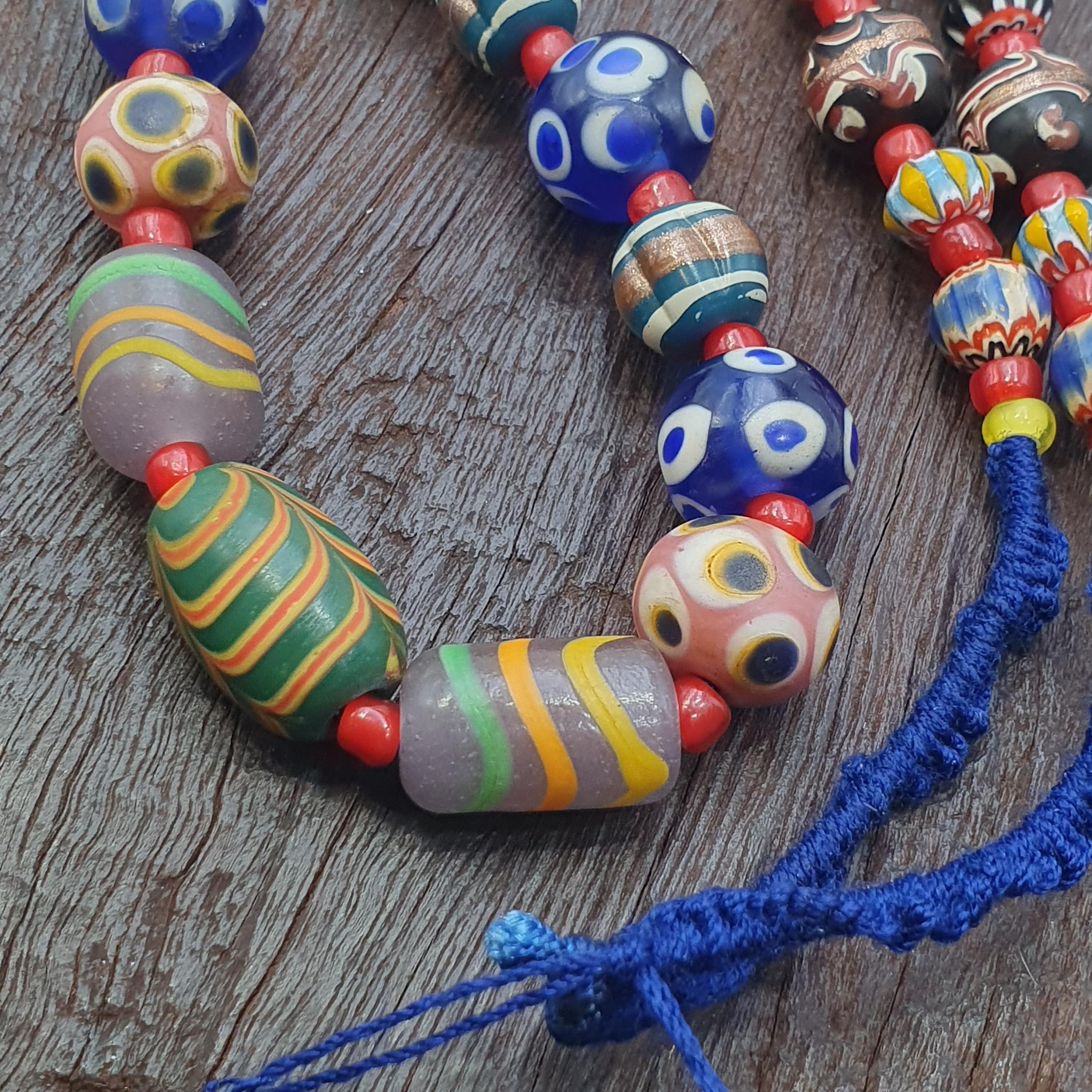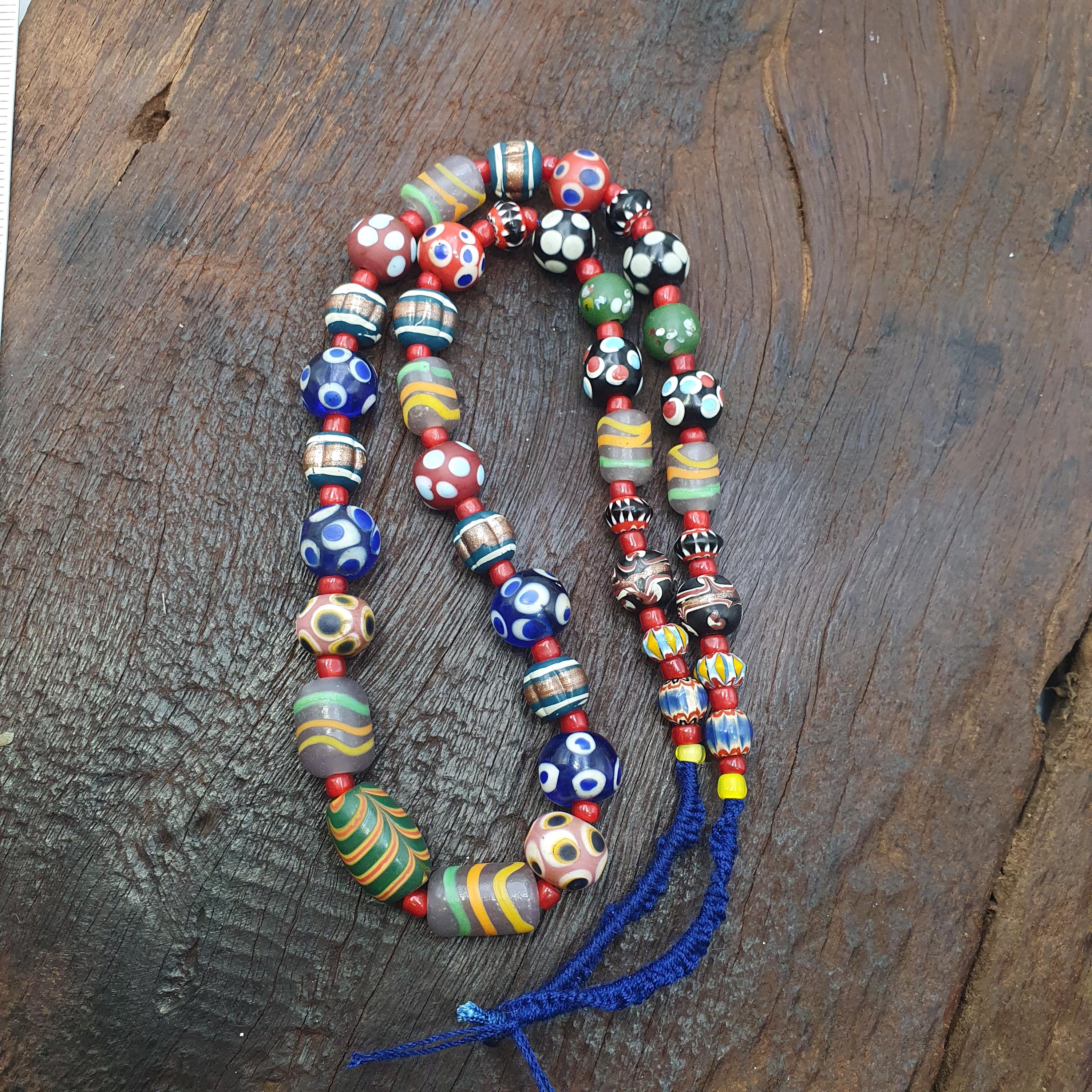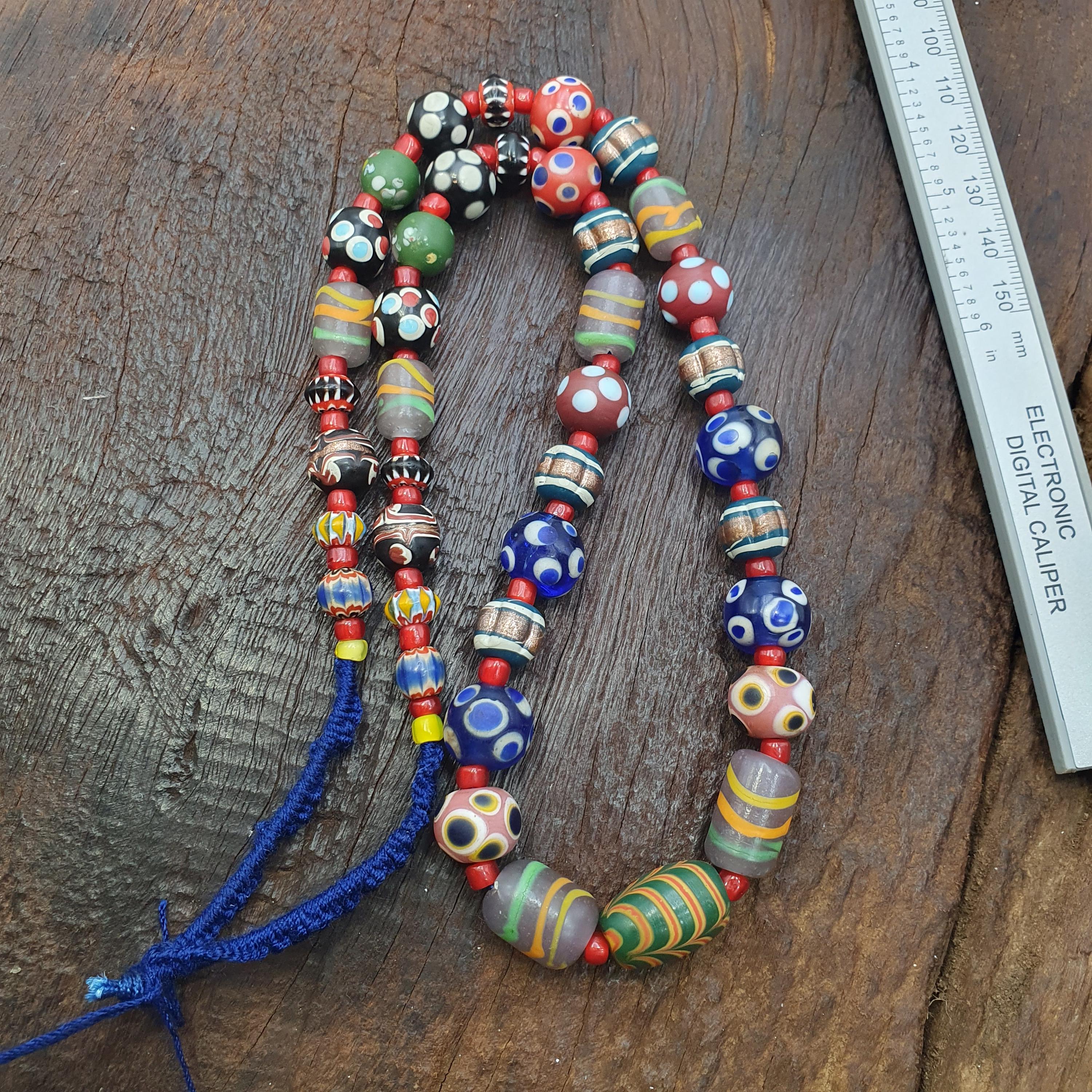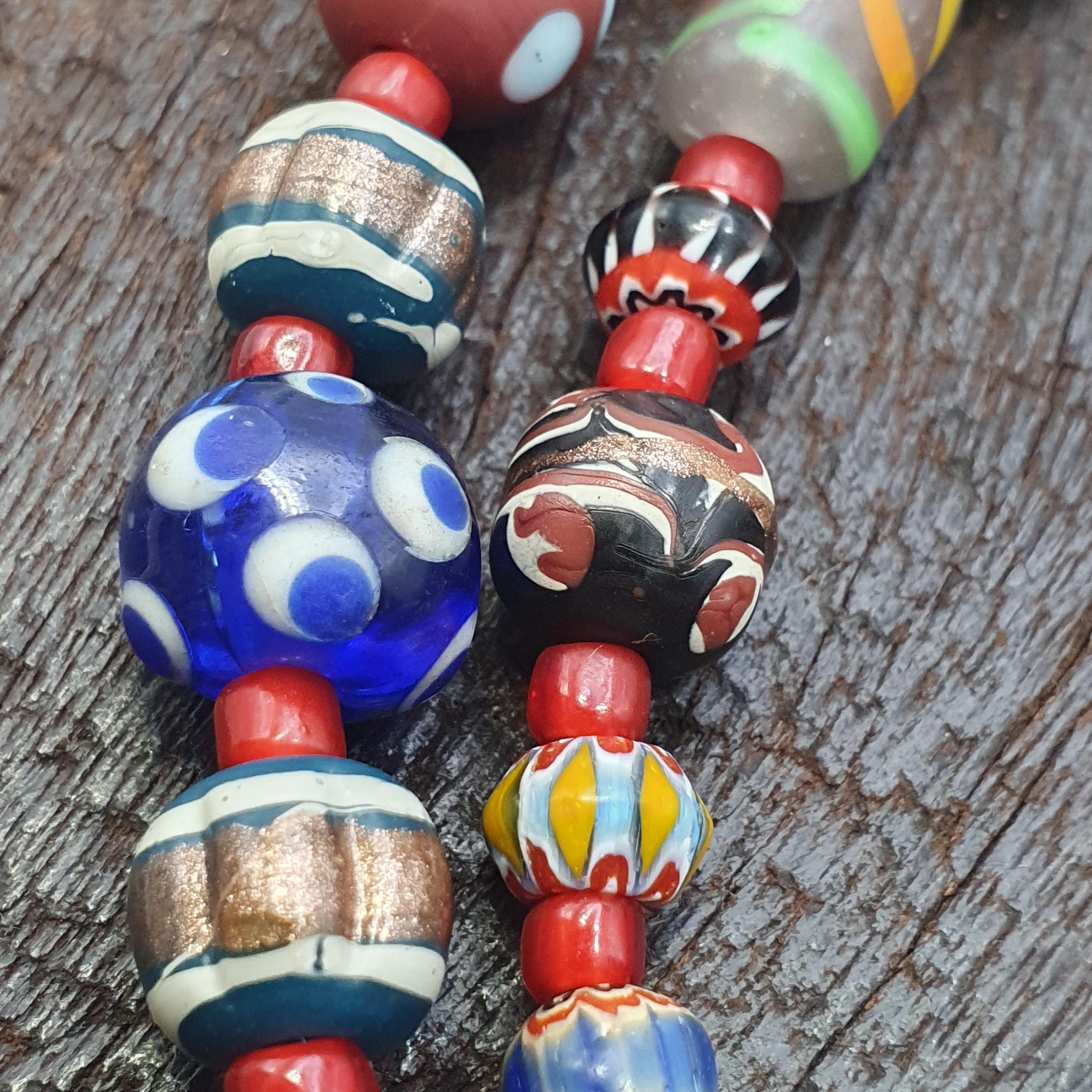 Discover the captivating charm of our Venetian Style Mix Pattern Beads Necklace, a stunning statement jewelry piece that measures 26 inches long. Crafted by hand from vibrant vintage glass, this unique beaded necklace features intricate black skunk trade beads, also known as hundred eyes skunk beads, renowned for their eye-catching dot pattern that resembles tiny eyes — a true collector’s delight!