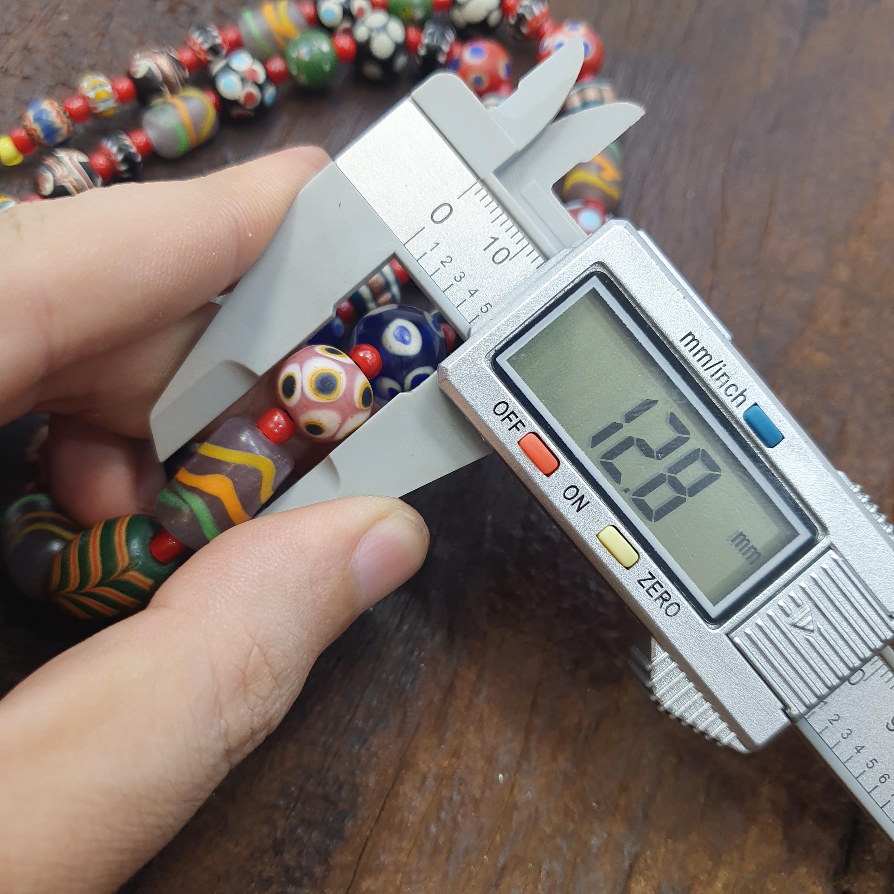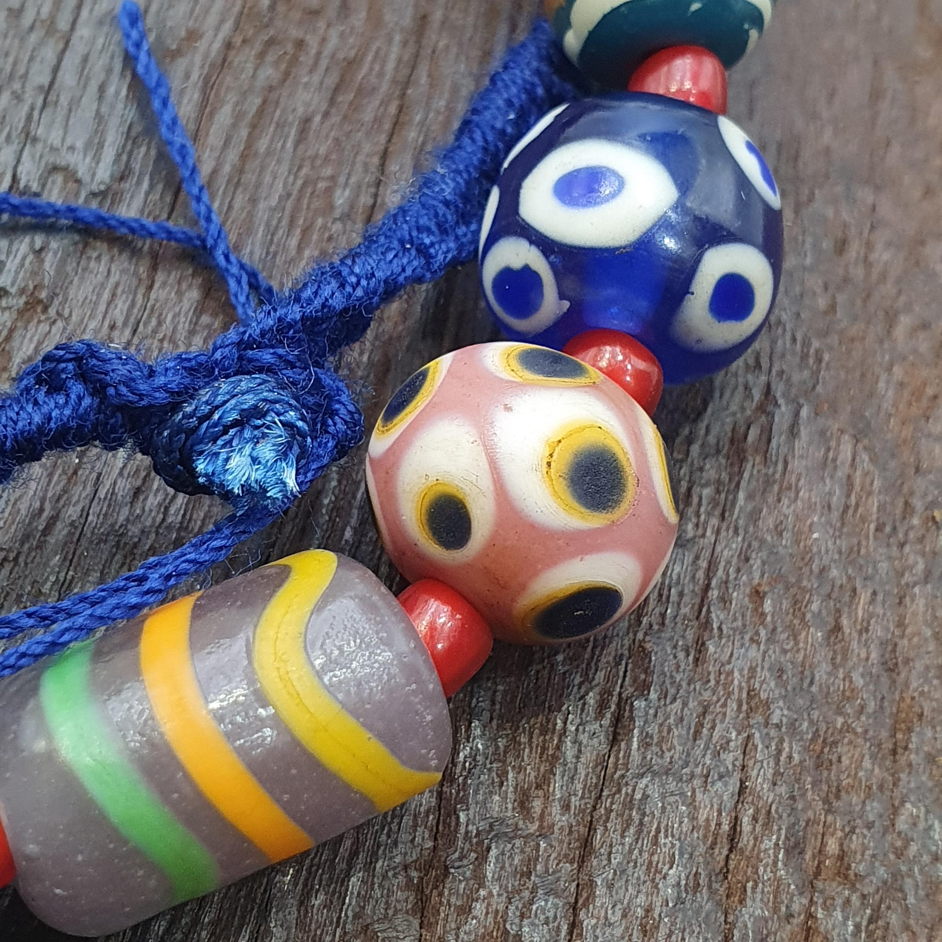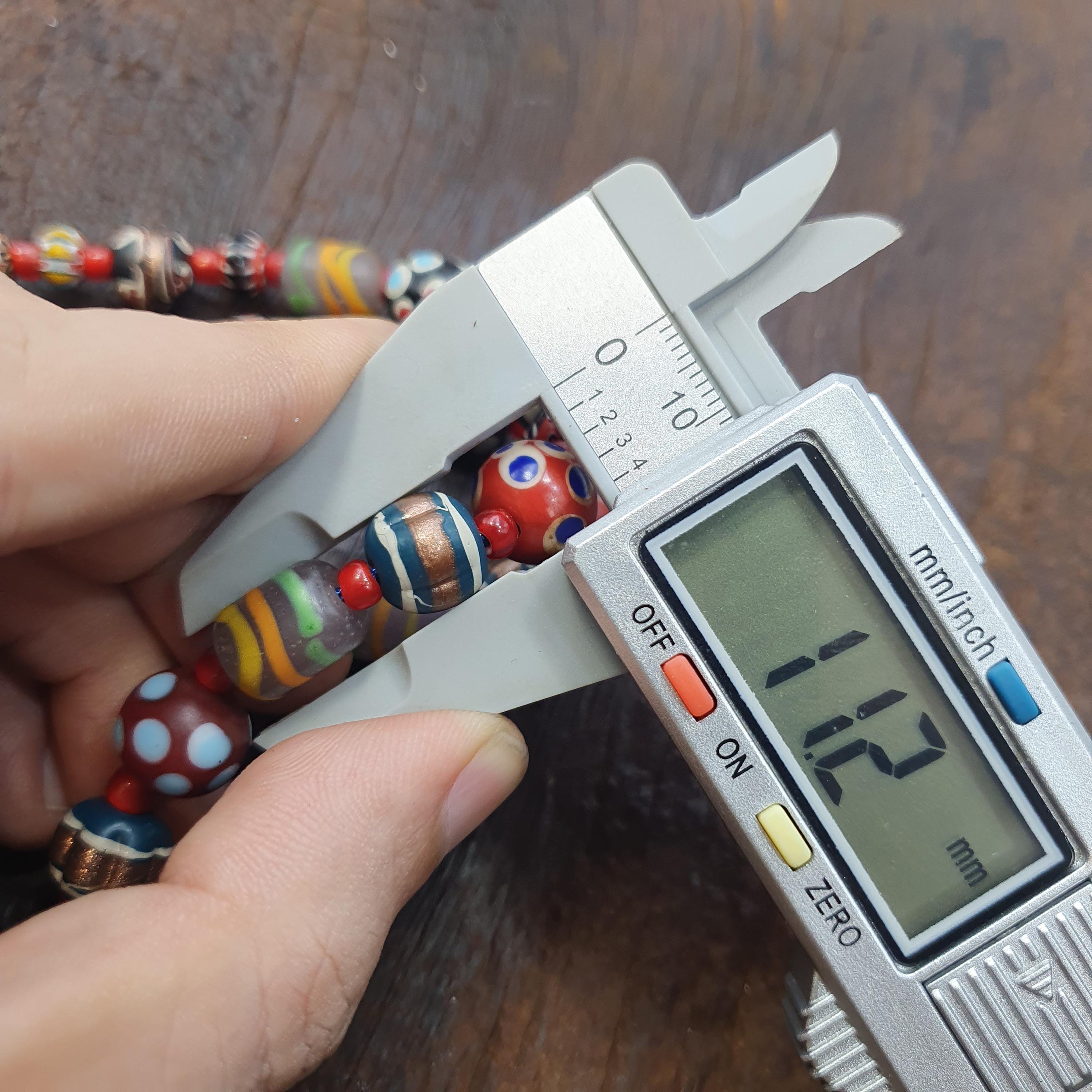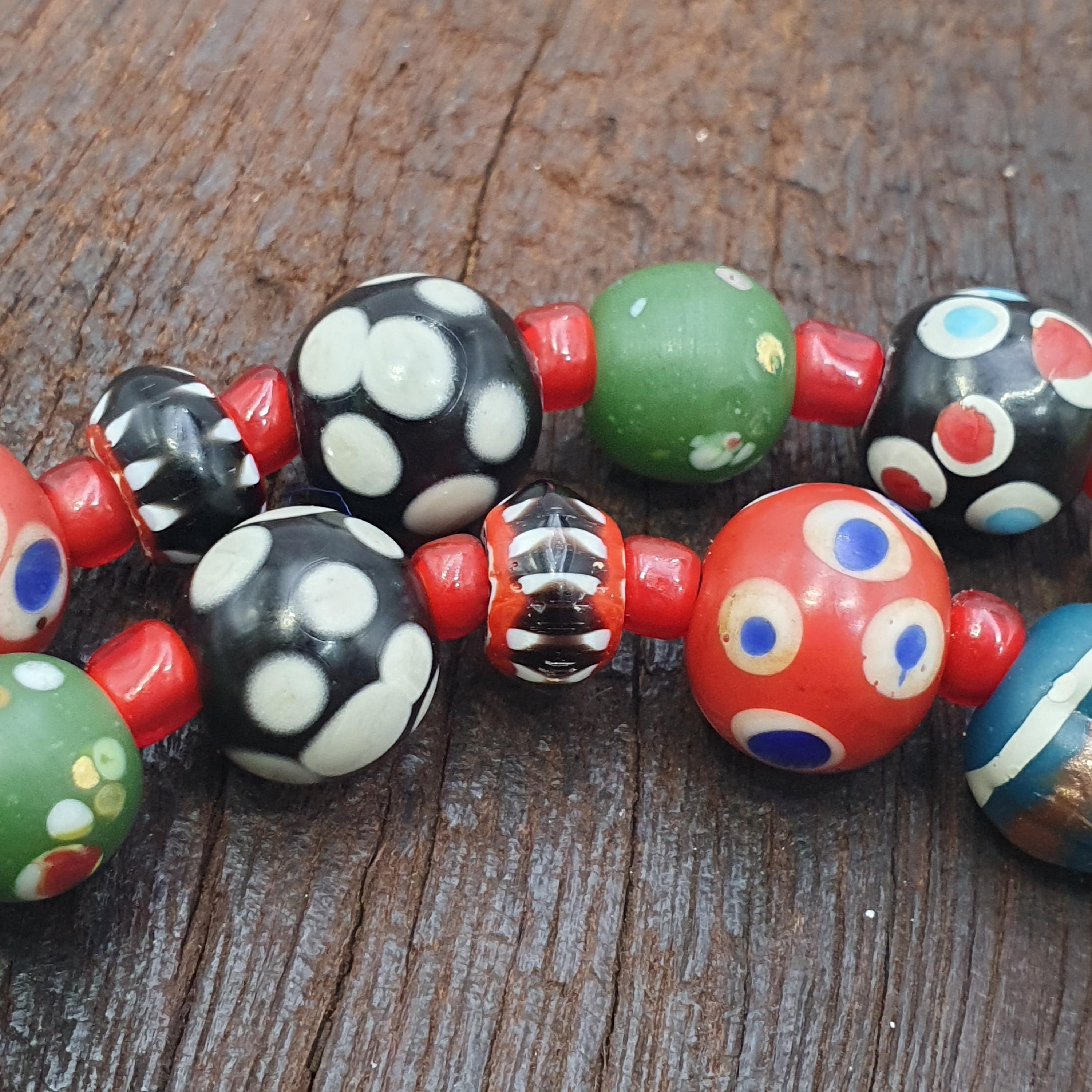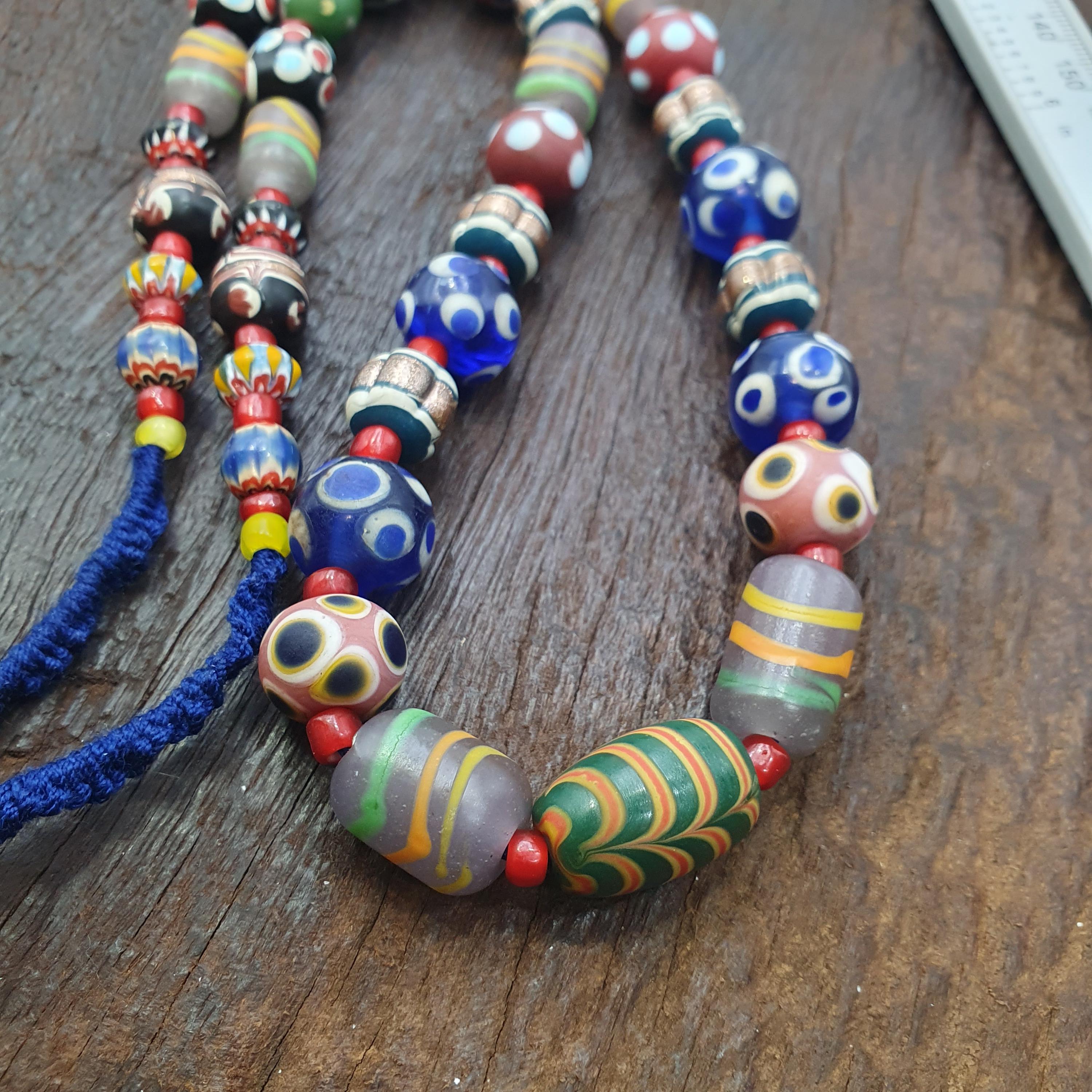 Discover the captivating charm of our Venetian Style Mix Pattern Beads Necklace, a stunning statement jewelry piece that measures 26 inches long. Crafted by hand from vibrant vintage glass, this unique beaded necklace features intricate black skunk trade beads, also known as hundred eyes skunk beads, renowned for their eye-catching dot pattern that resembles tiny eyes — a true collector’s delight!