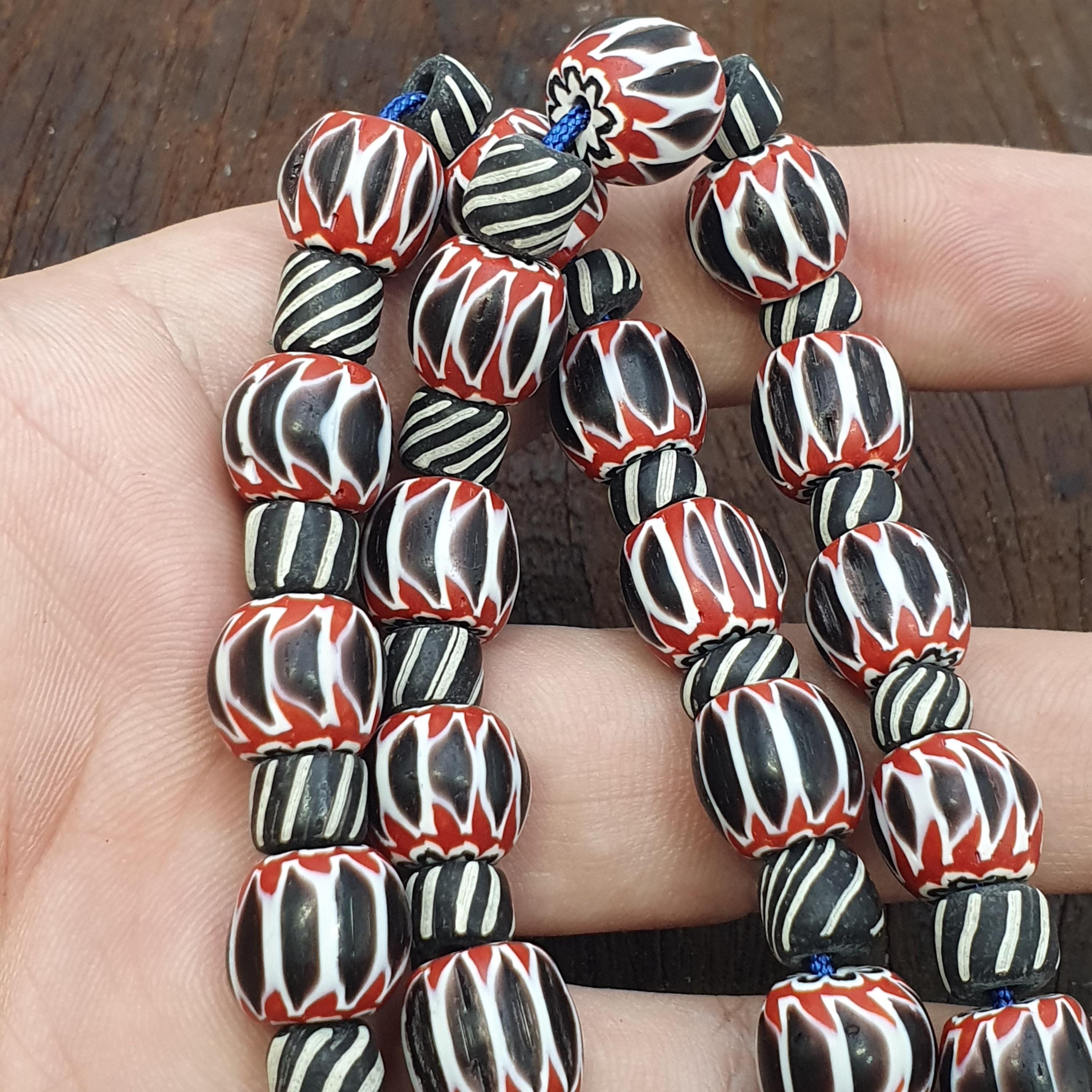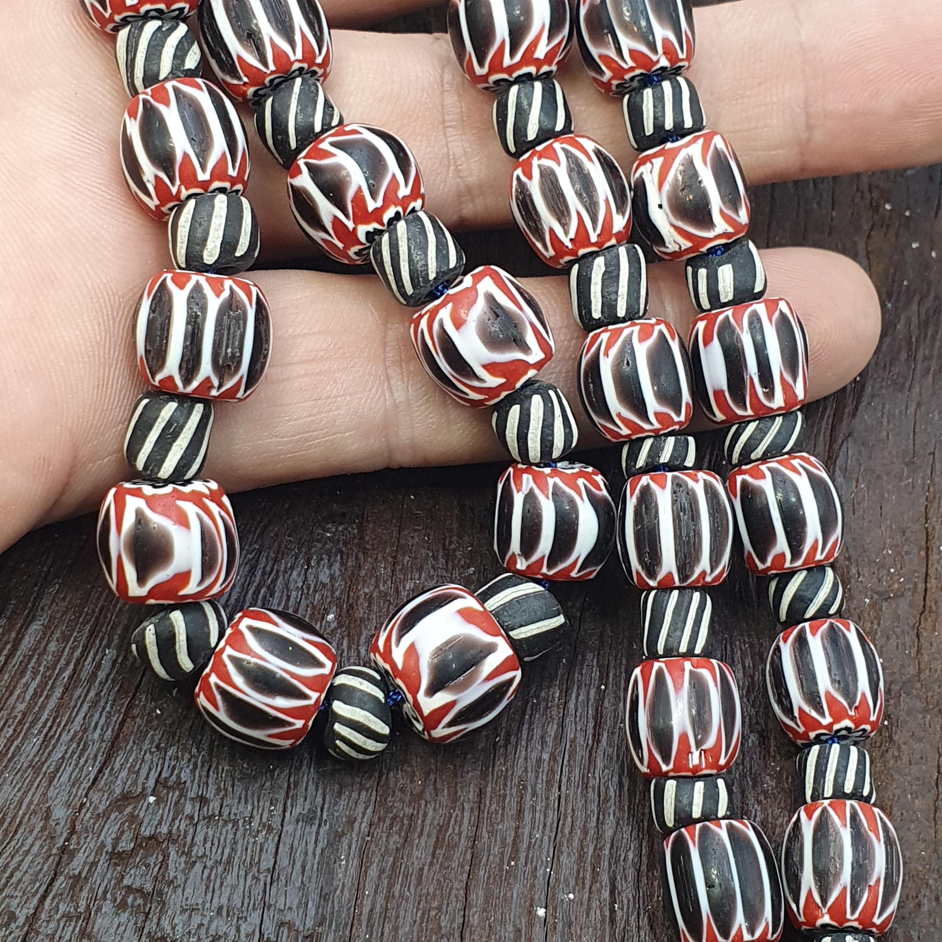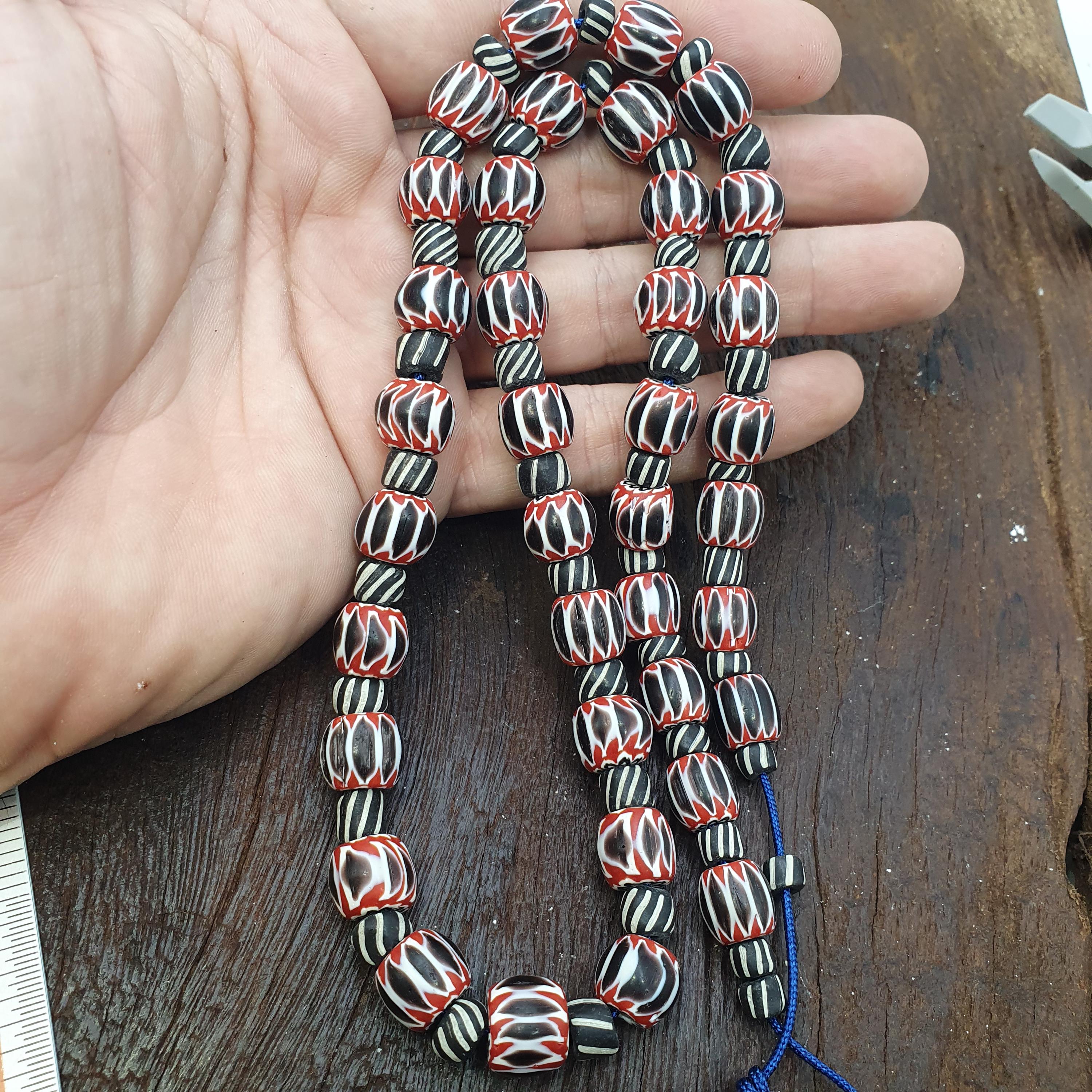 Discover timeless elegance with this Vintage Venetian Style Chevron & Black Striped Glass Beads Strands necklace, measuring approximately 25 inches long. Perfect for adding a touch of artisanal charm to your everyday or special occasion look, this handcrafted jewelry piece embodies boho chic and ethnic inspiration with its striking vintage trade beads and retro jewel tone palette.