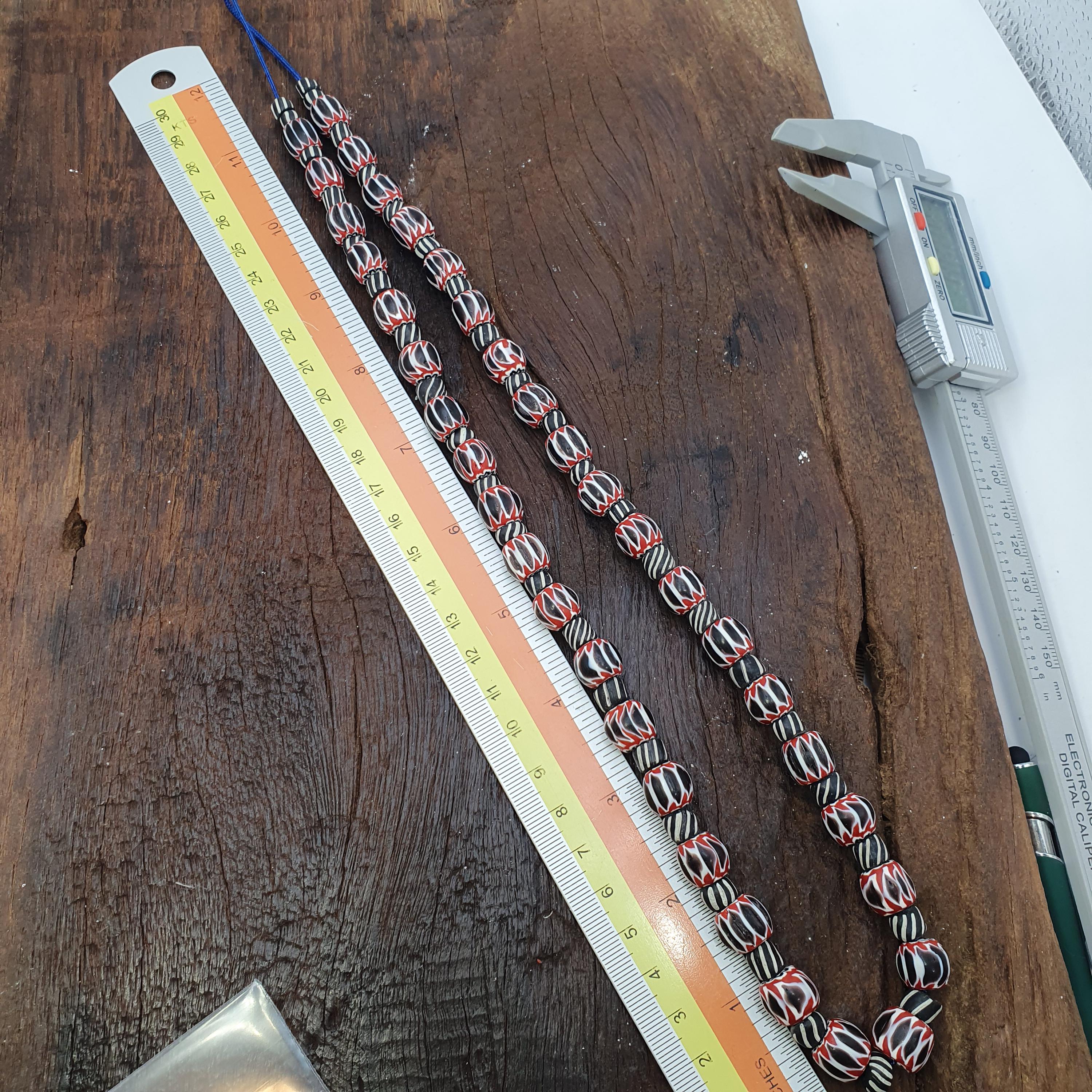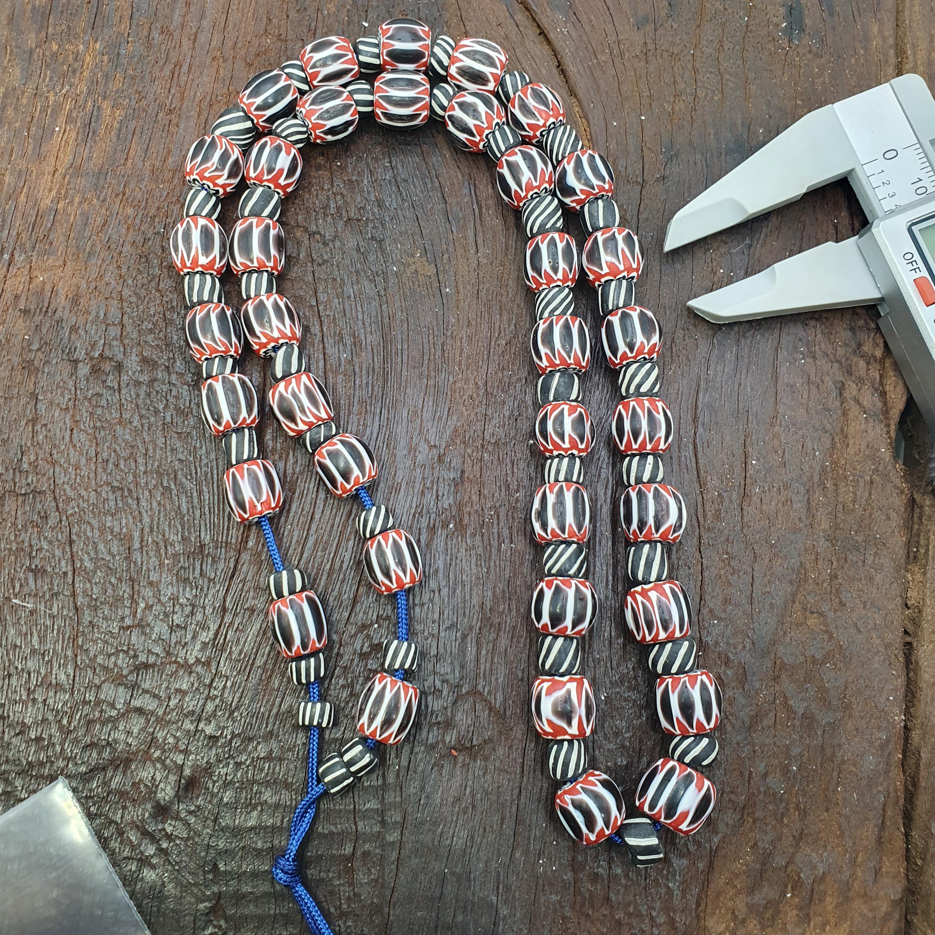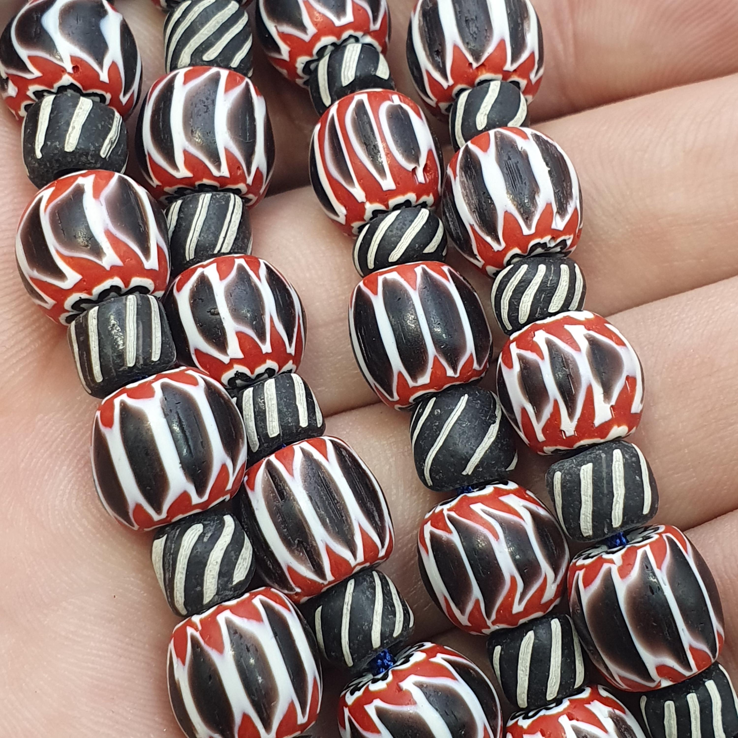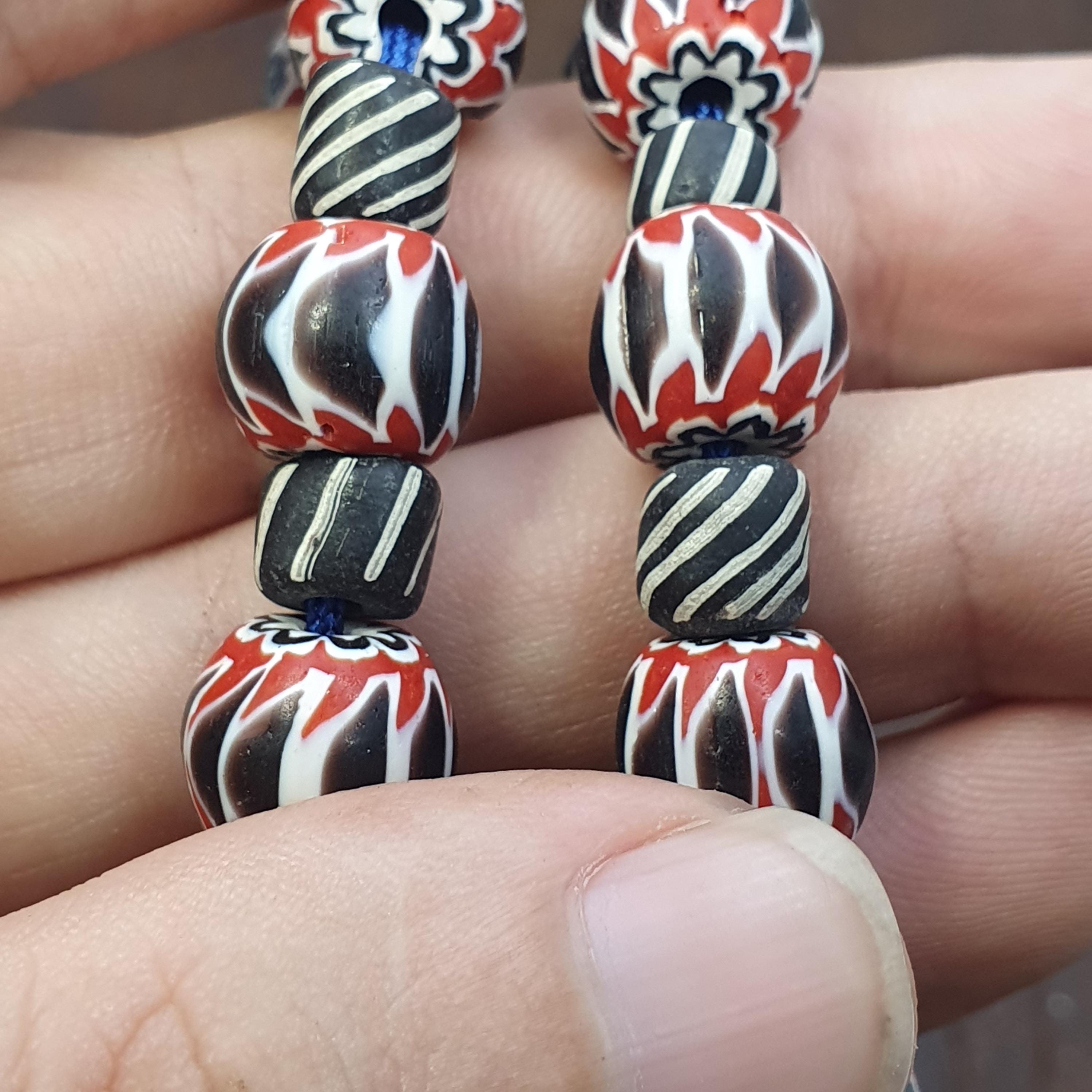 Discover timeless elegance with this Vintage Venetian Style Chevron & Black Striped Glass Beads Strands necklace, measuring approximately 25 inches long. Perfect for adding a touch of artisanal charm to your everyday or special occasion look, this handcrafted jewelry piece embodies boho chic and ethnic inspiration with its striking vintage trade beads and retro jewel tone palette.