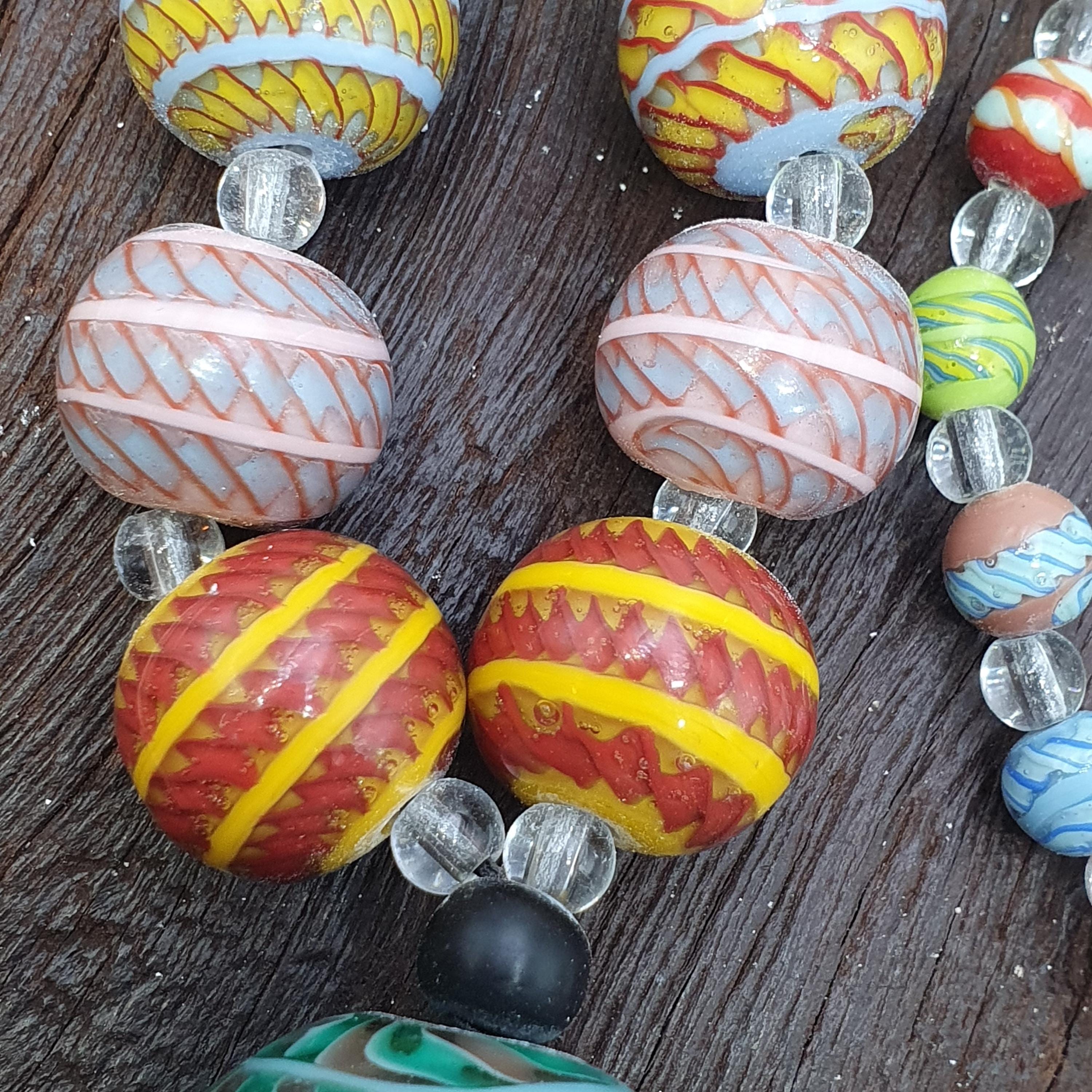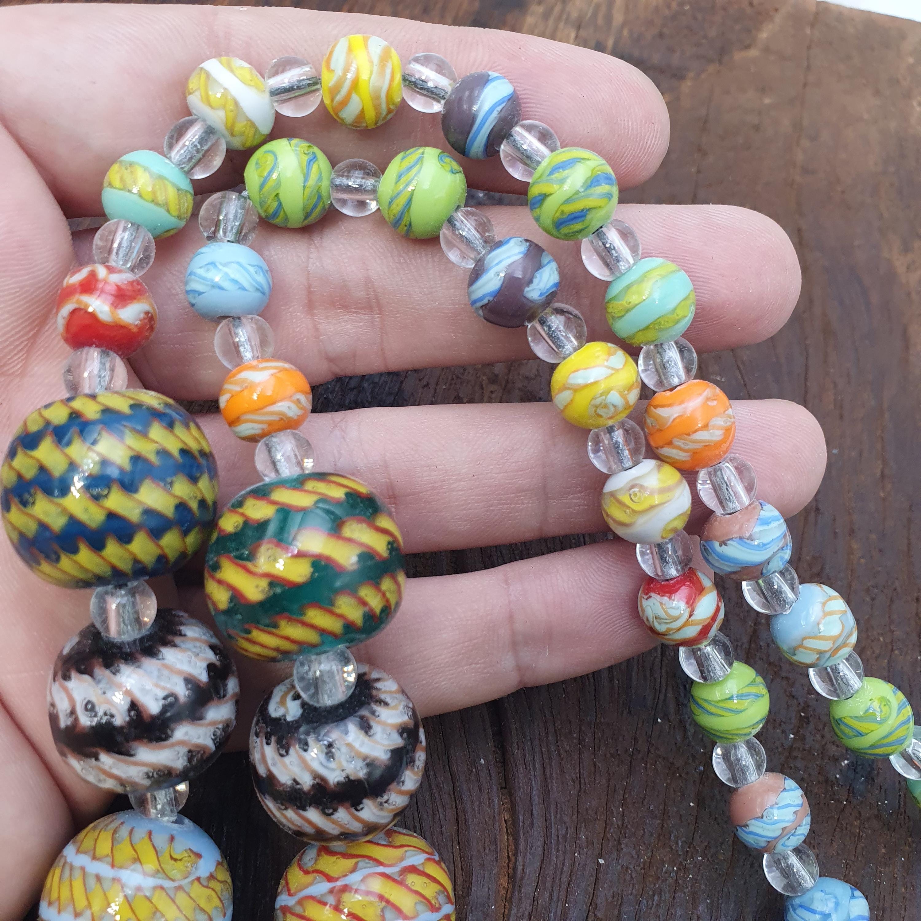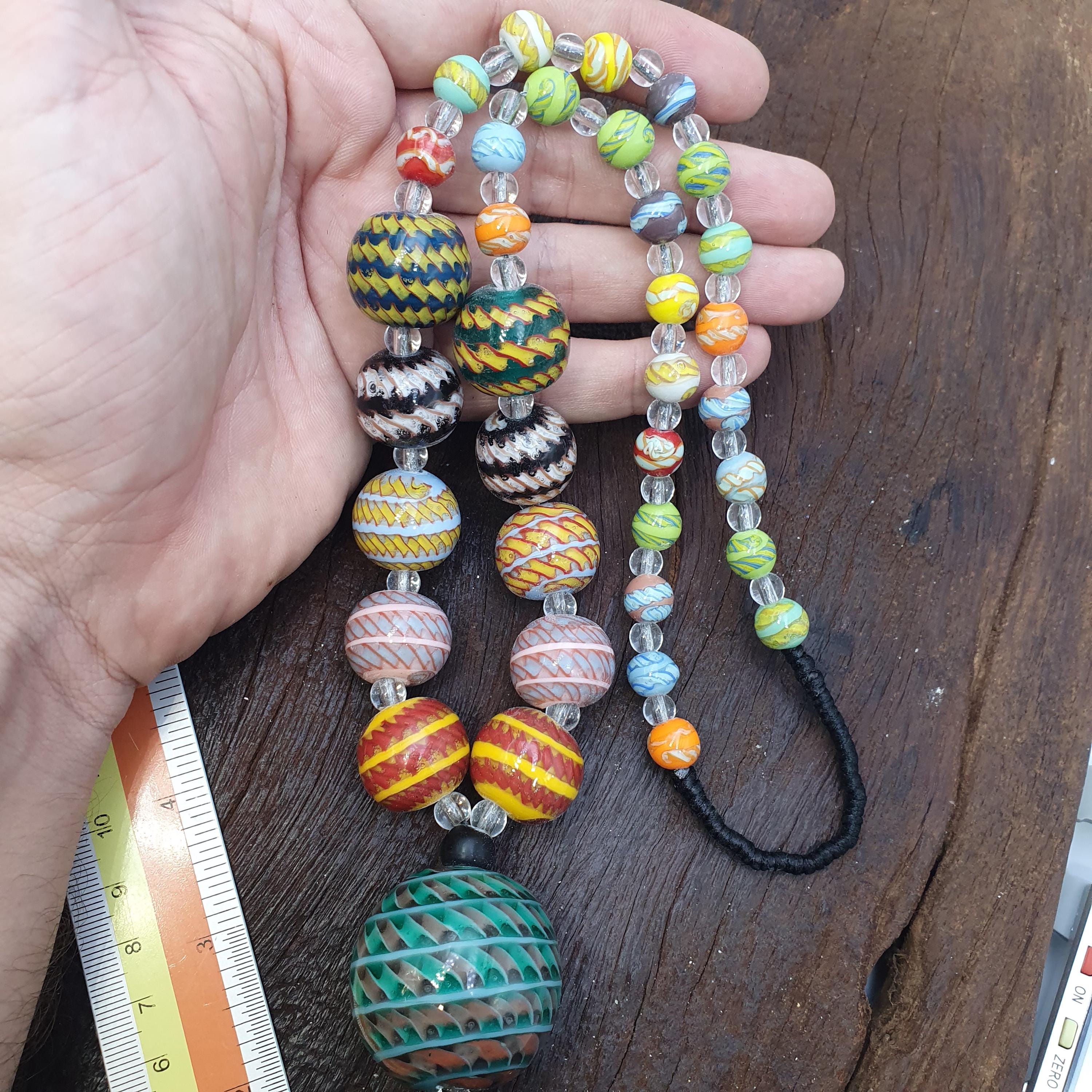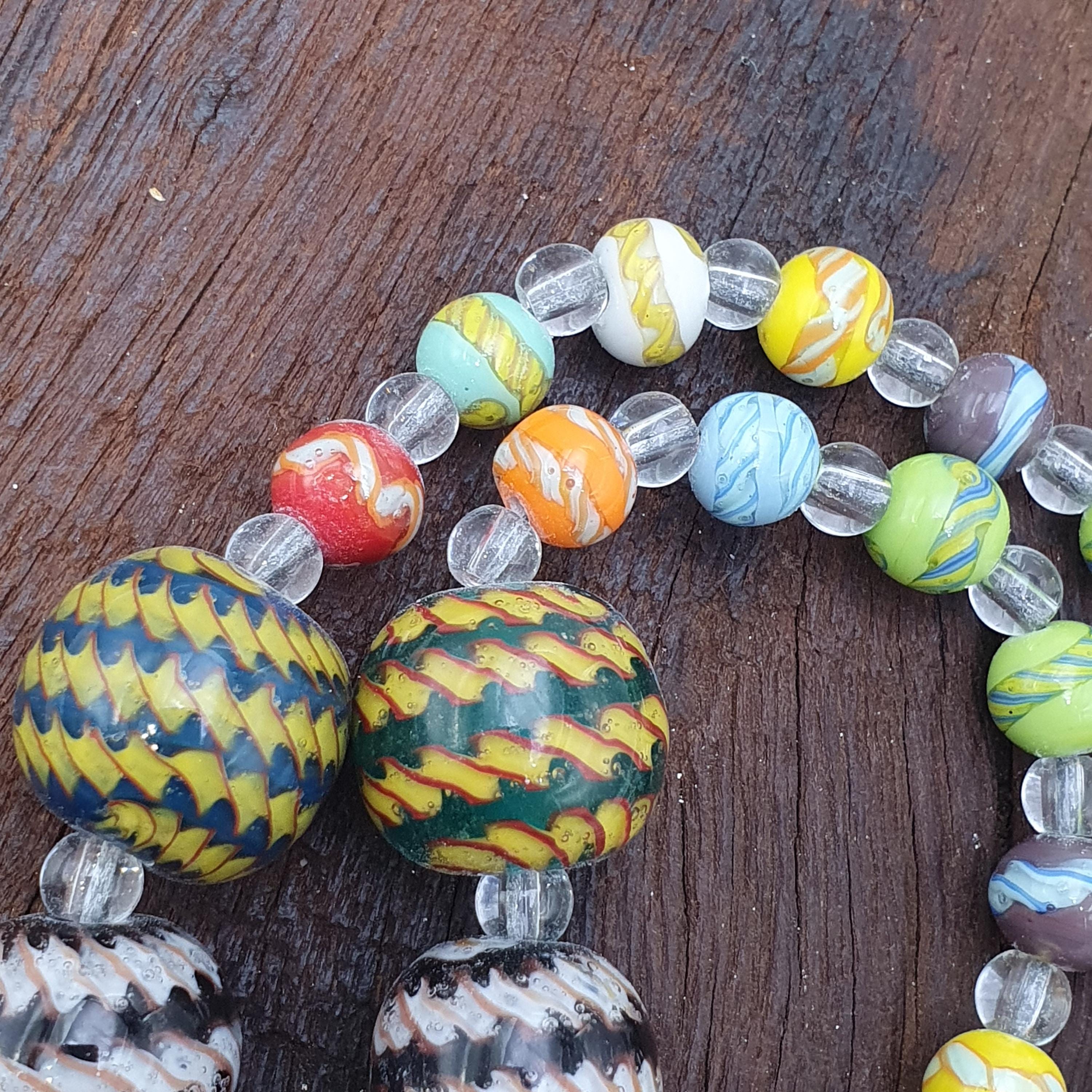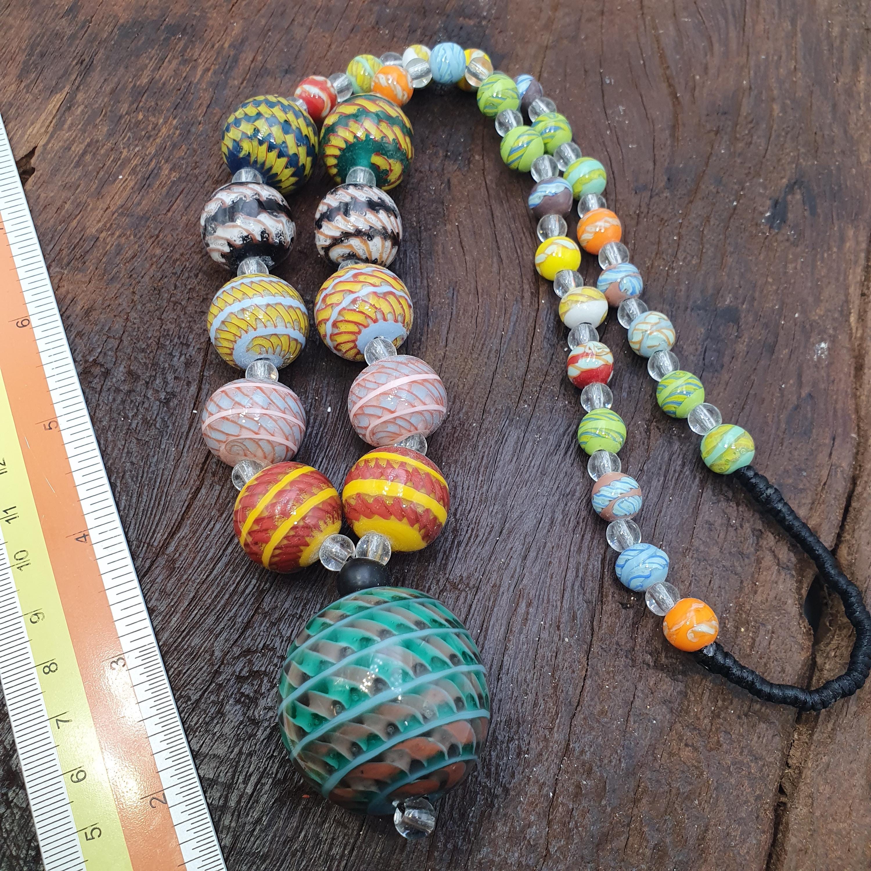 Crafted with attention to detail, each bead showcases colorful, intricate patterns reminiscent of traditional Venetian glass artistry. The standout large bead pendant adds a bold focal point, while the array of smaller, lively beads creates a playful yet sophisticated look. Whether you're dressing up for a special occasion or adding a touch of vintage flair to everyday wear, this necklace is a versatile choice.