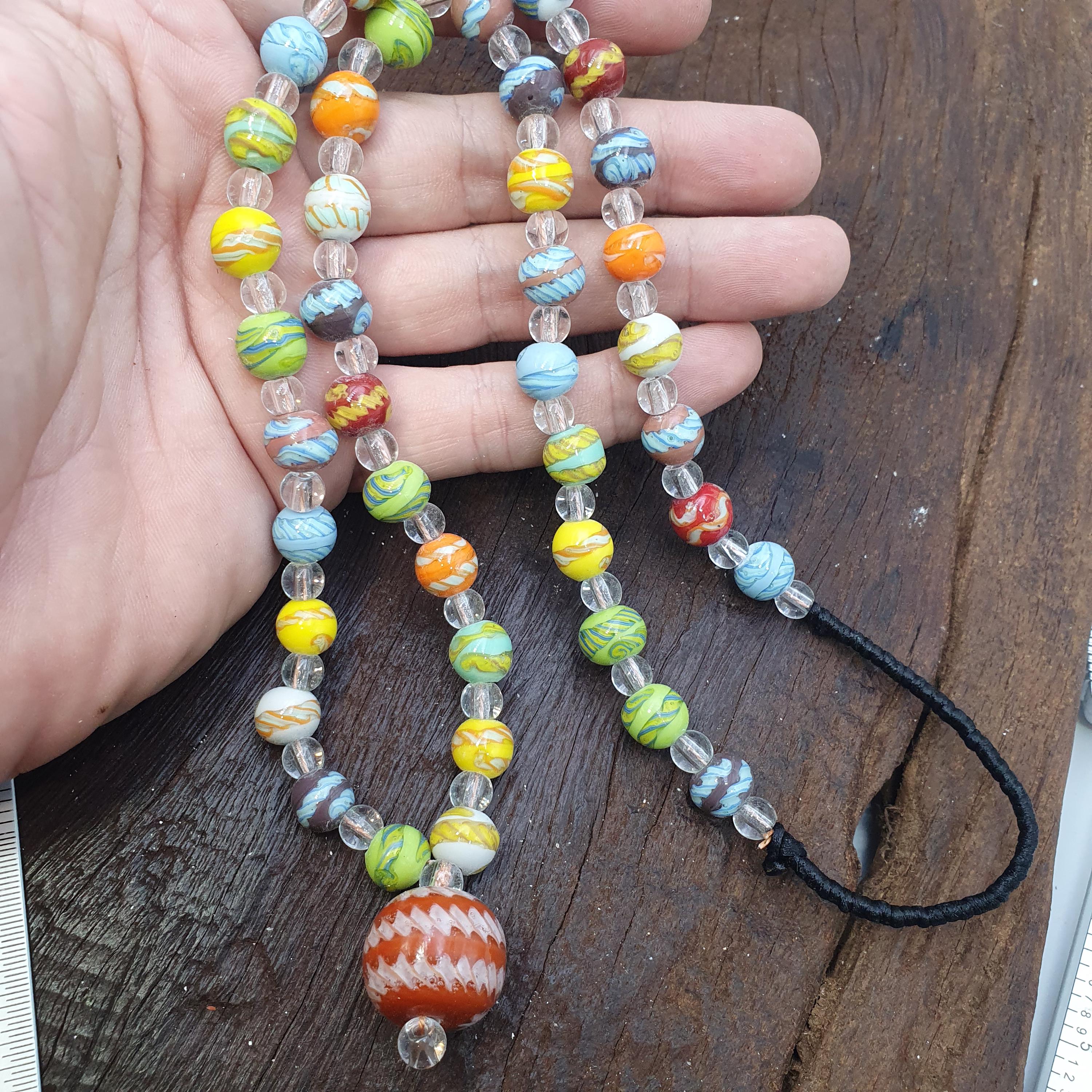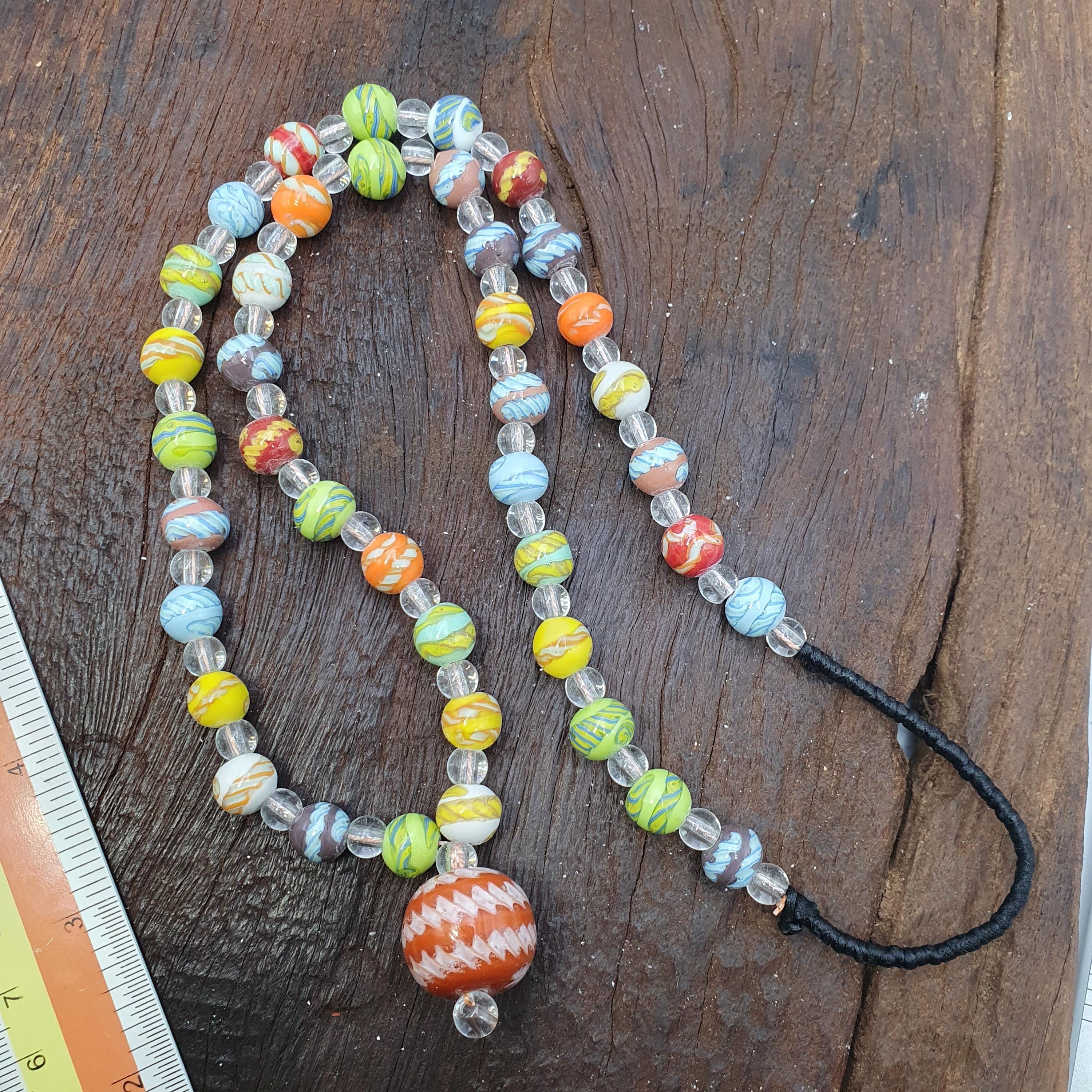 Discover the charm of our Handmade Venetian Style Glass Bead Necklace, featuring a striking large bead pendant and vibrant millefiori beads. This unique beaded necklace combines vintage elegance with artistic craftsmanship, making it a perfect accessory for any jewelry lover or a thoughtful gift for someone special.