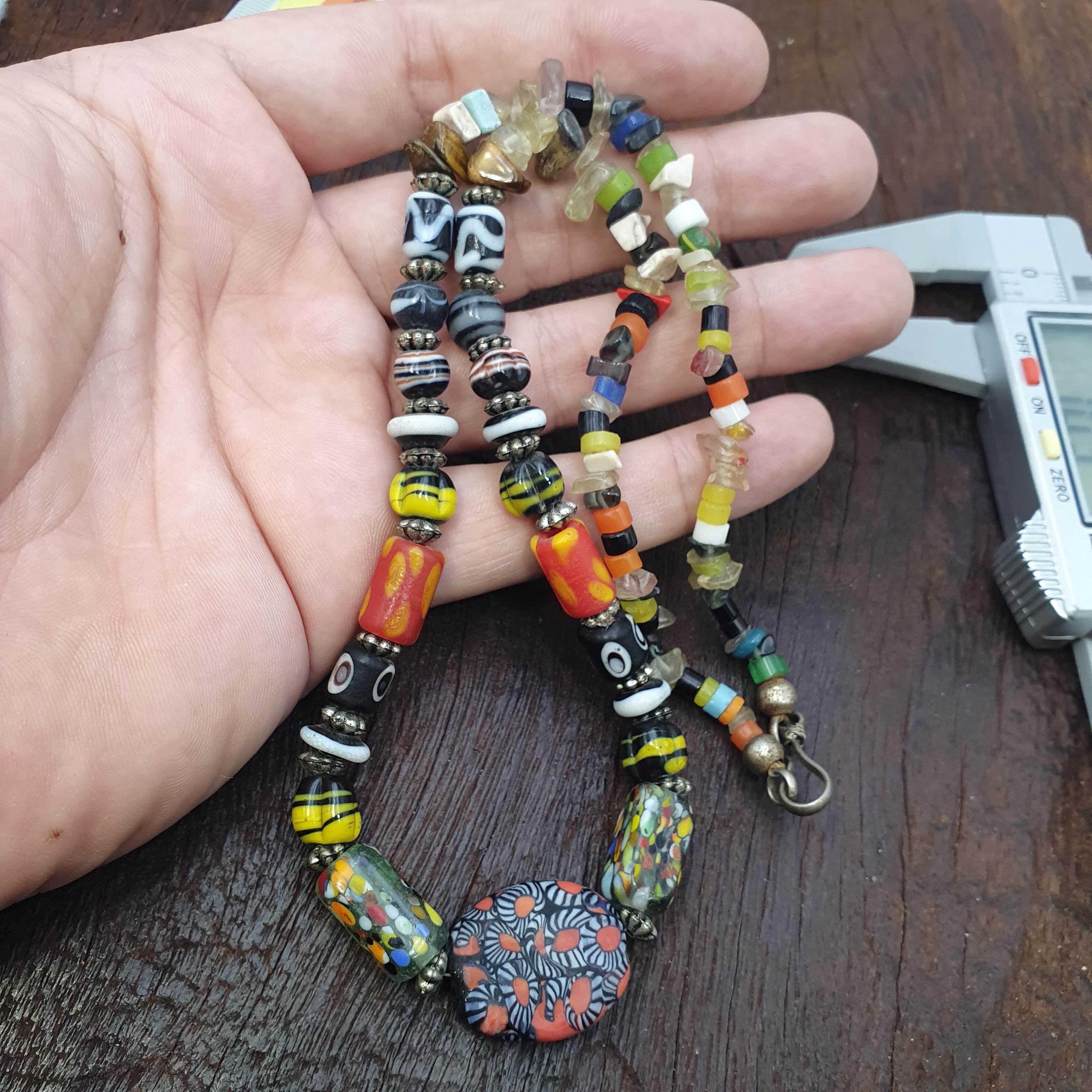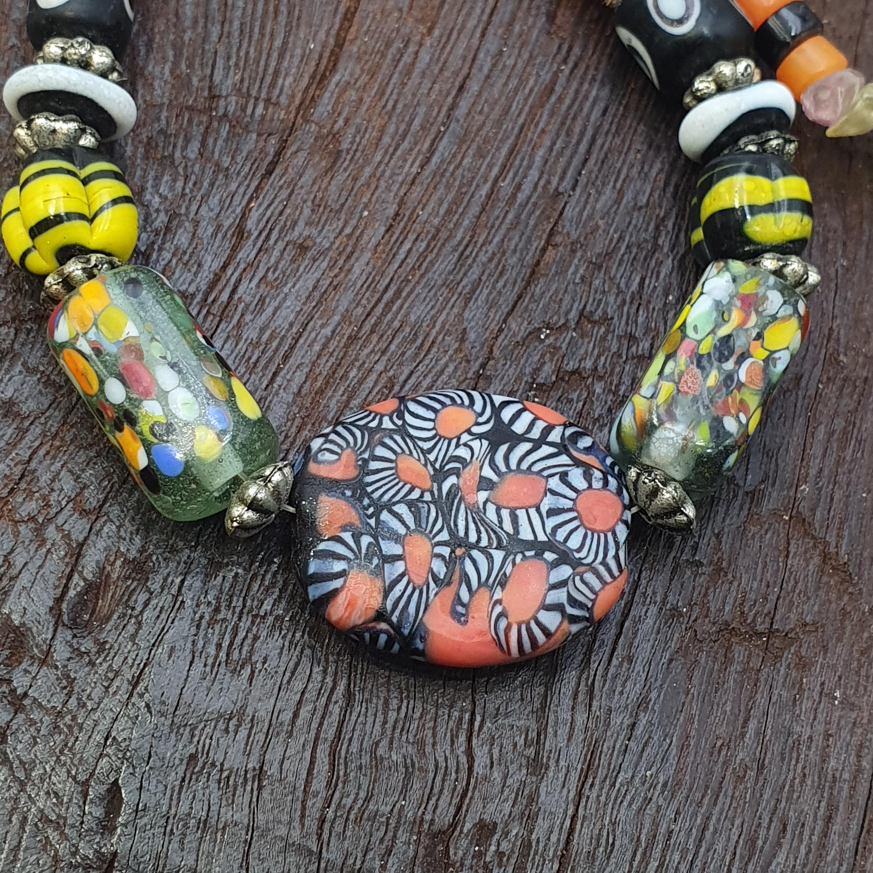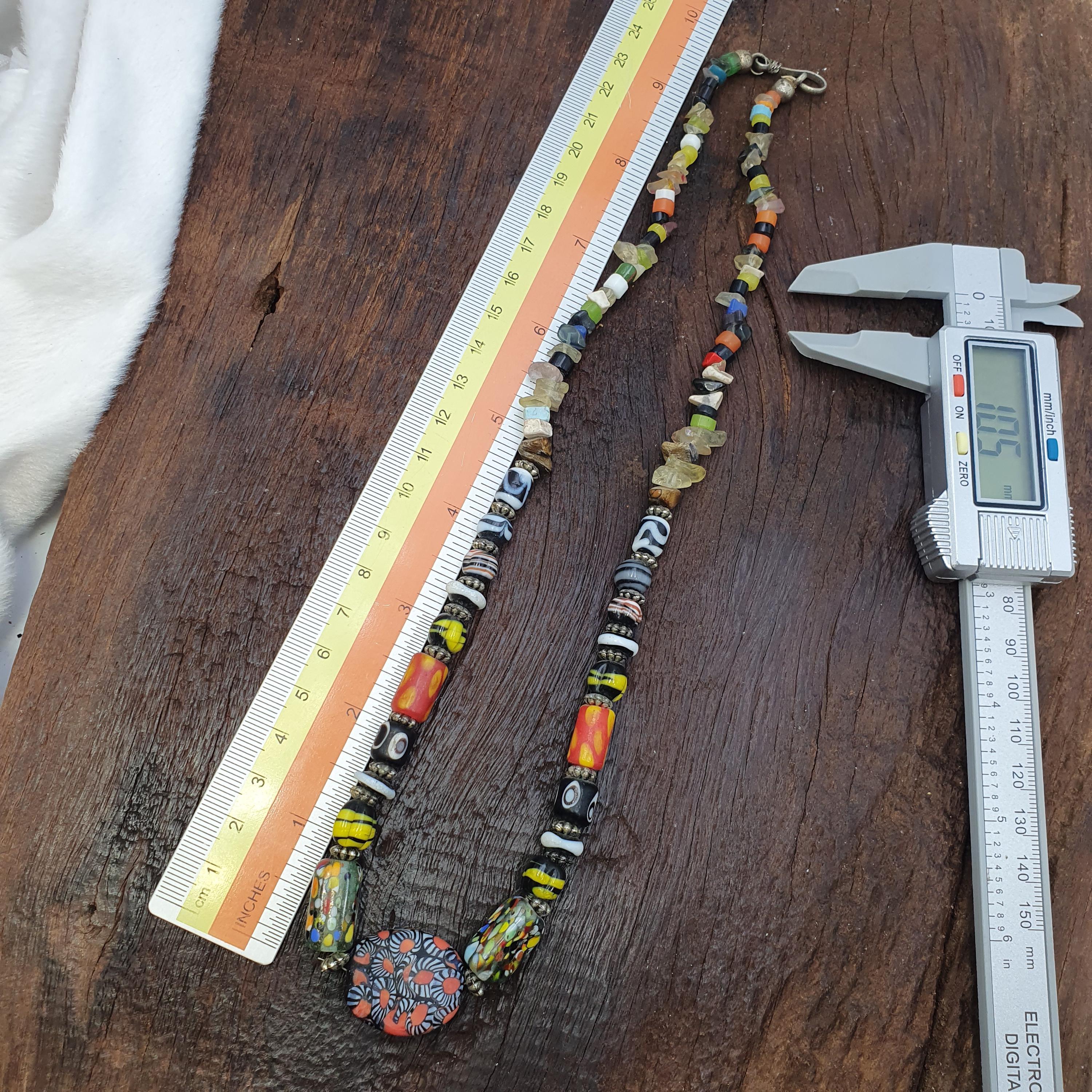 This necklace is a "conversation piece." It pairs beautifully with neutral linens to let the colors pop, or as part of a layered, maximalist look with other gold or glass jewelry.