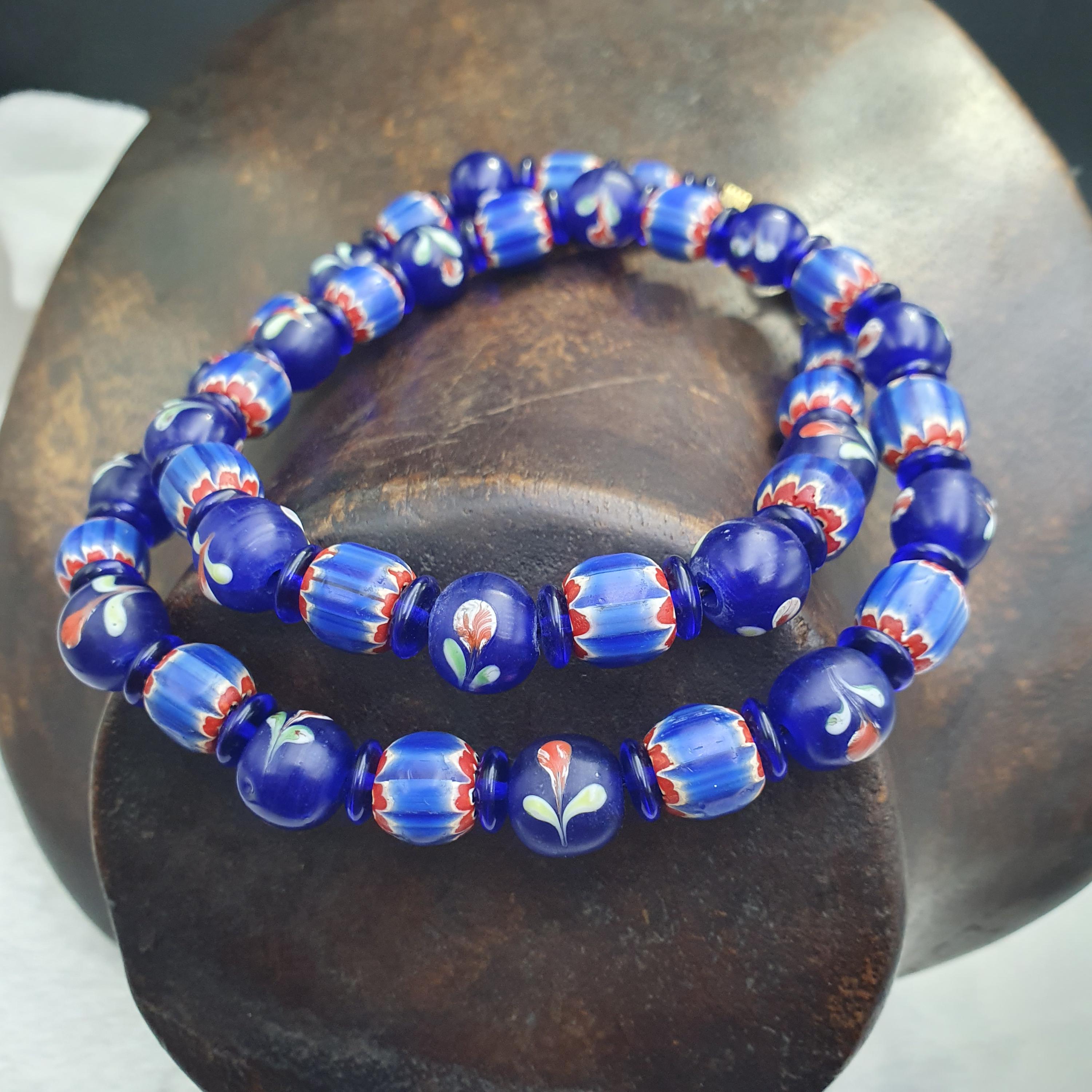 - Vintage Venetian style trade beads in vibrant cobalt blue with floral and striped patterns