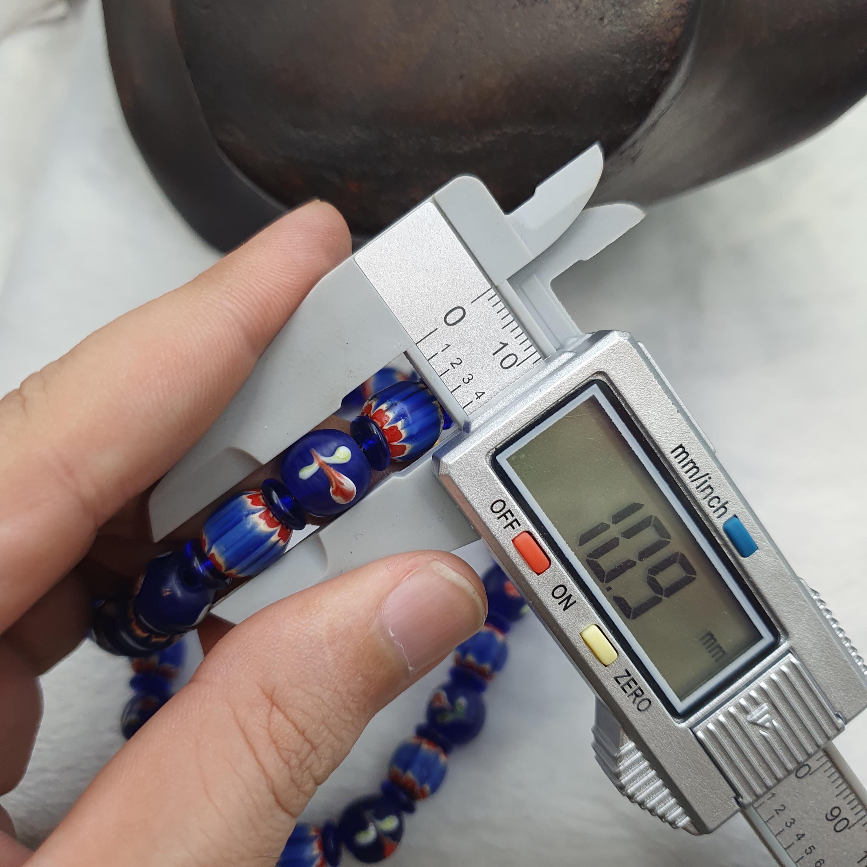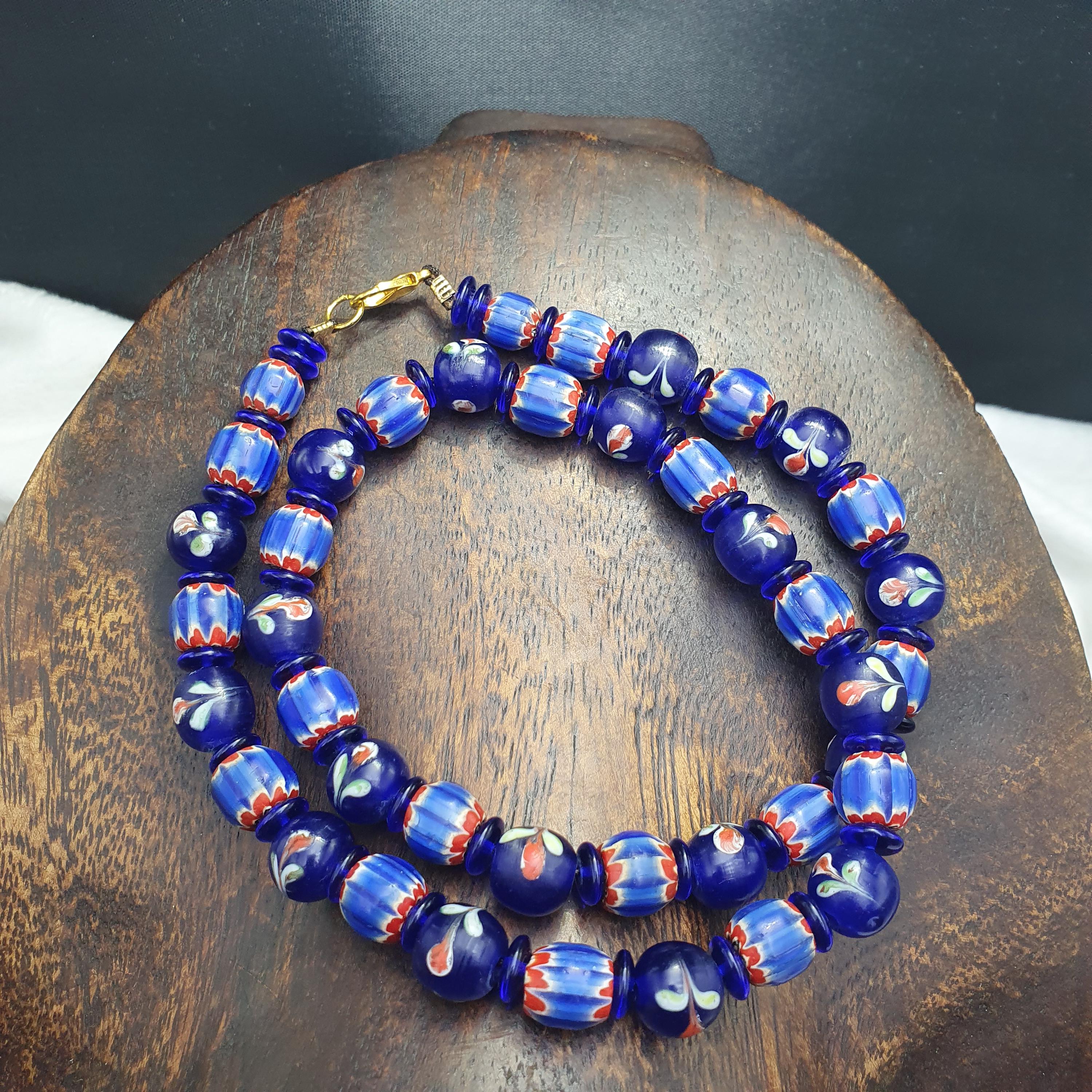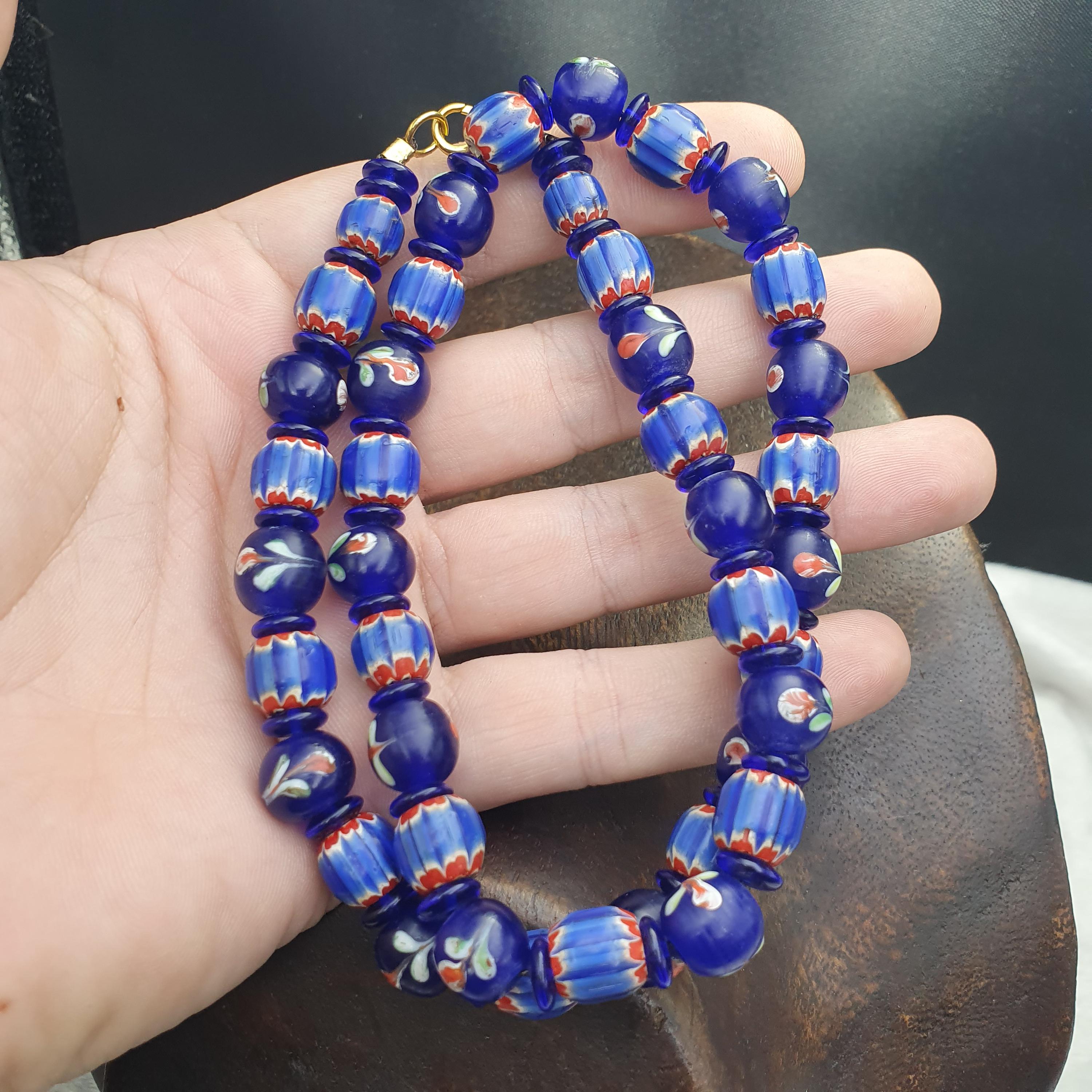 Designed with care and featuring old trade beads in excellent condition, this necklace combines rich history with eye-catching beauty. The deep cobalt blue hues and intricate striped details evoke the allure of Venetian glass artistry, making it a versatile accessory for both casual and formal occasions. The full strand design provides a comfortable and striking look, ideal for layering or wearing alone.