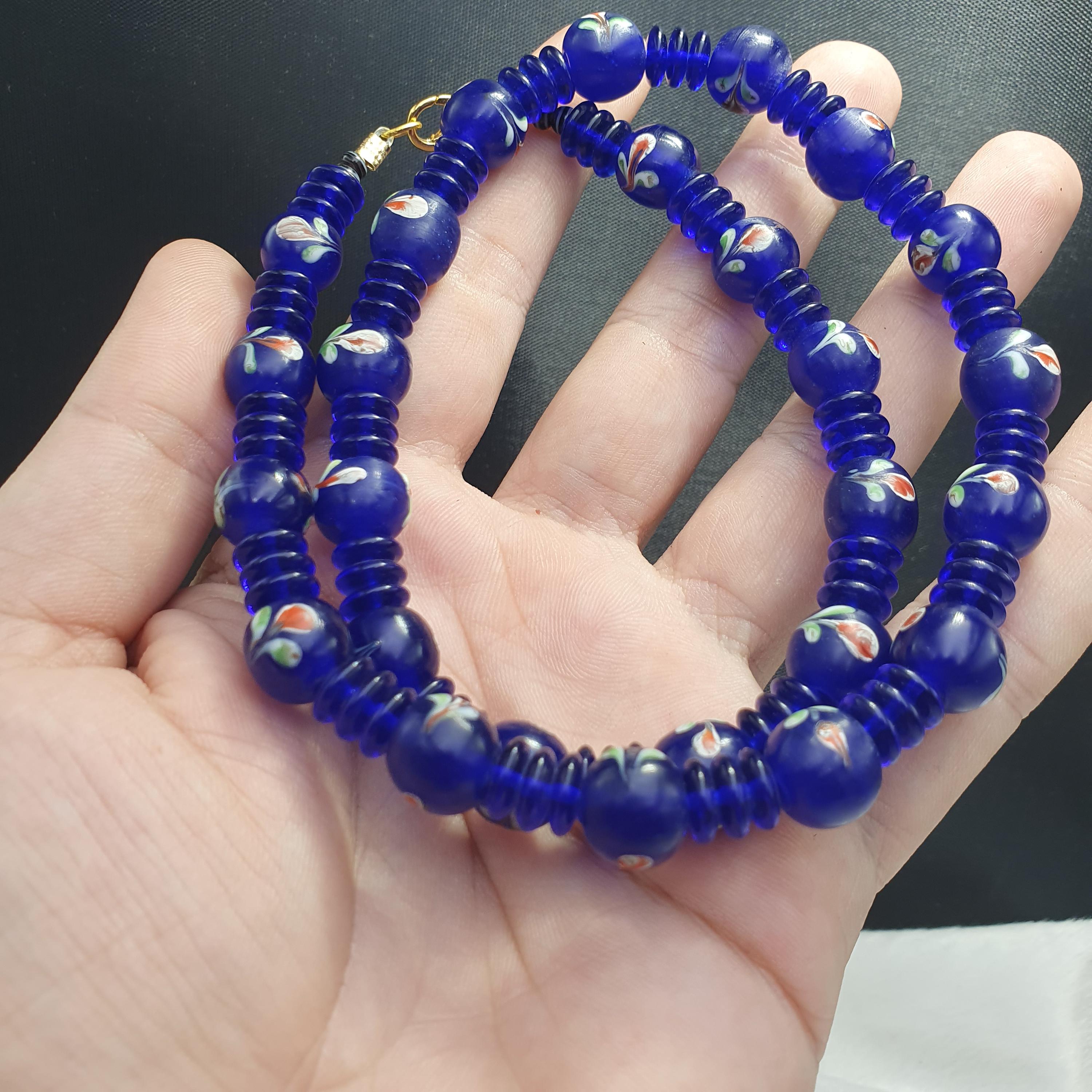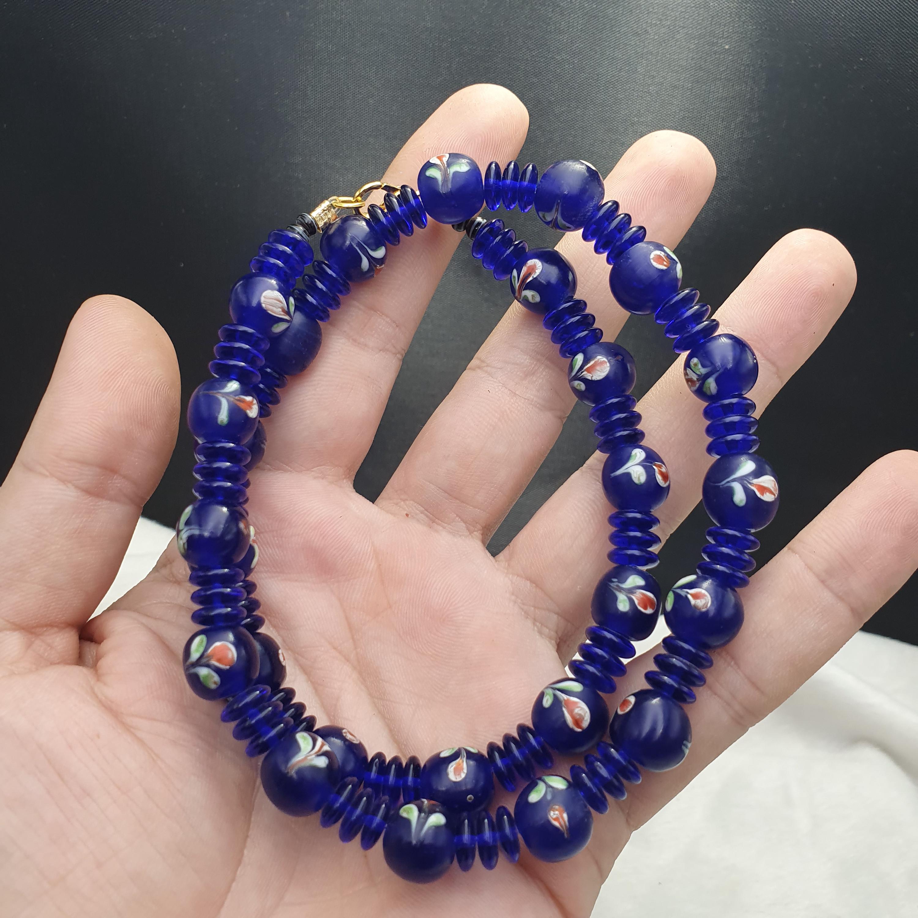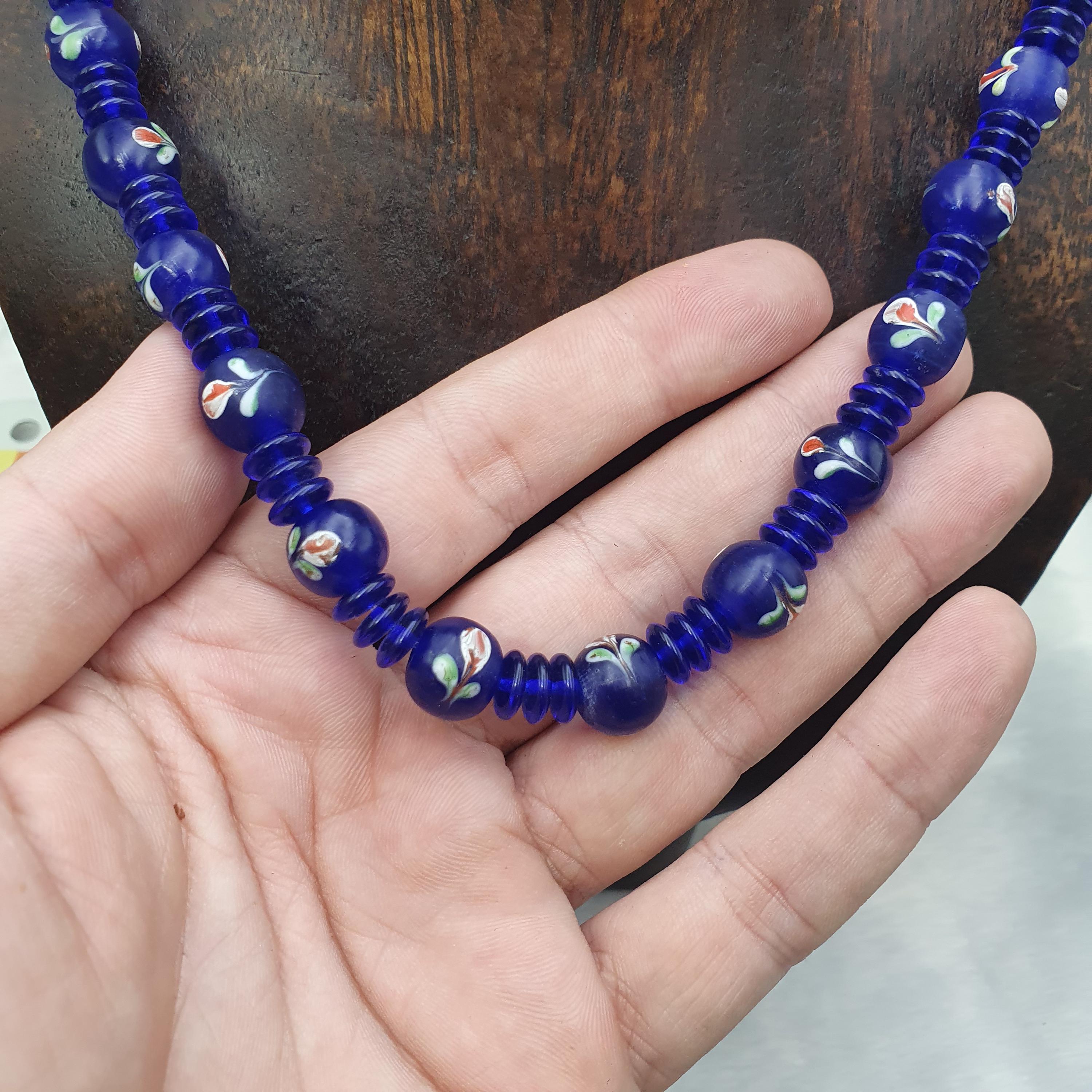 Designed with care and featuring old trade beads in excellent condition, this necklace combines rich history with eye-catching beauty. The deep cobalt blue hues and intricate striped details evoke the allure of Venetian glass artistry, making it a versatile accessory for both casual and formal occasions. The full strand design provides a comfortable and striking look, ideal for layering or wearing alone.