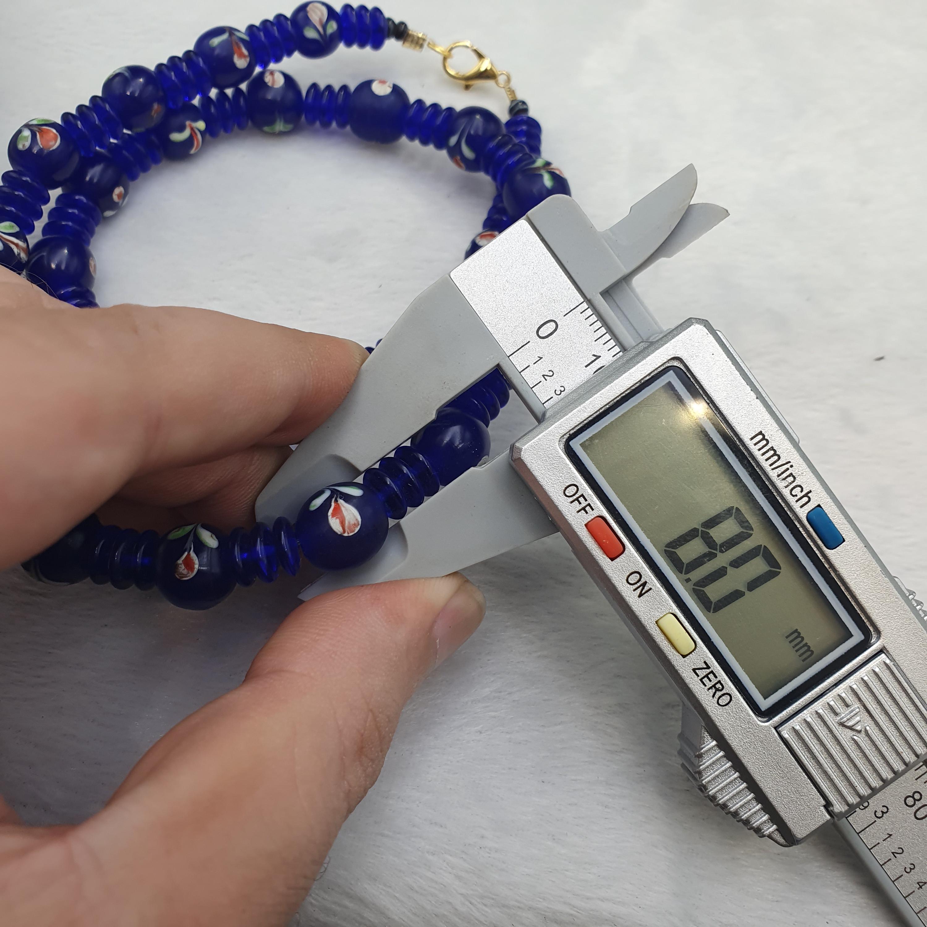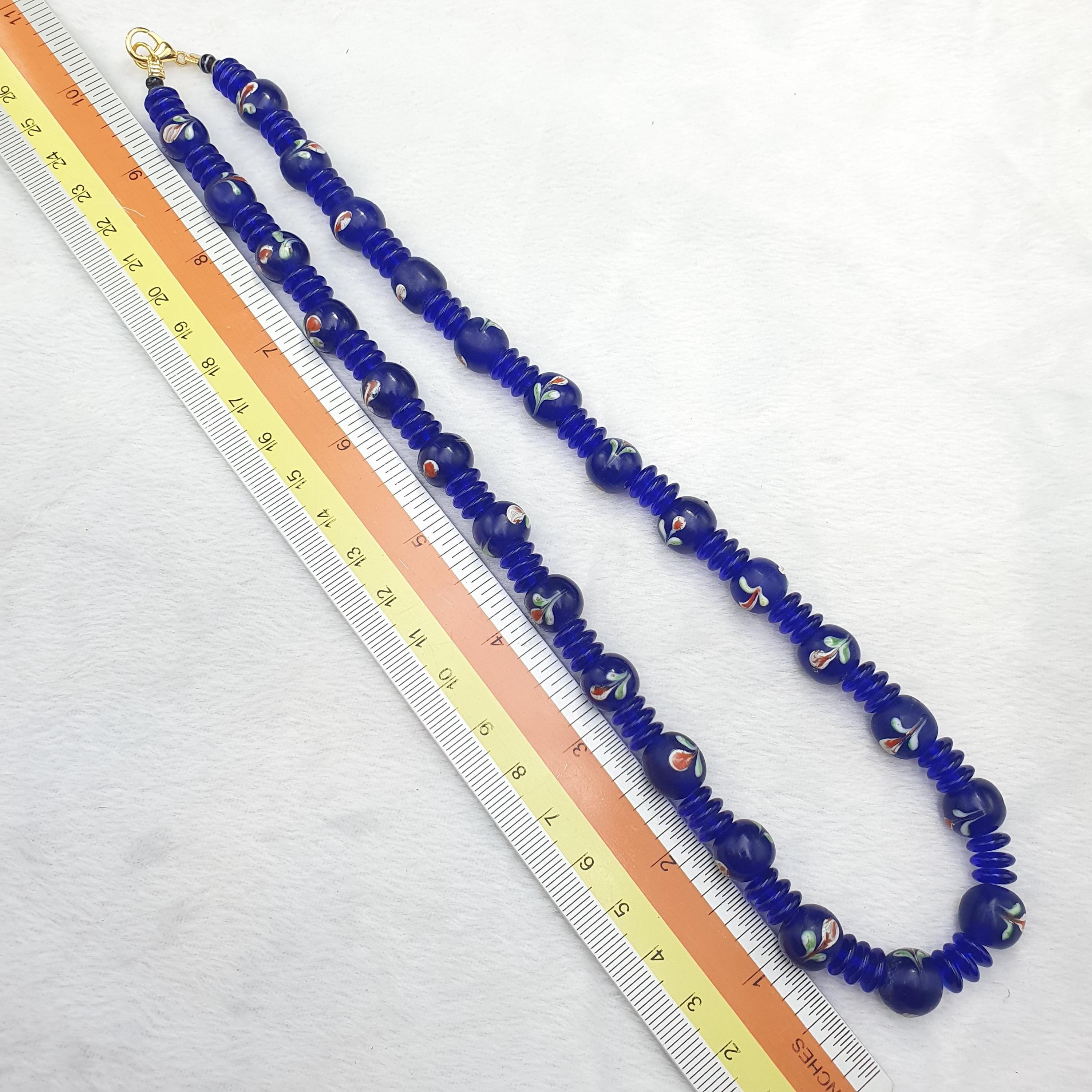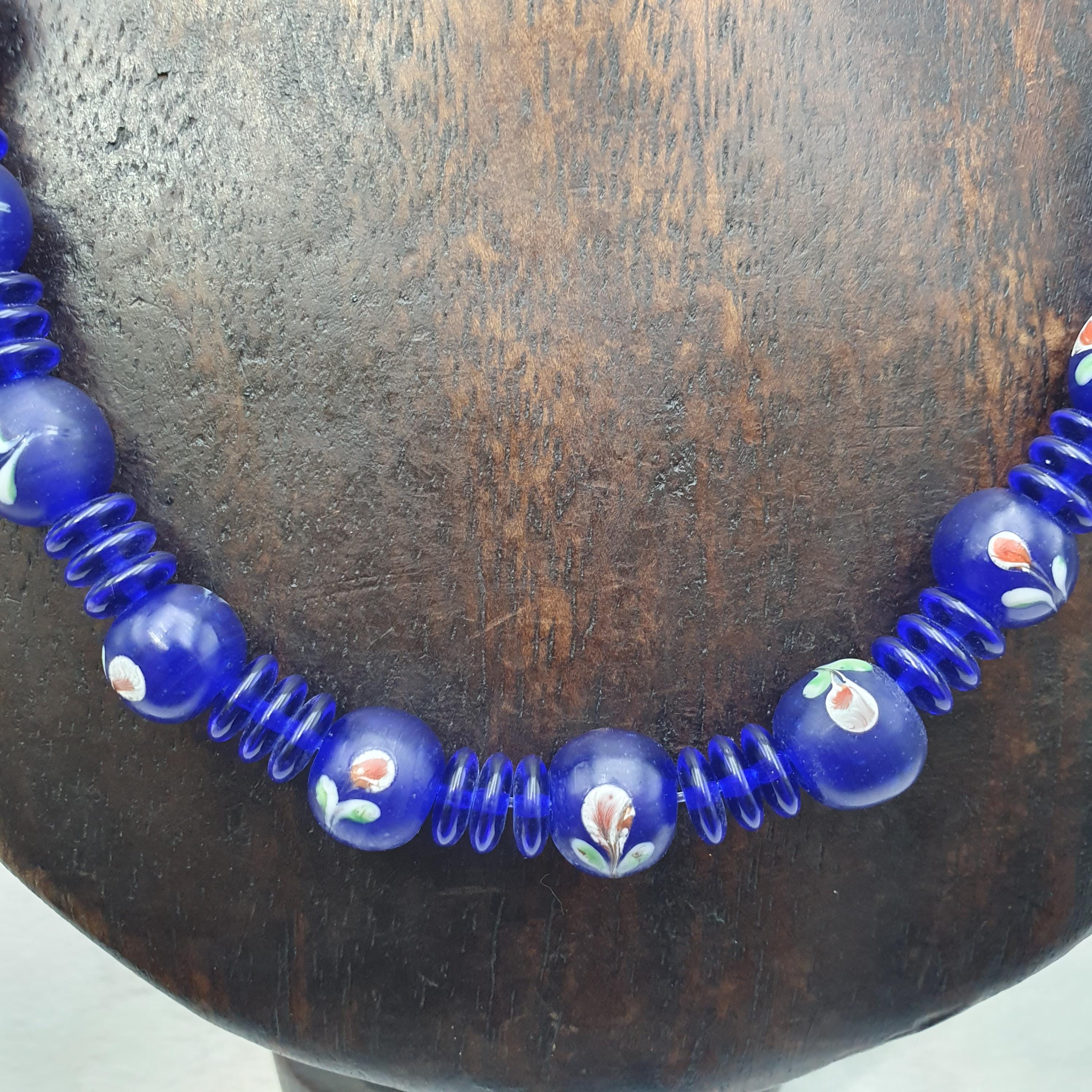 Designed with care and featuring old trade beads in excellent condition, this necklace combines rich history with eye-catching beauty. The deep cobalt blue hues and intricate striped details evoke the allure of Venetian glass artistry, making it a versatile accessory for both casual and formal occasions. The full strand design provides a comfortable and striking look, ideal for layering or wearing alone.