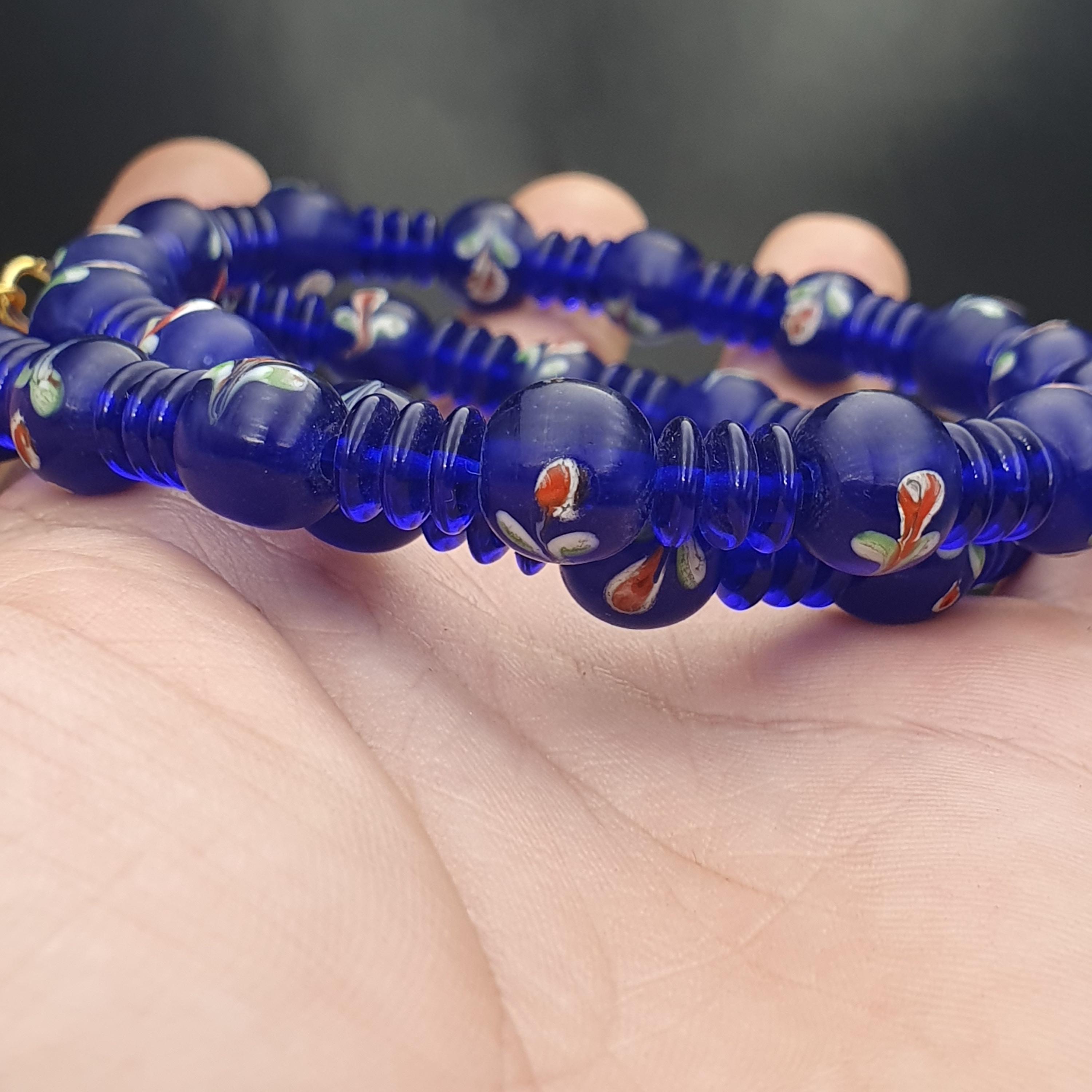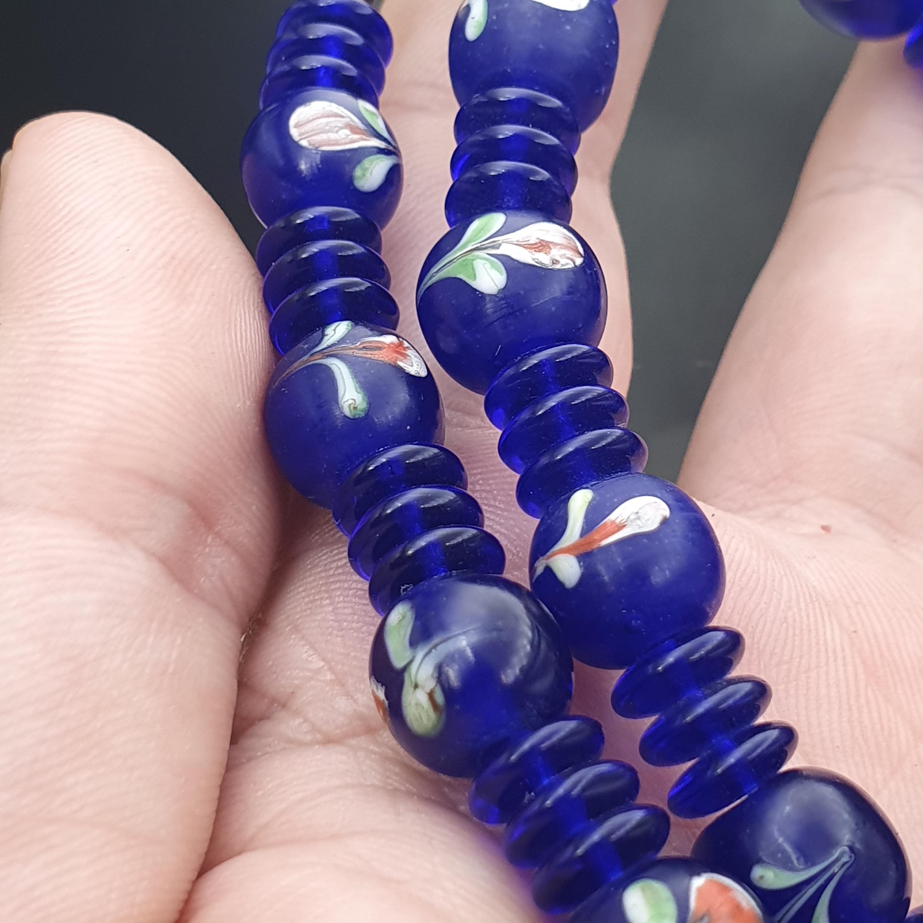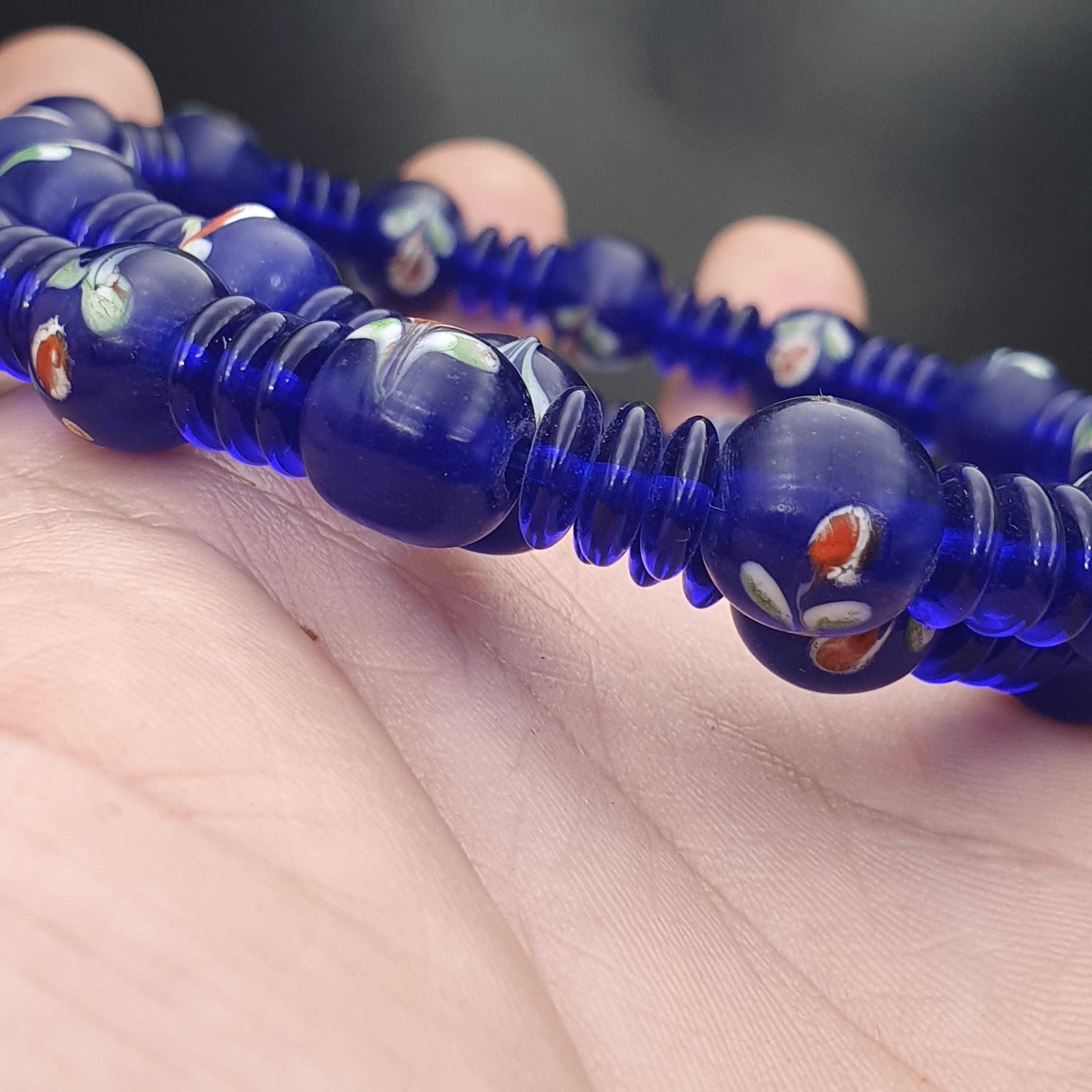 - Vintage Venetian style trade beads in vibrant cobalt blue with floral and striped patterns