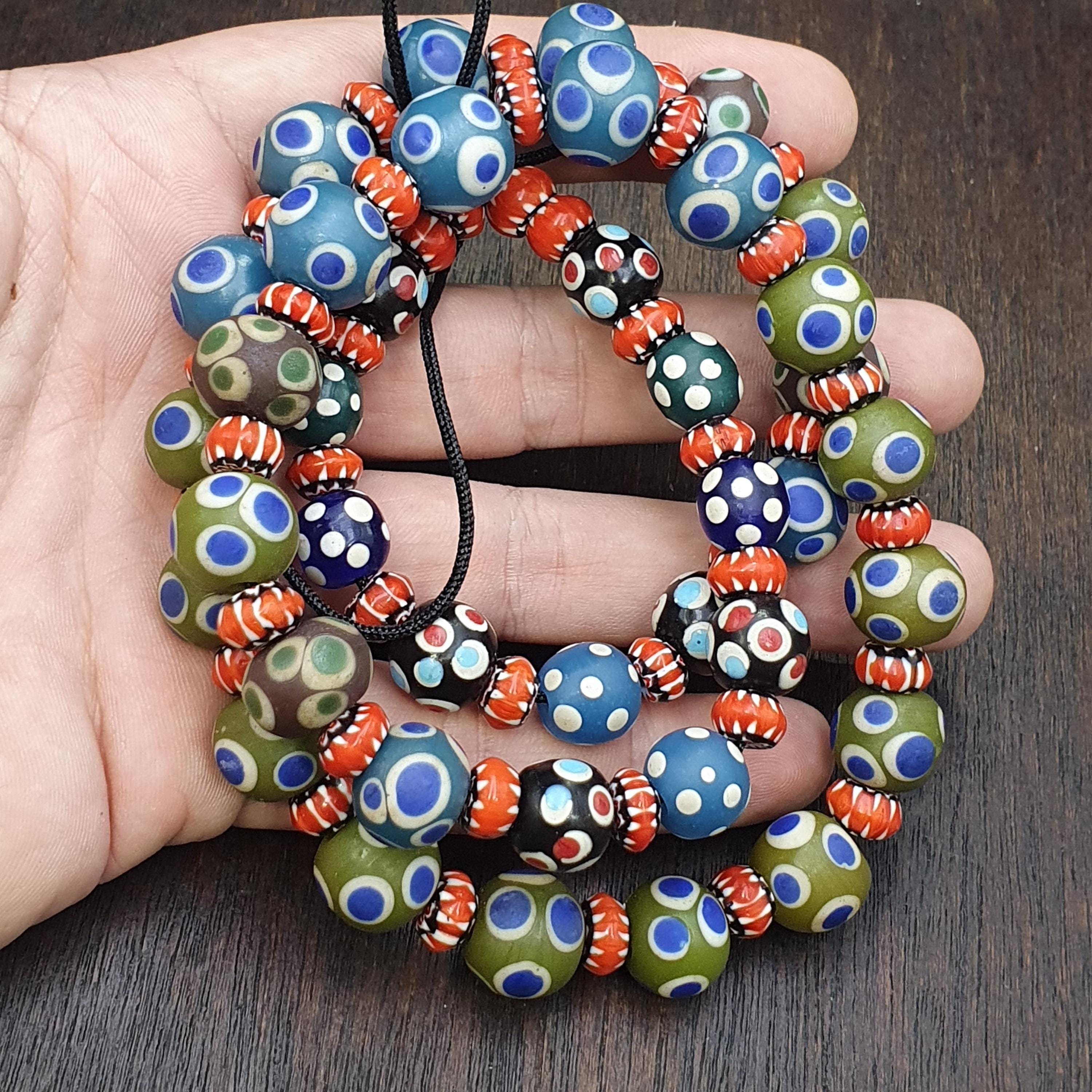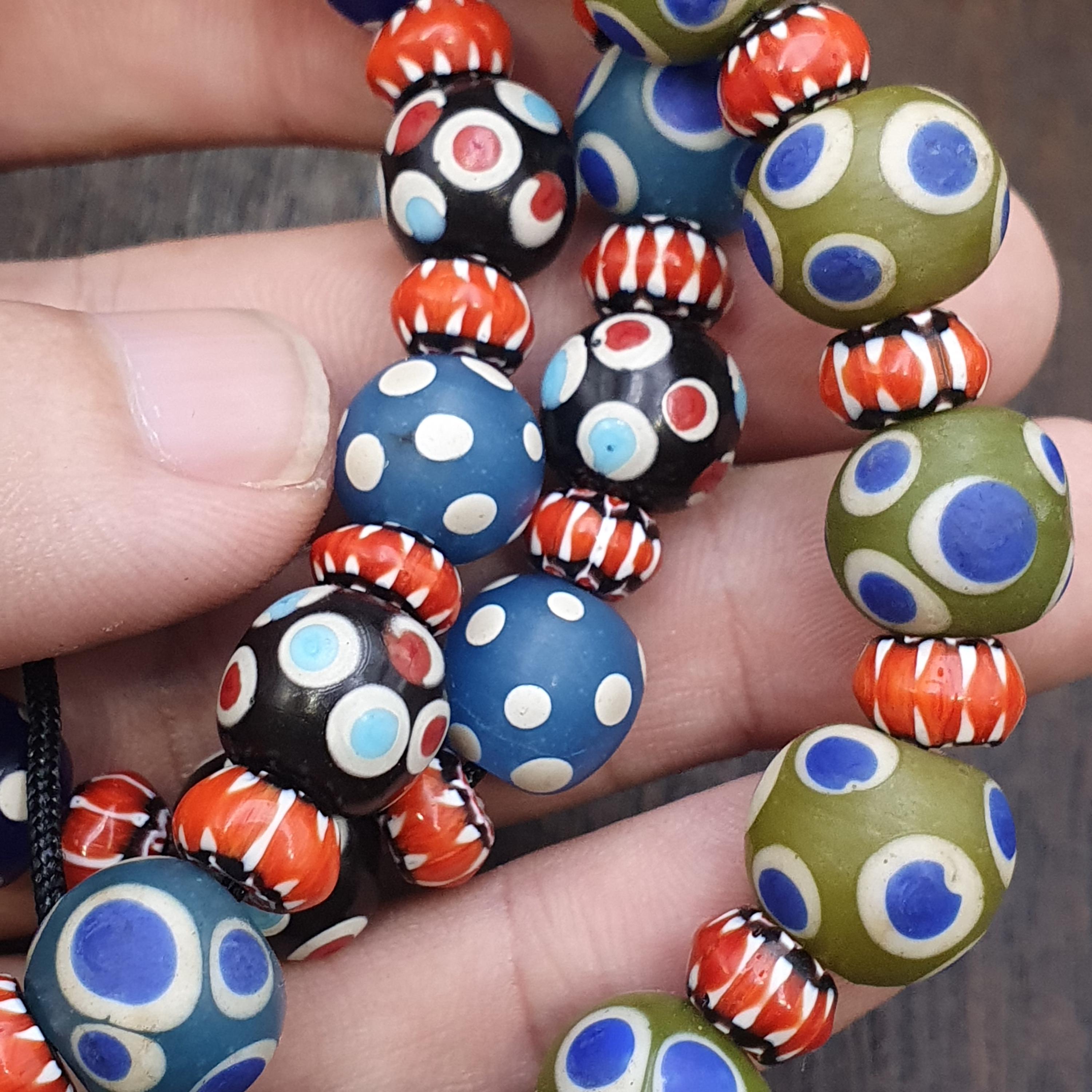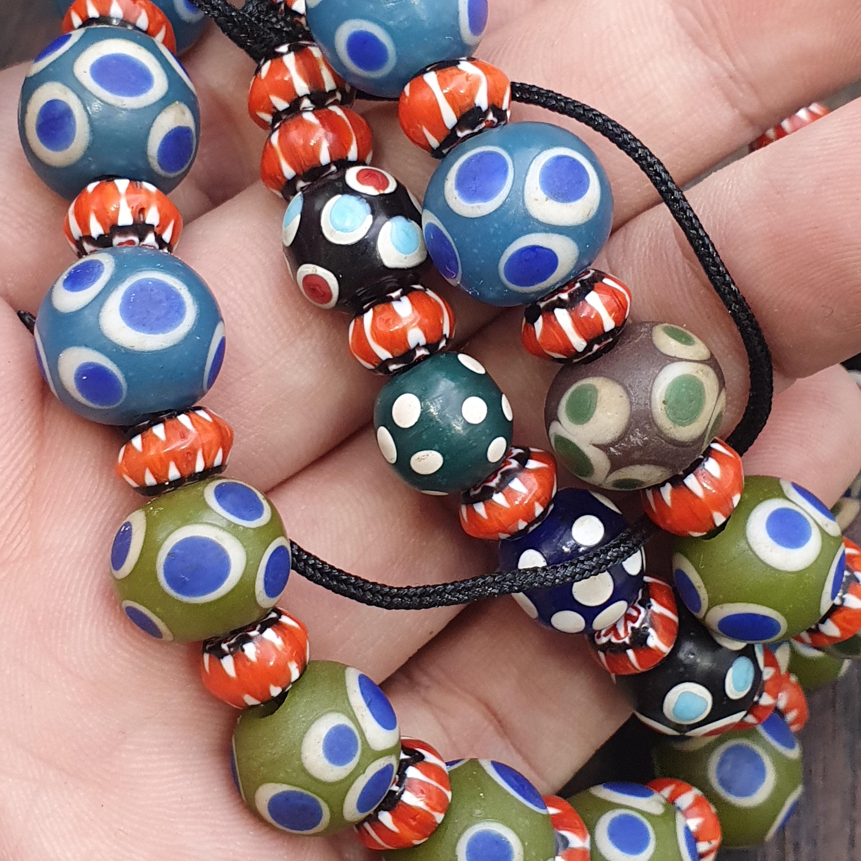 Add a burst of history and color to your collection or next jewelry project with this beautiful strand of Venetian-style glass trade beads. Featuring a striking mix of Evil Eye patterns and Fancy Chevron/Feather designs, these beads capture the iconic aesthetic of historical African trade beads.