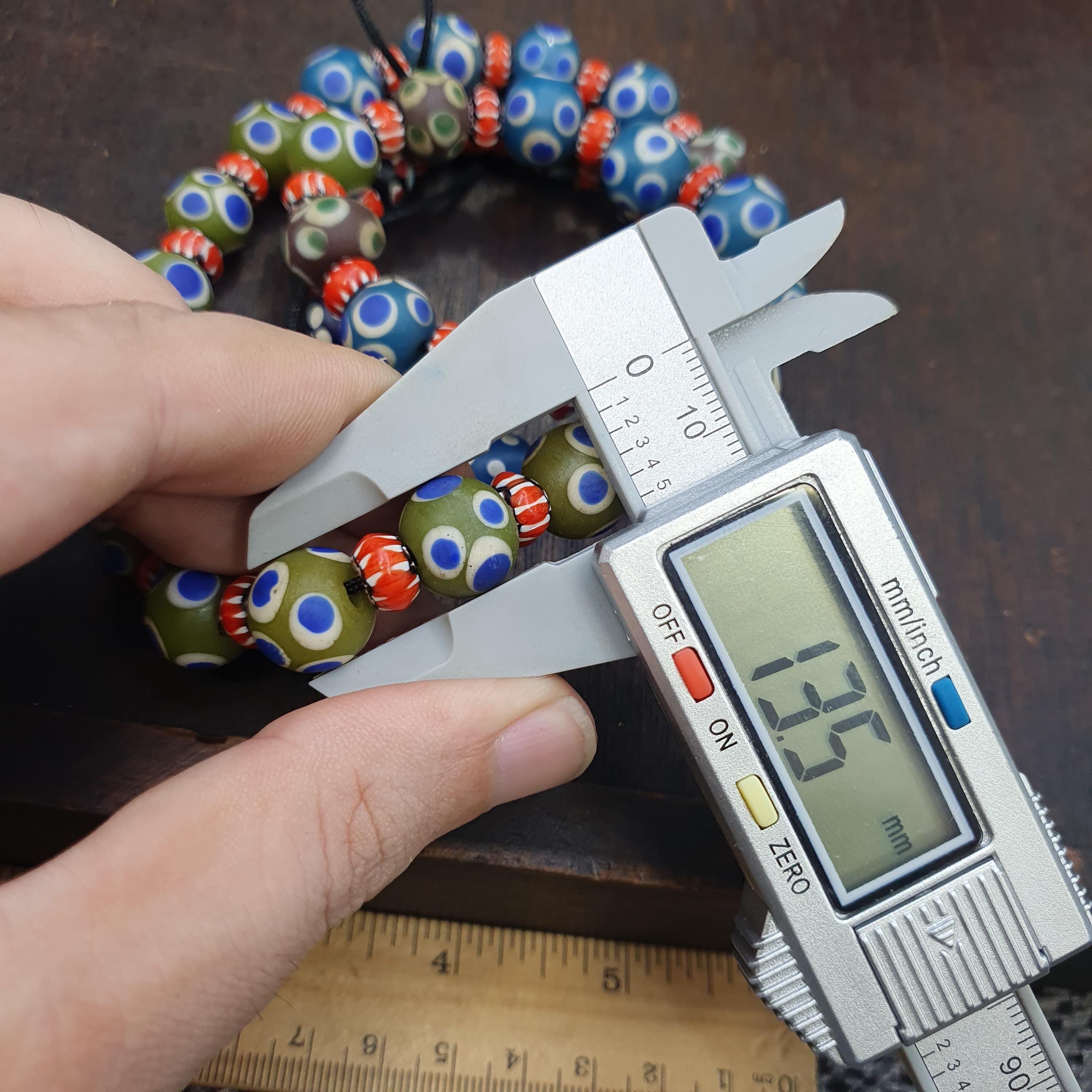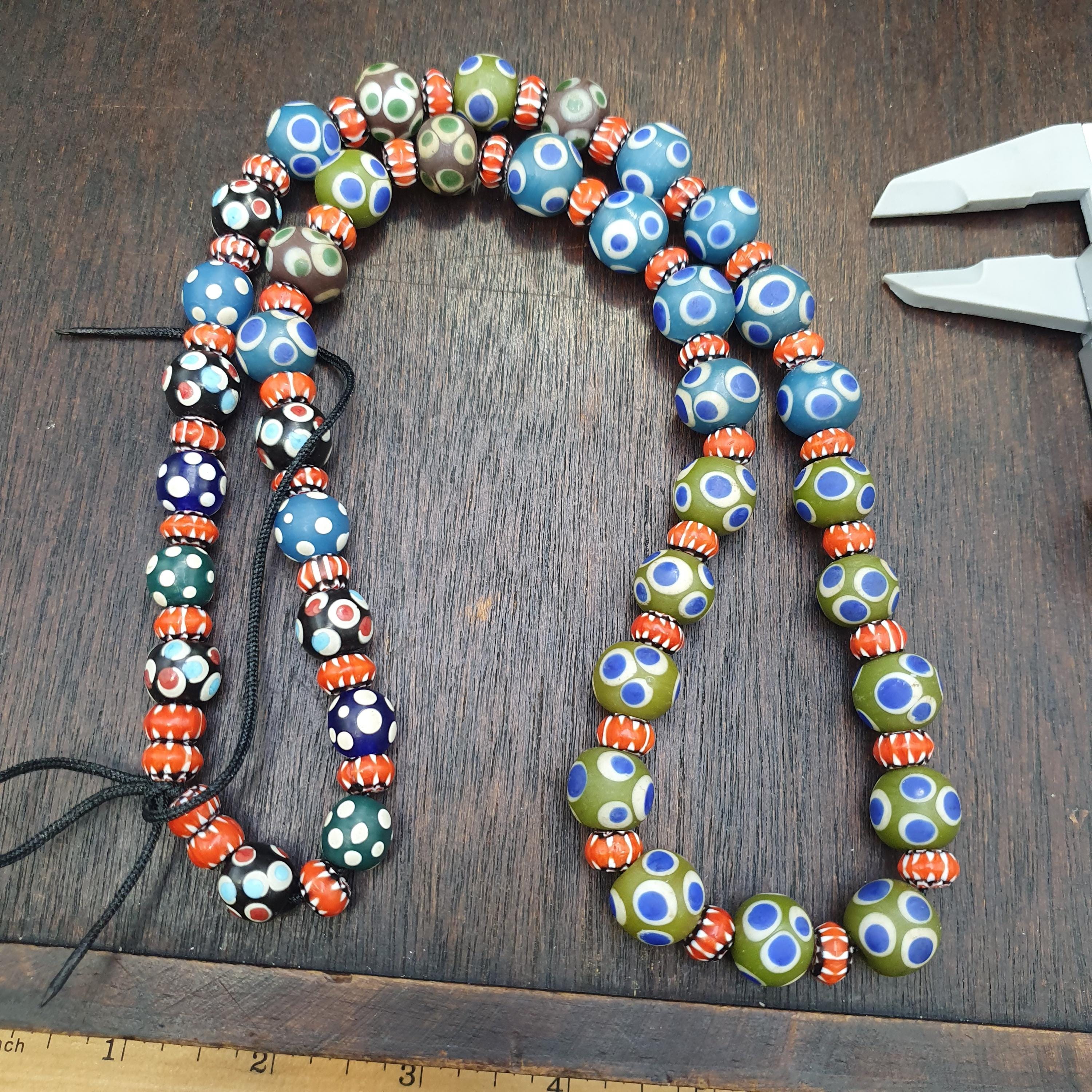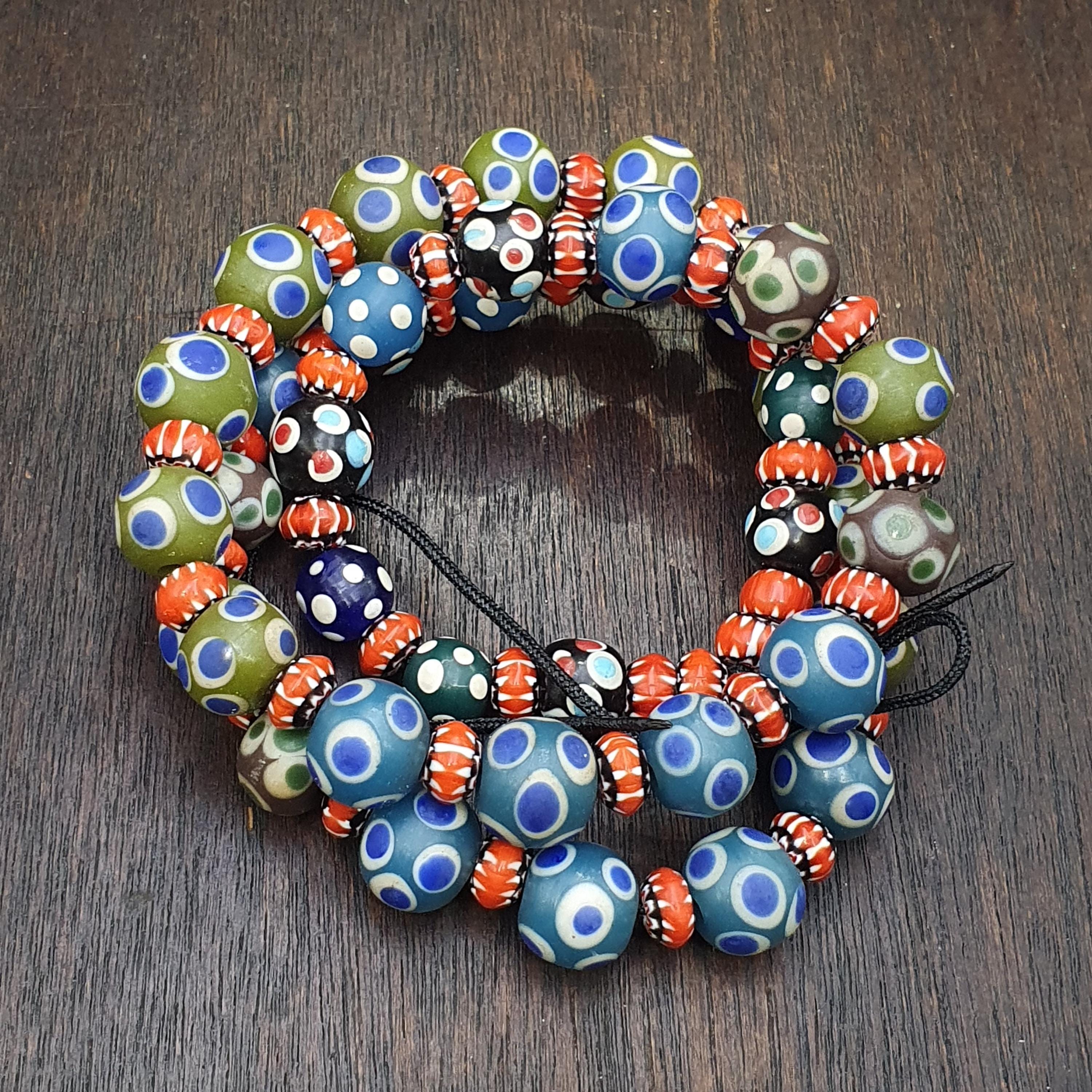 Add a burst of history and color to your collection or next jewelry project with this beautiful strand of Venetian-style glass trade beads. Featuring a striking mix of Evil Eye patterns and Fancy Chevron/Feather designs, these beads capture the iconic aesthetic of historical African trade beads.