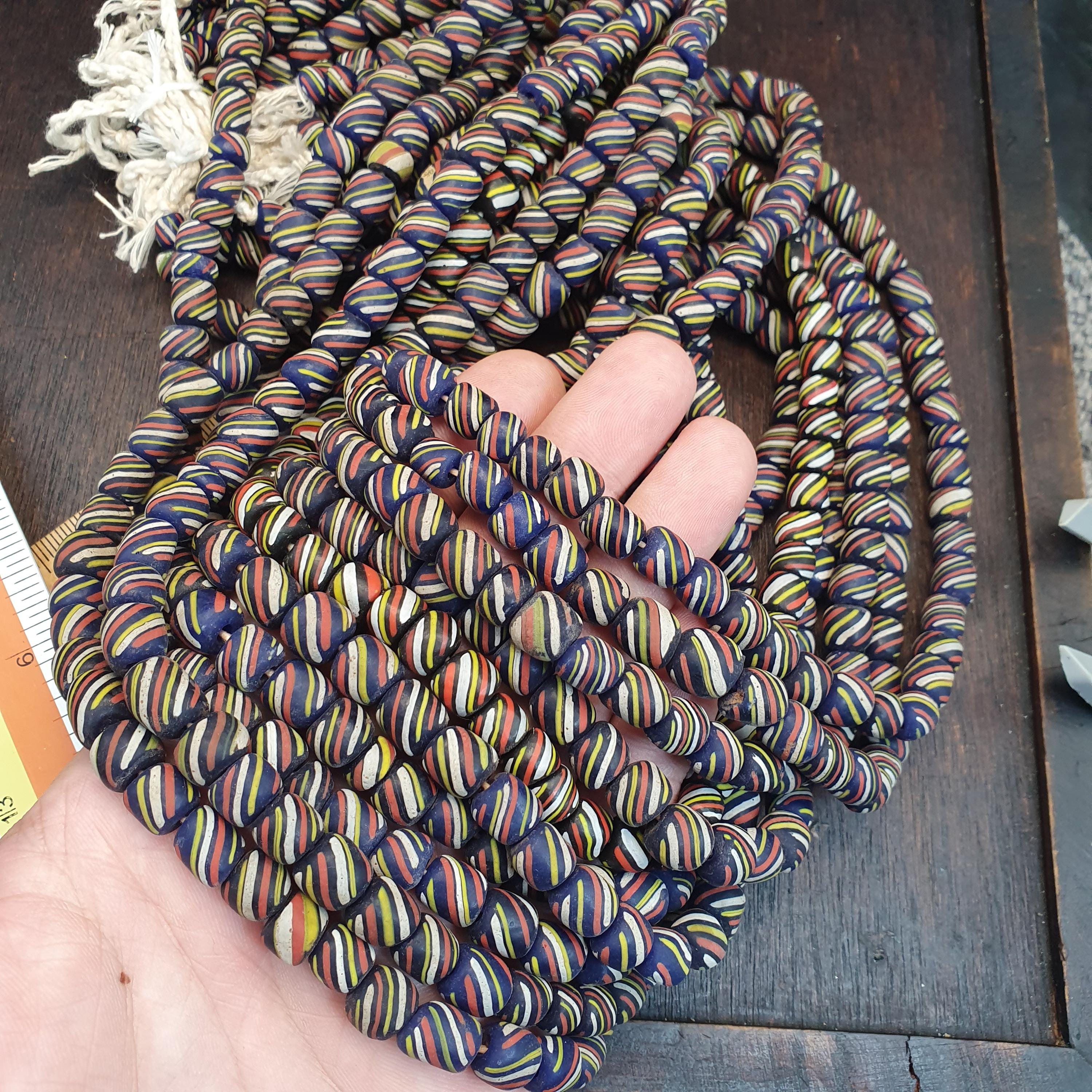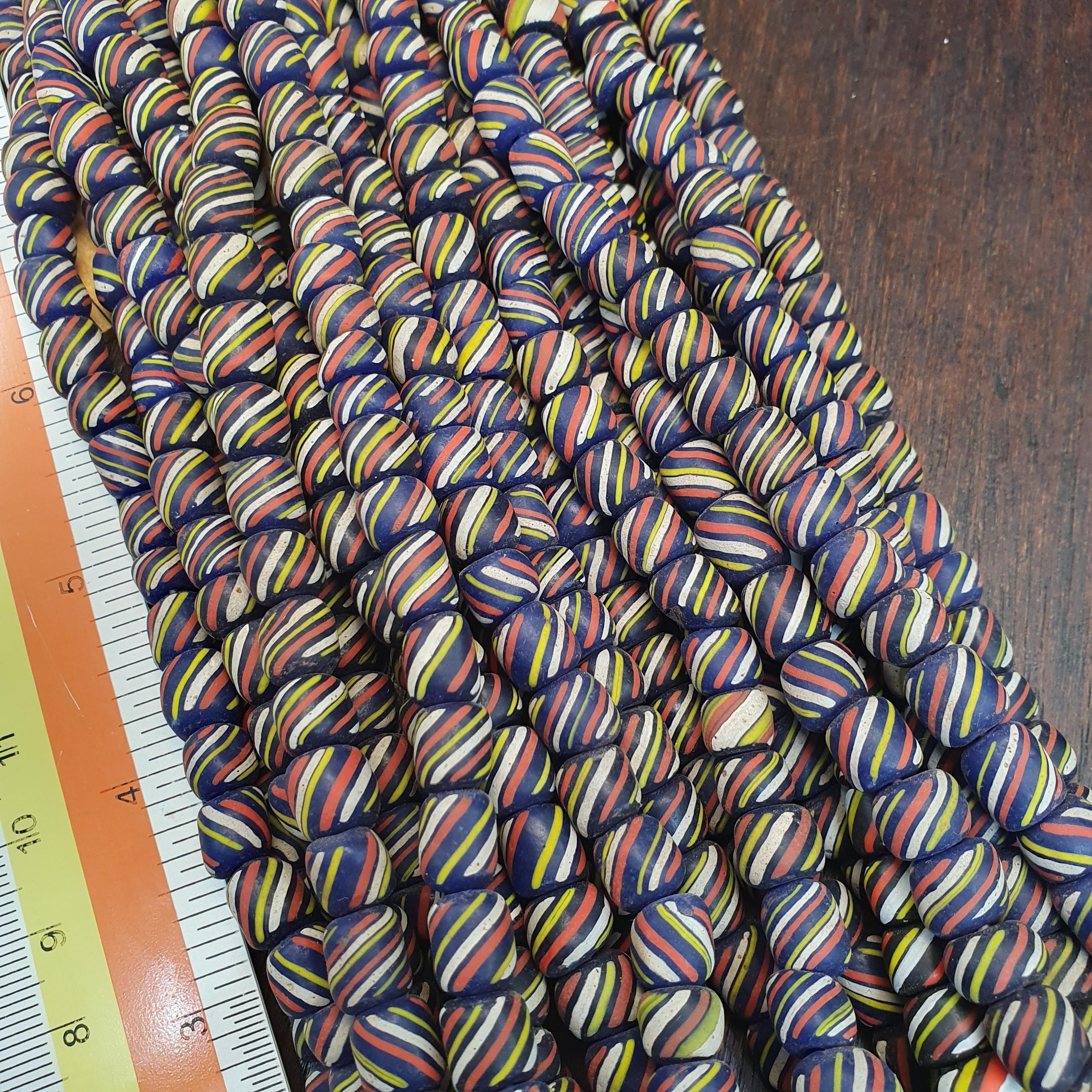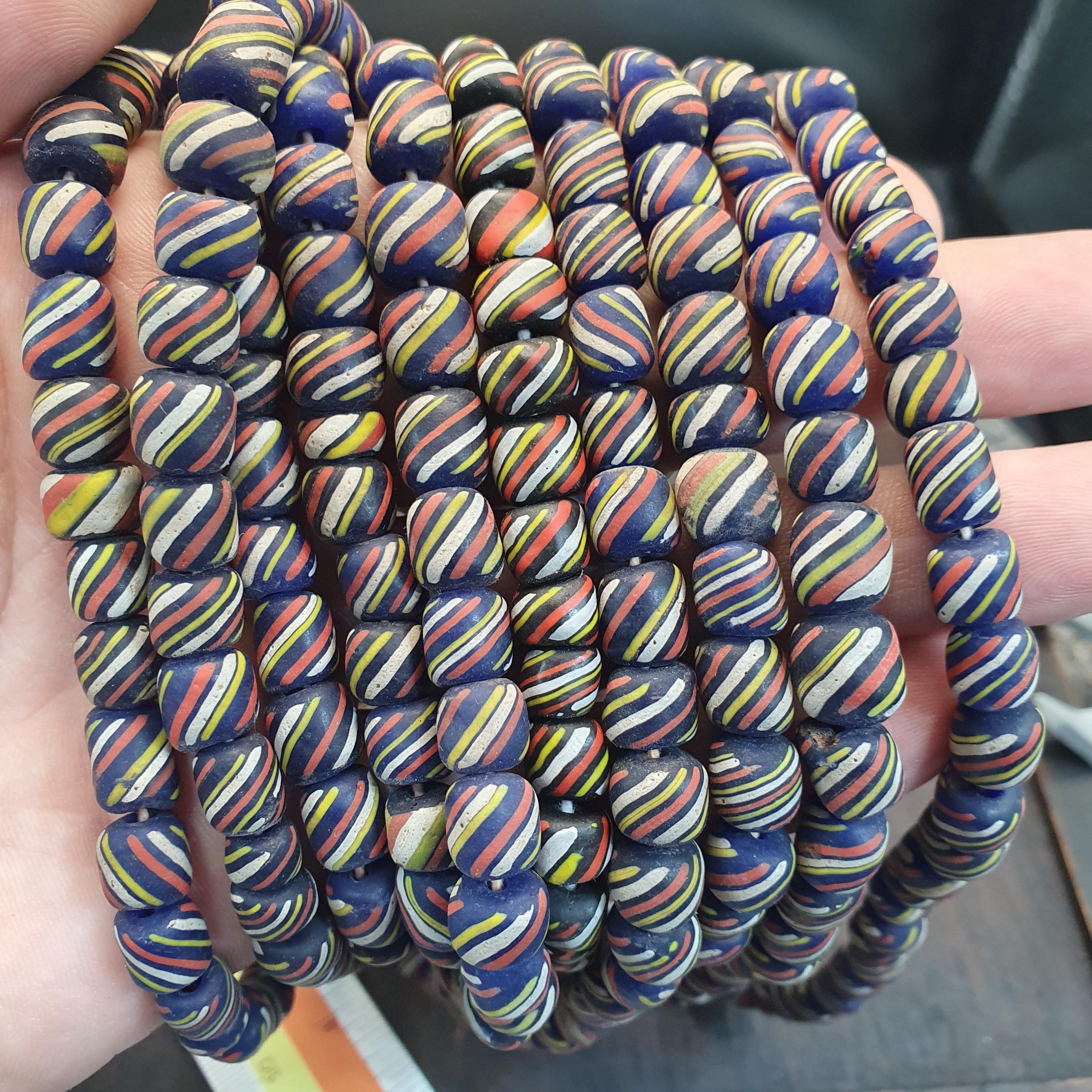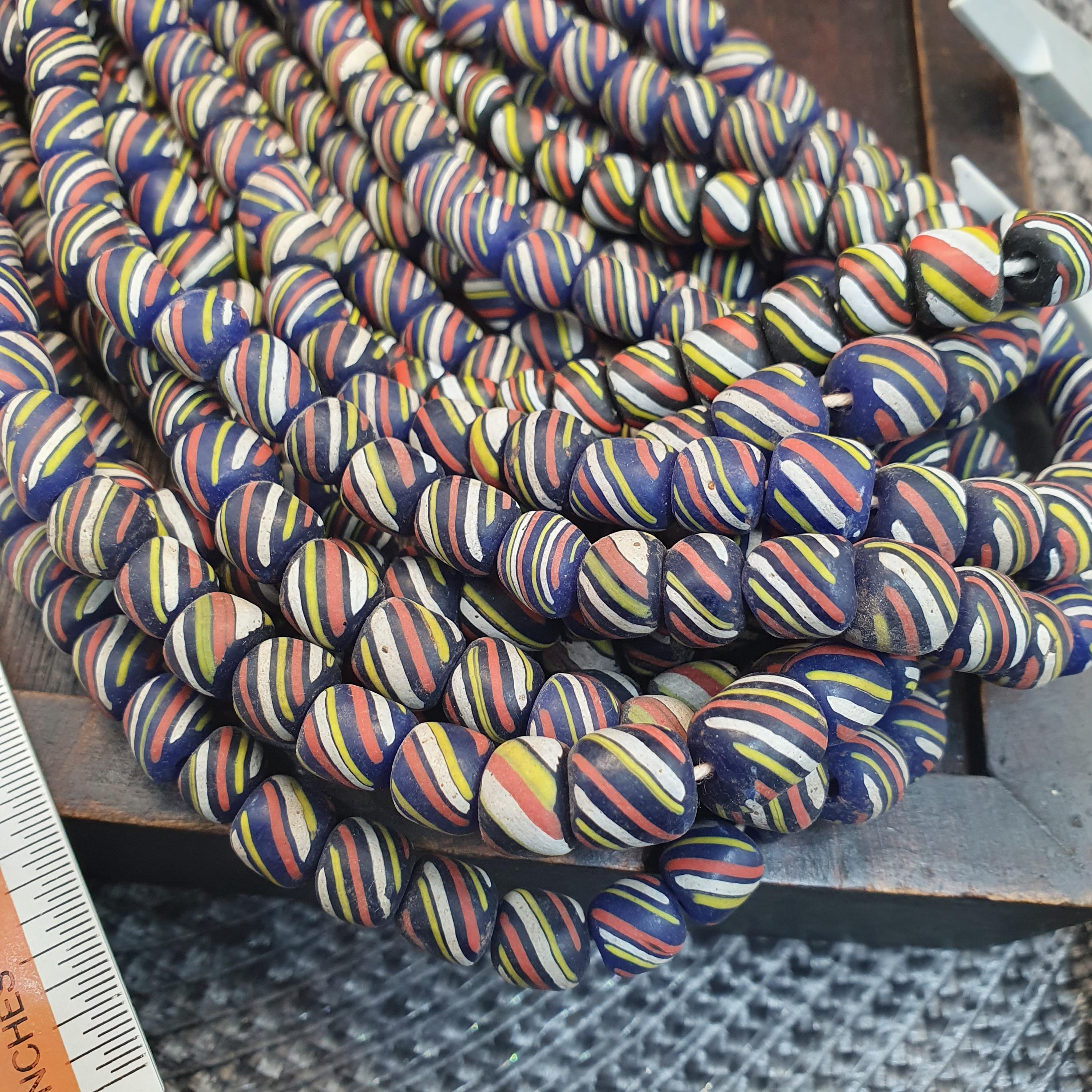Bring energy and tradition to your jewelry designs with this beautiful, high-volume strand of striped glass trade beads. Often referred to as "Skunk" or "Candy Stripe" beads, these are a staple of African trade bead history and offer a bold, graphic look for modern creators.