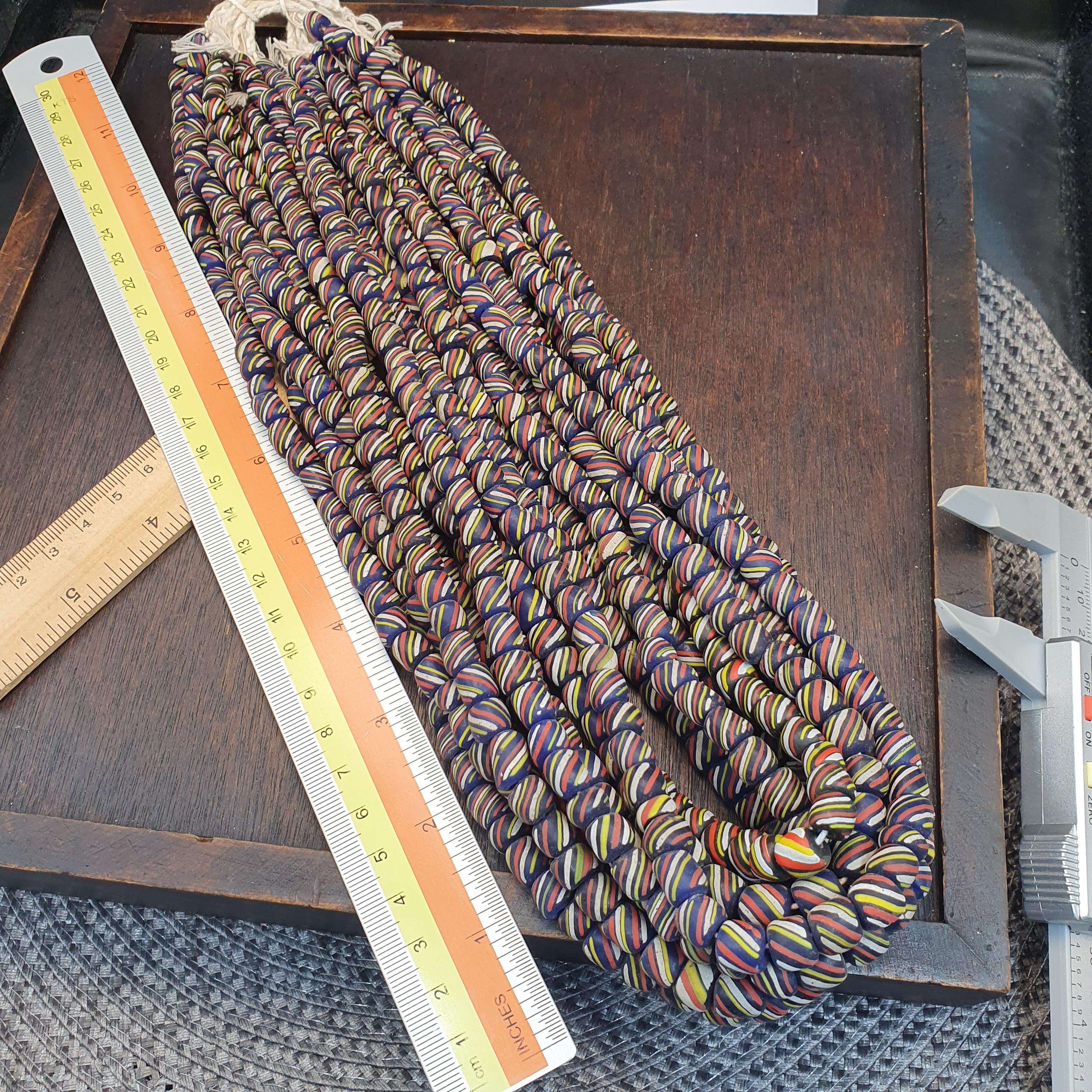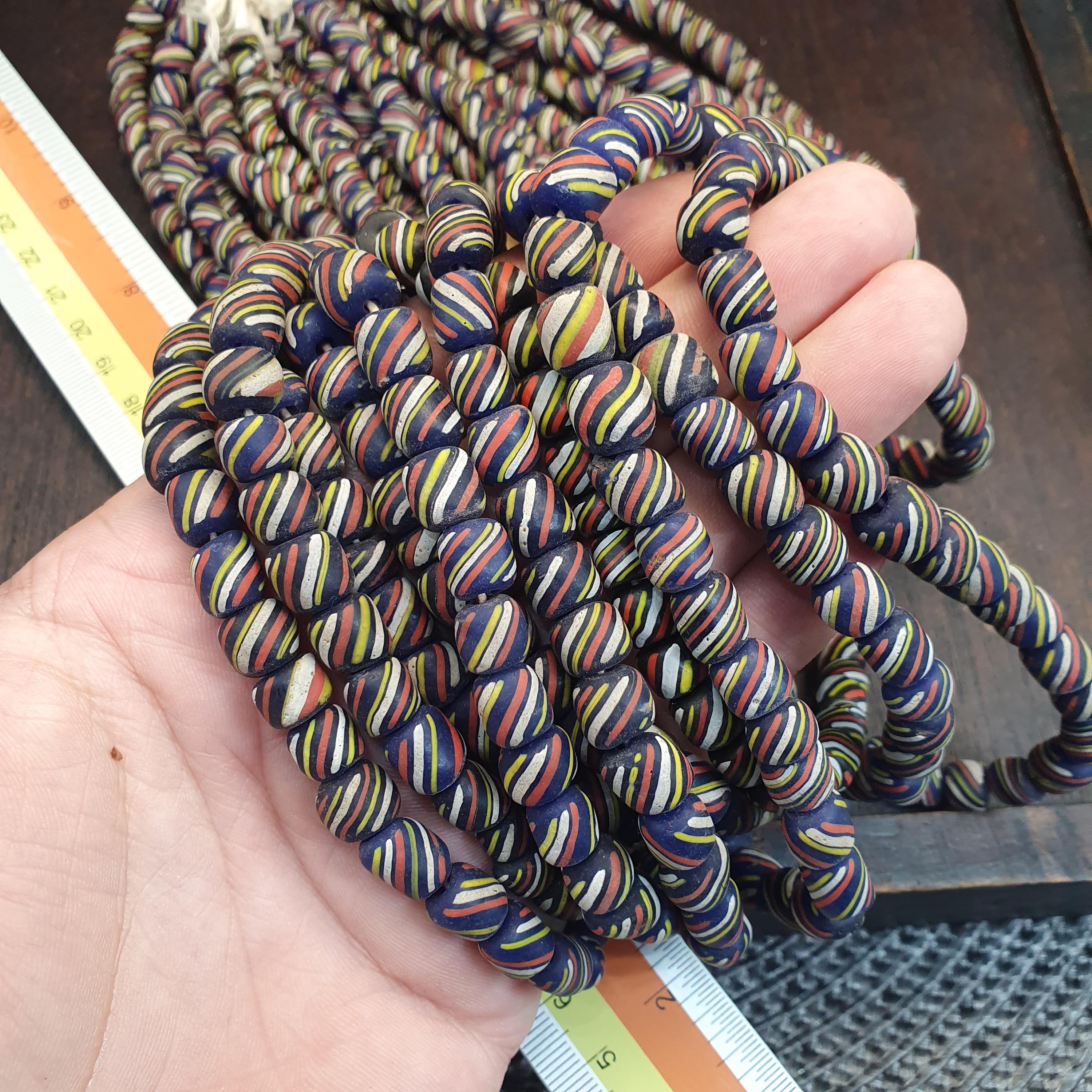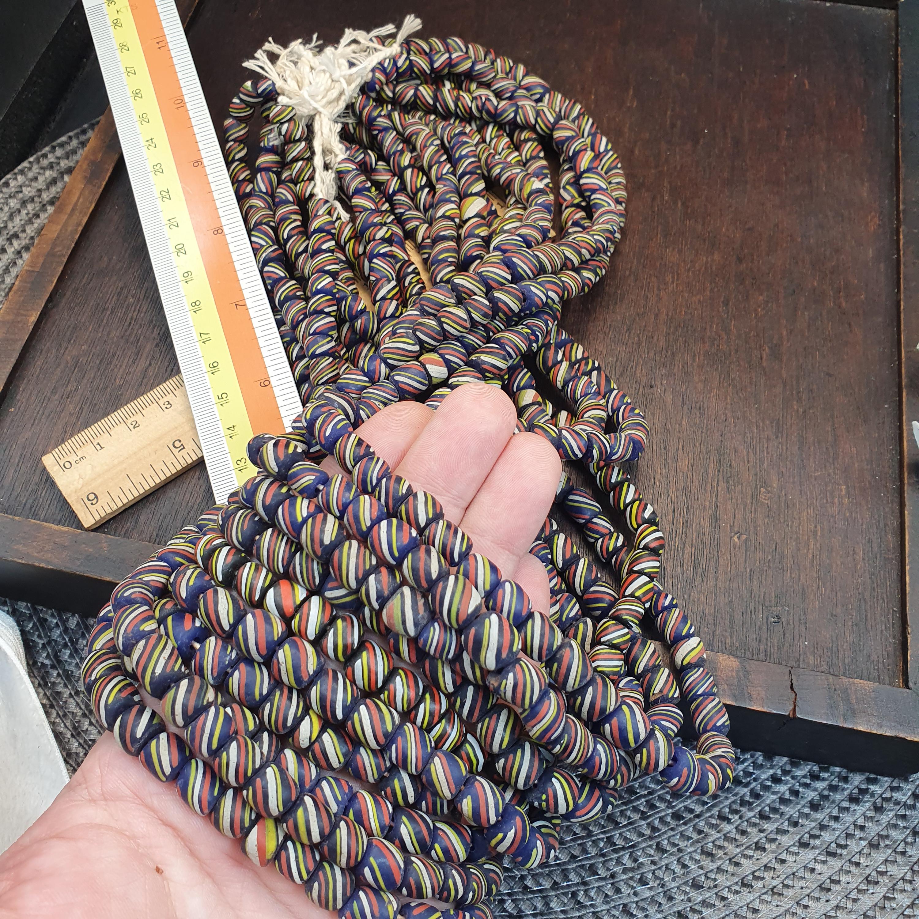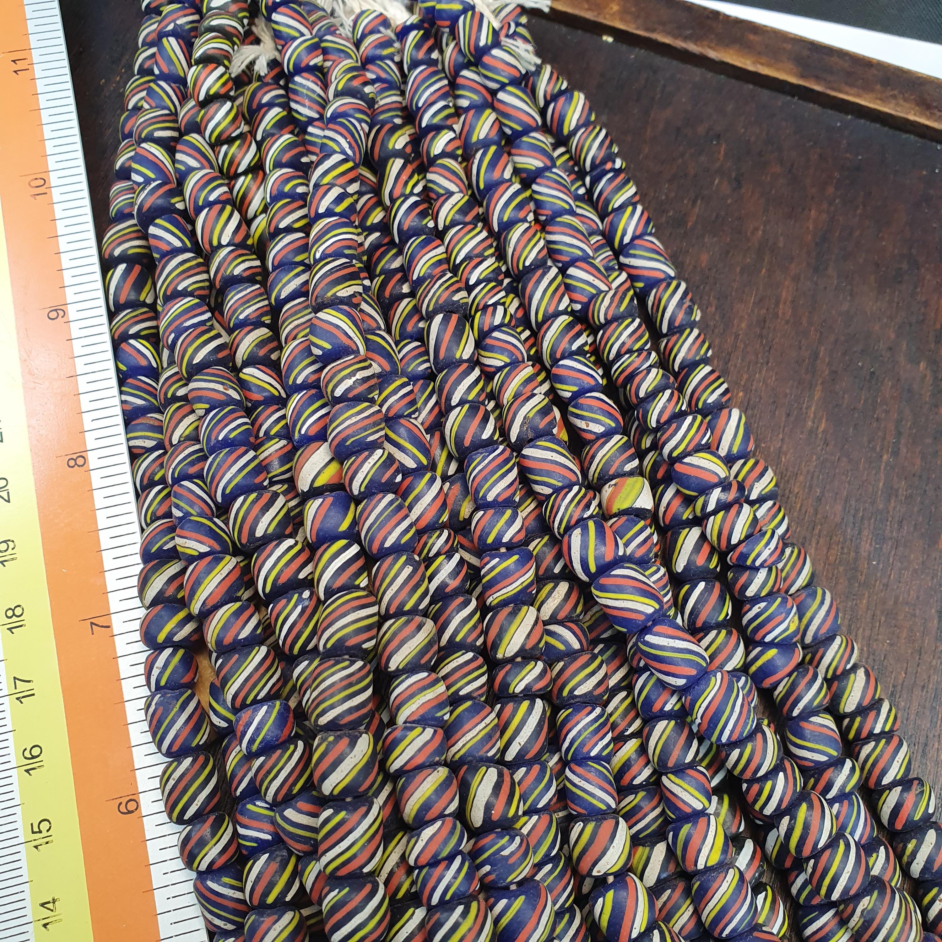 Bring energy and tradition to your jewelry designs with this beautiful, high-volume strand of striped glass trade beads. Often referred to as "Skunk" or "Candy Stripe" beads, these are a staple of African trade bead history and offer a bold, graphic look for modern creators.