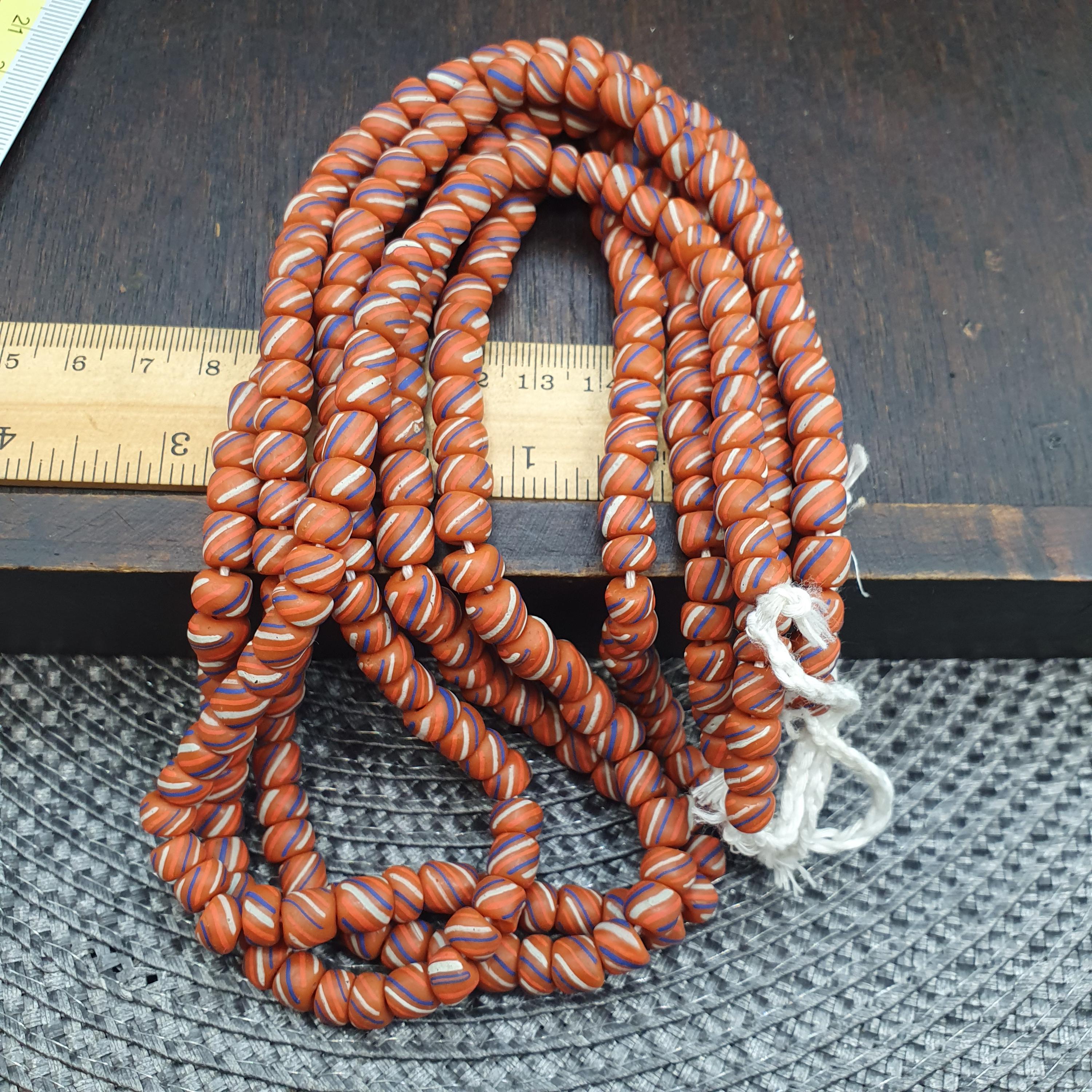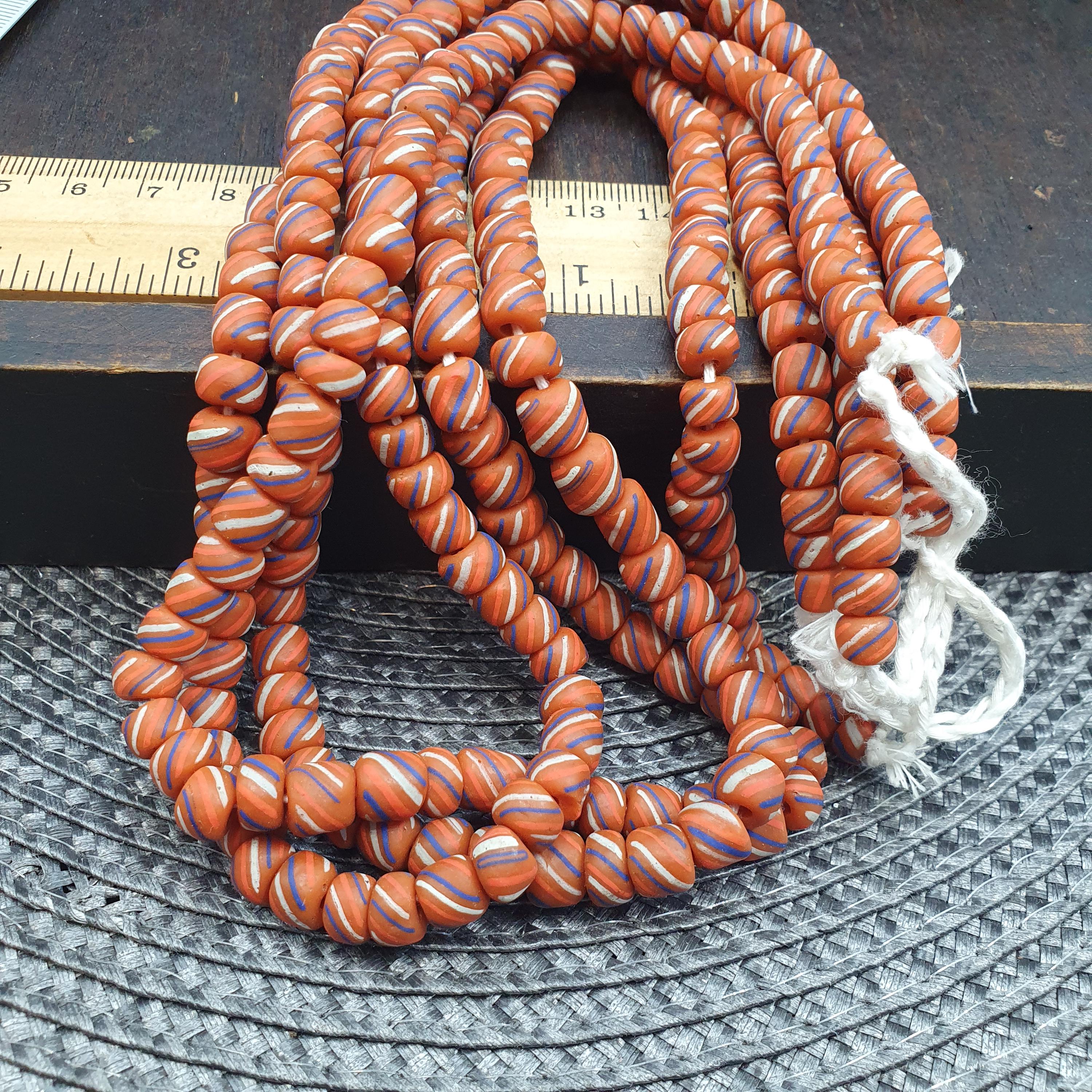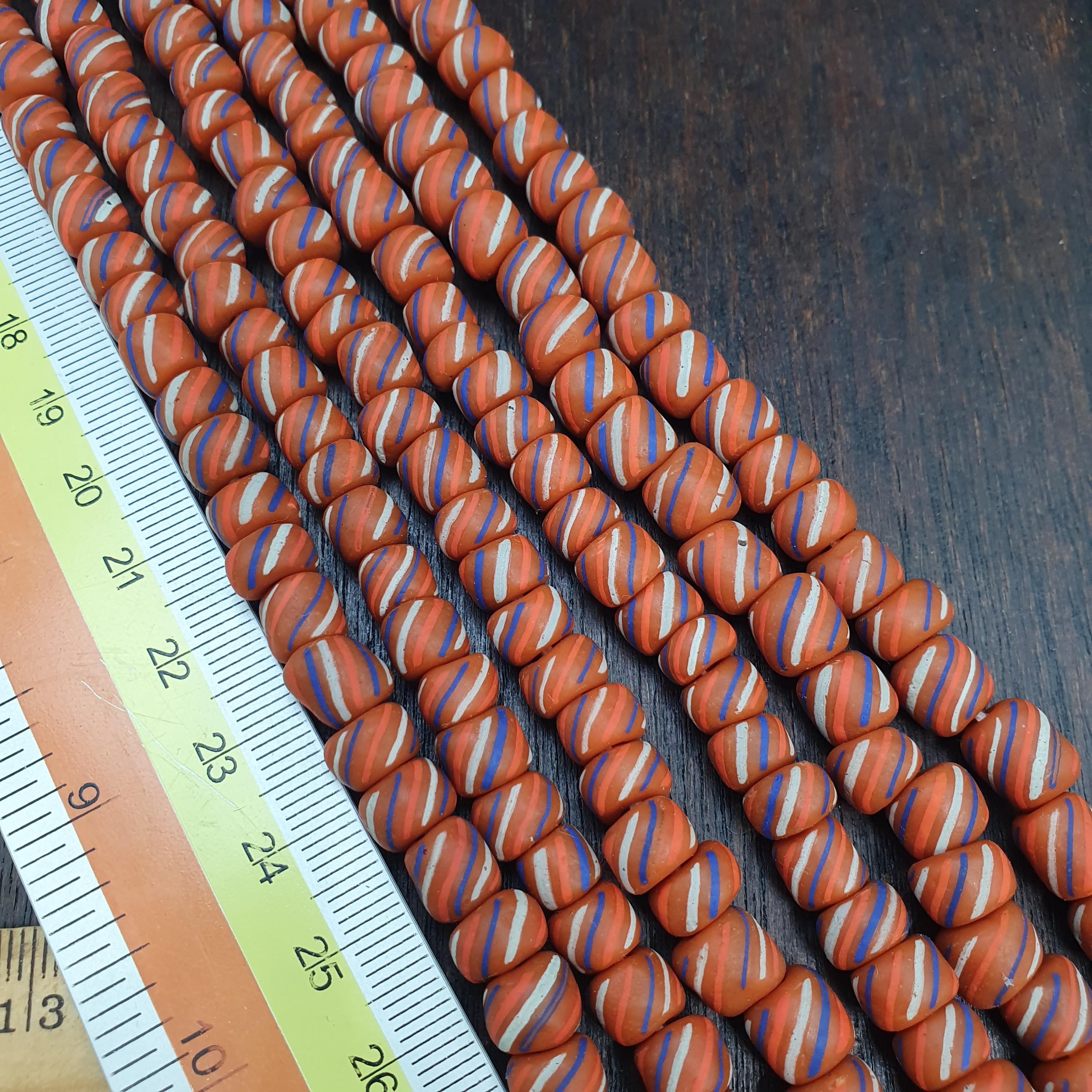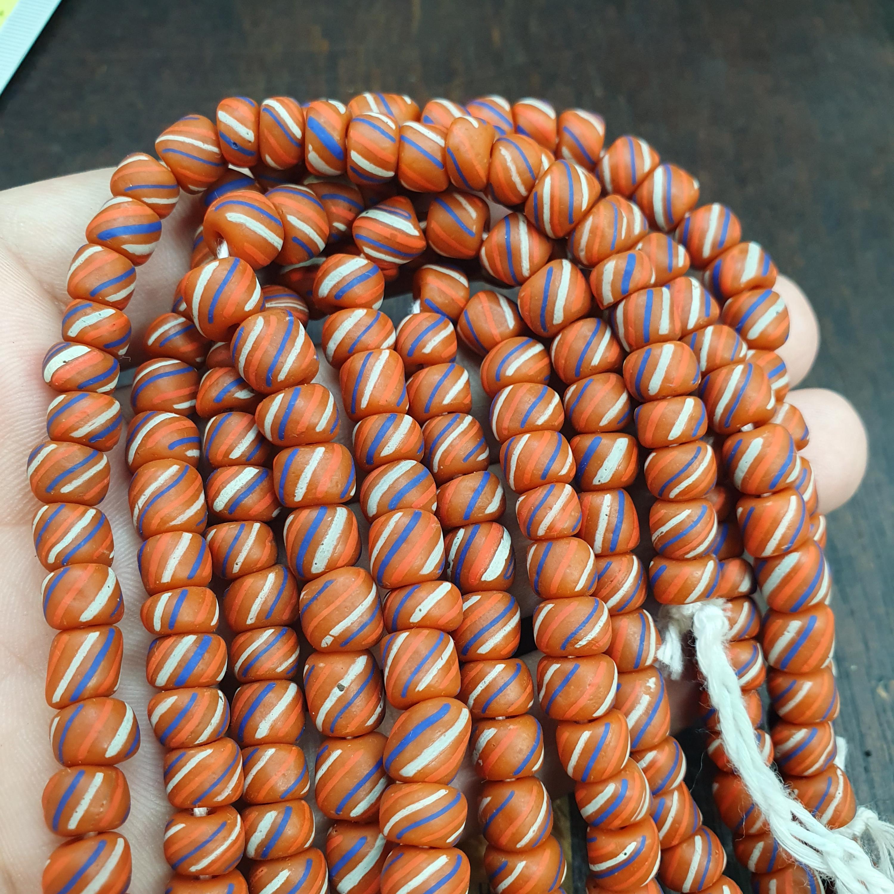 Elevate your jewelry designs with the warm, earthy tones of this premium strand of striped glass trade beads. These Venetian-style "Skunk" beads feature a rich terracotta orange base, beautifully accented with hand-applied blue and white diagonal stripes.