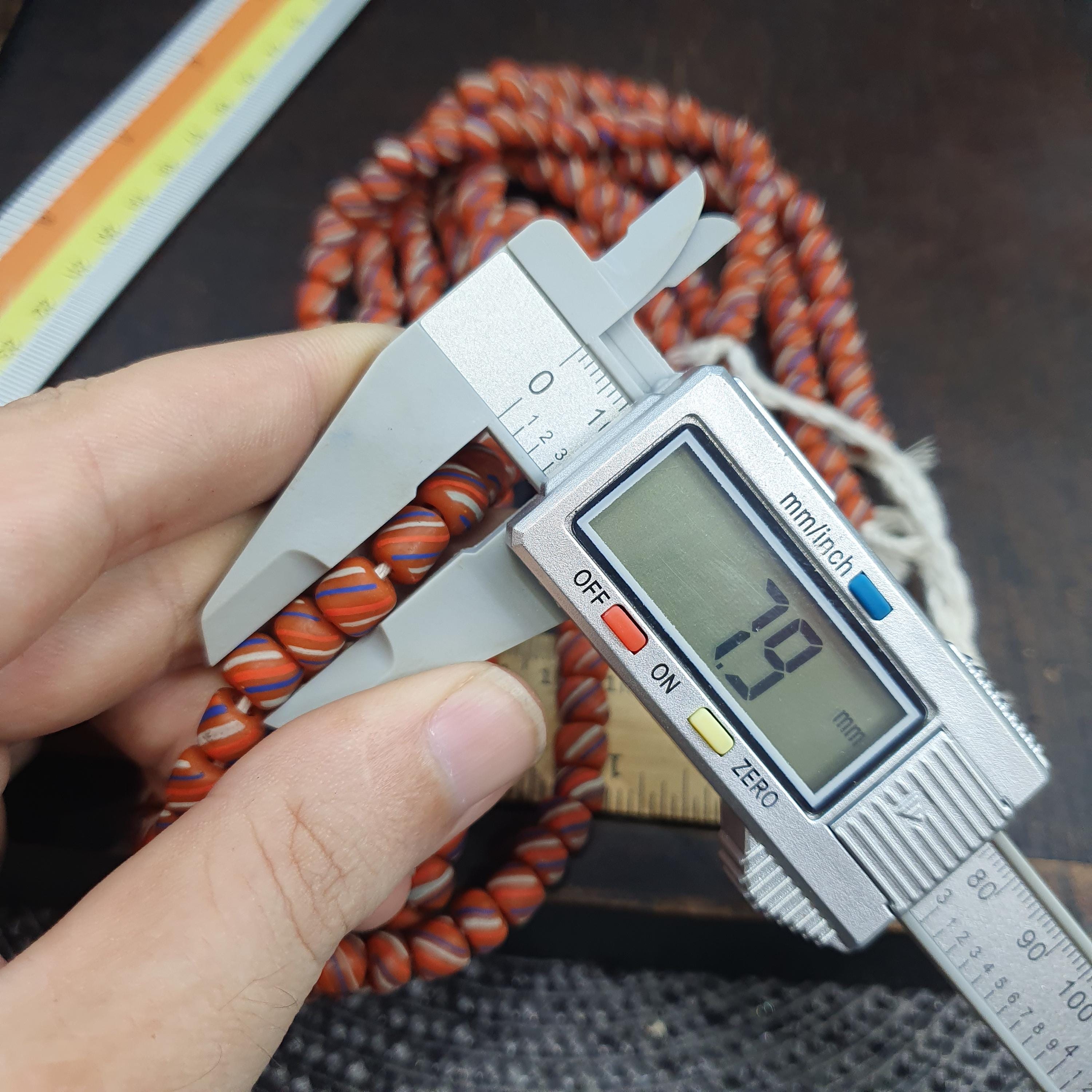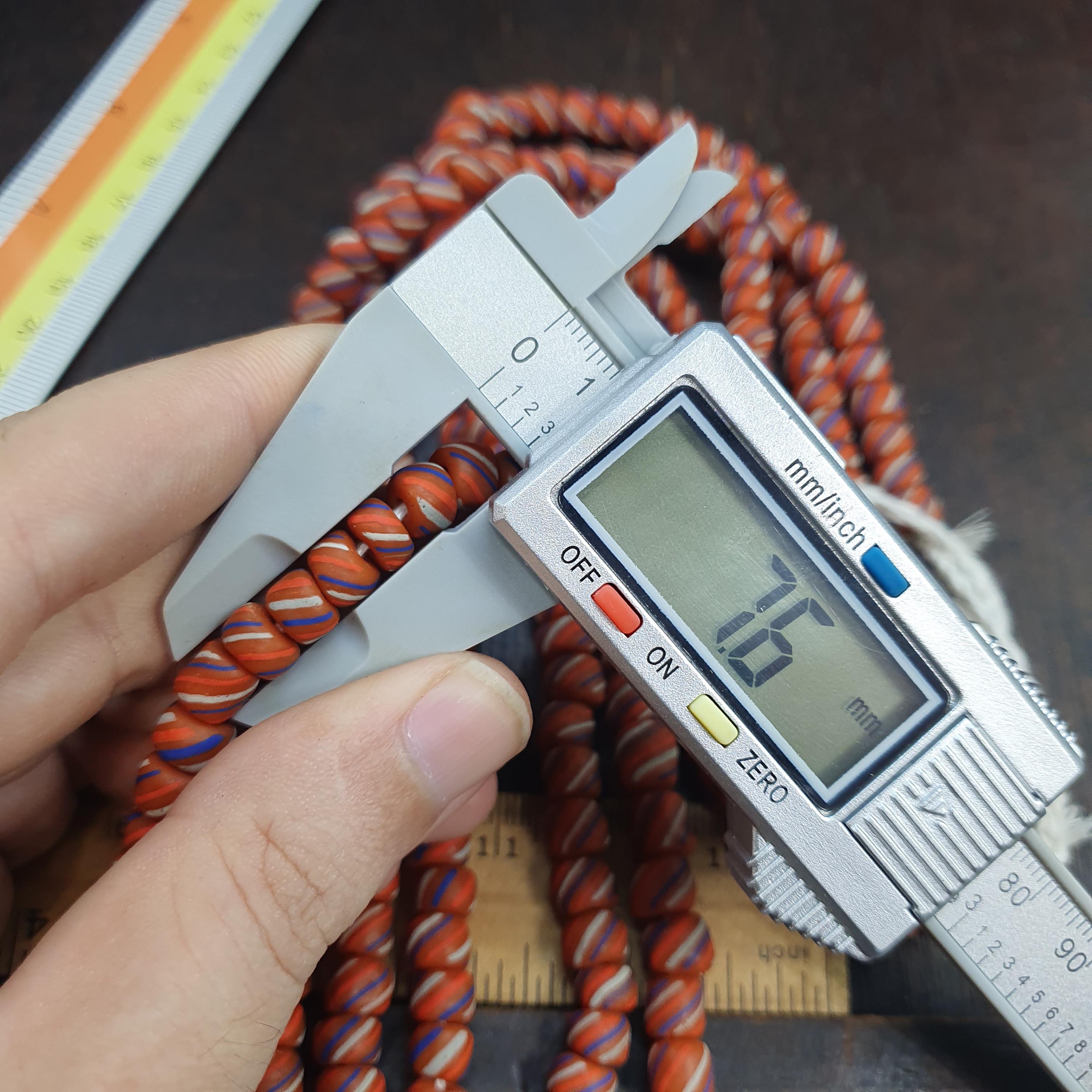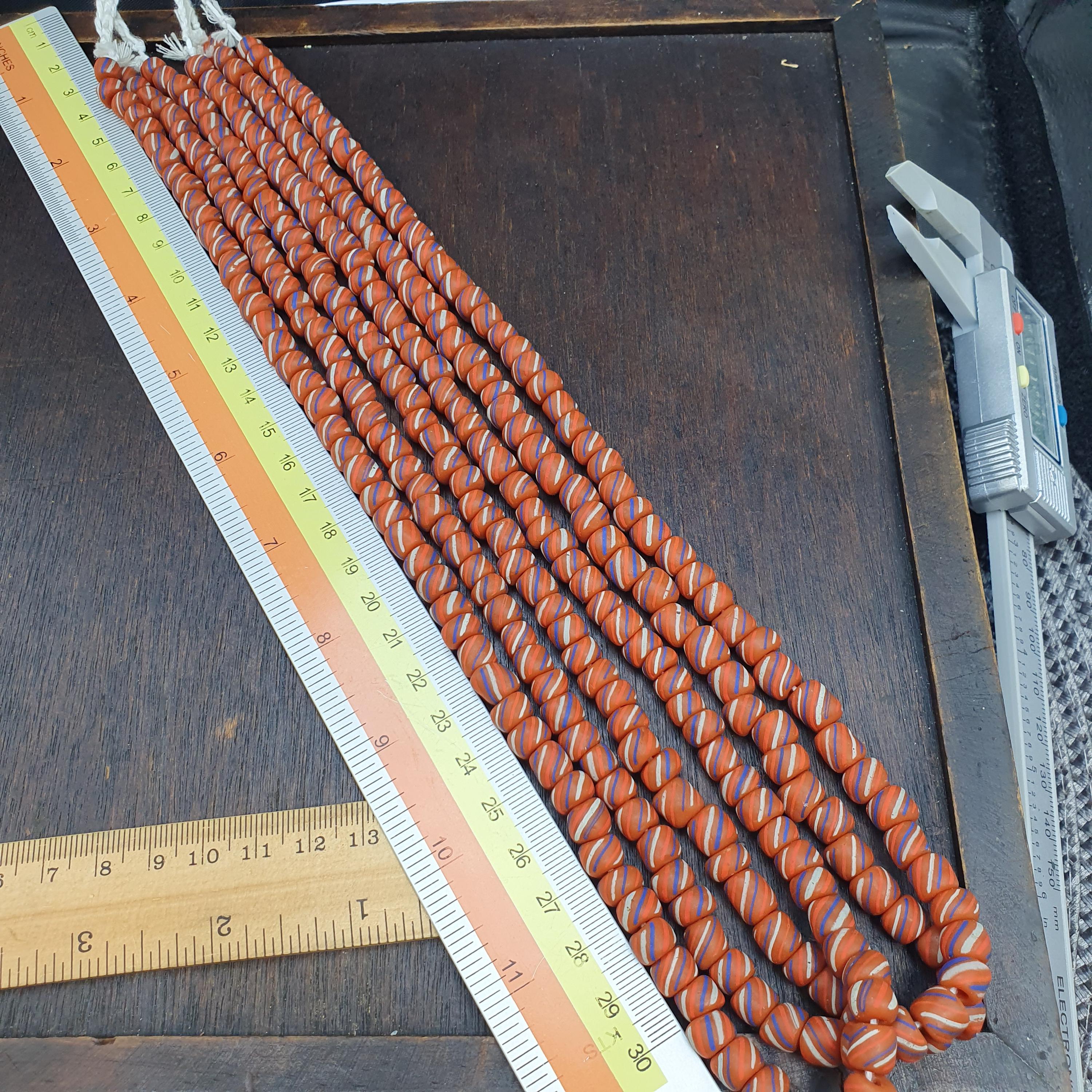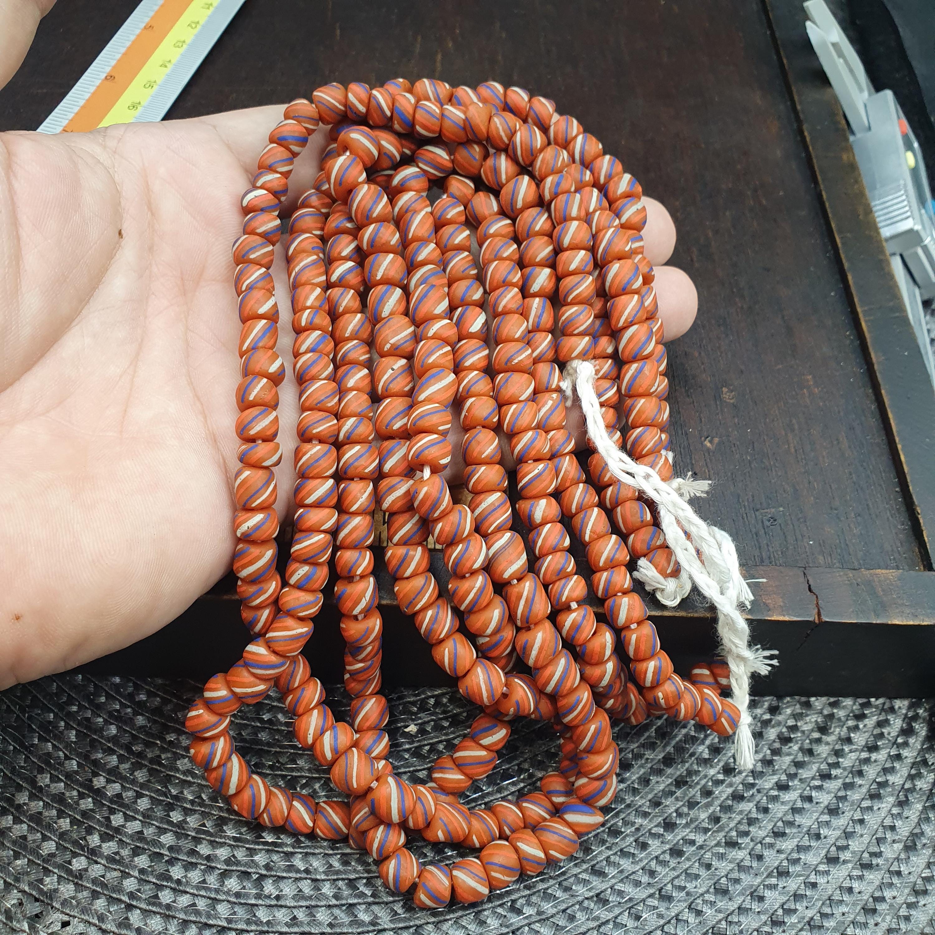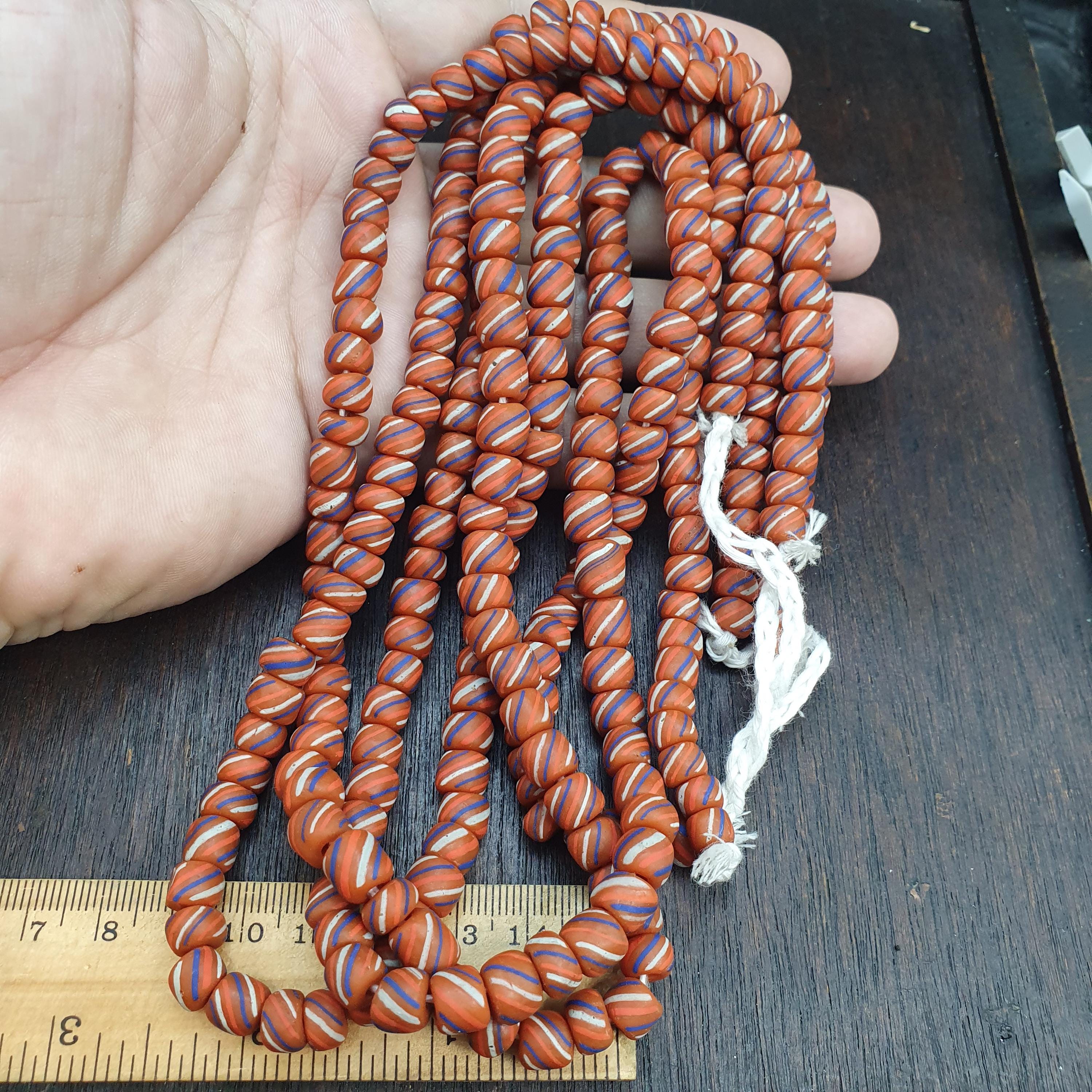 Elevate your jewelry designs with the warm, earthy tones of this premium strand of striped glass trade beads. These Venetian-style "Skunk" beads feature a rich terracotta orange base, beautifully accented with hand-applied blue and white diagonal stripes.