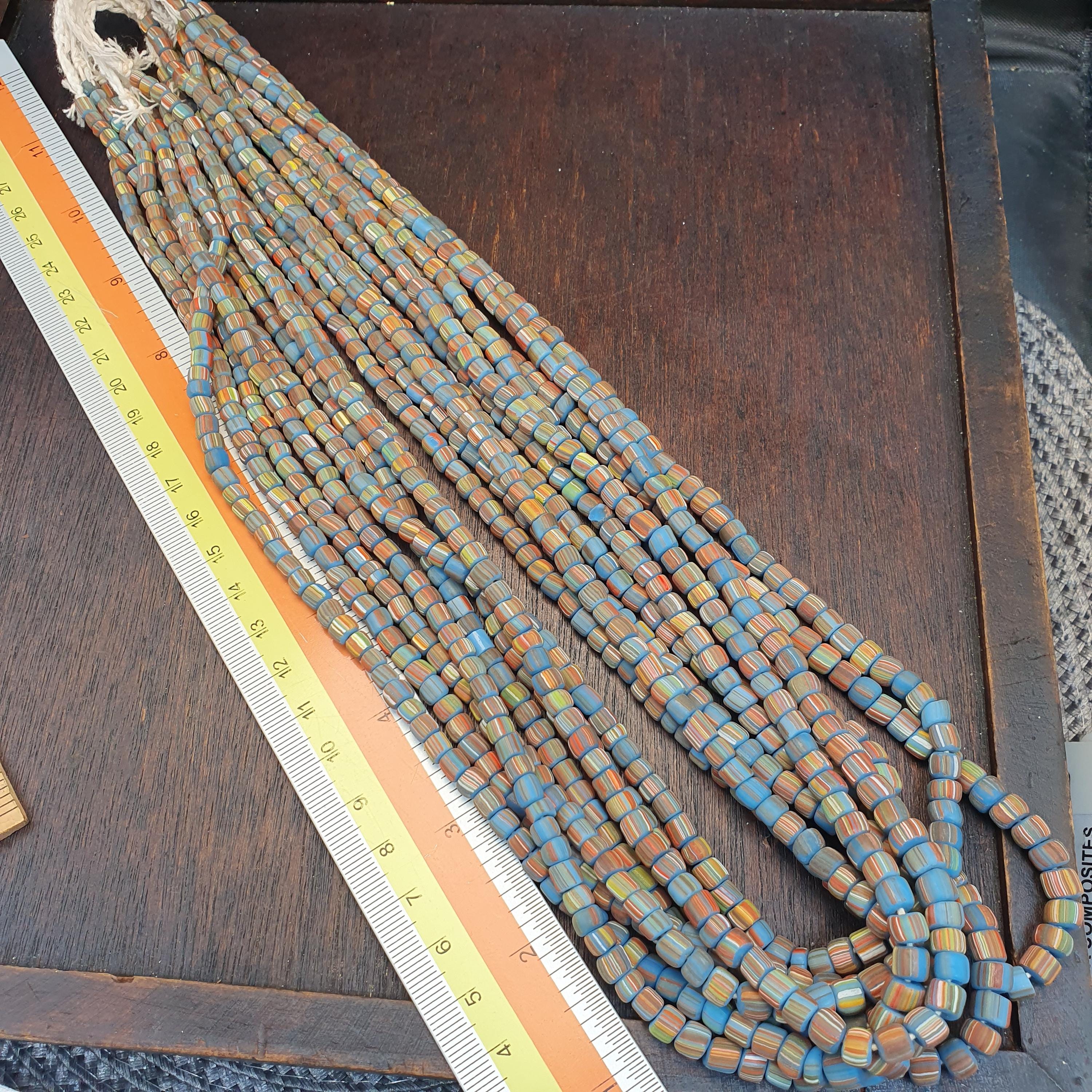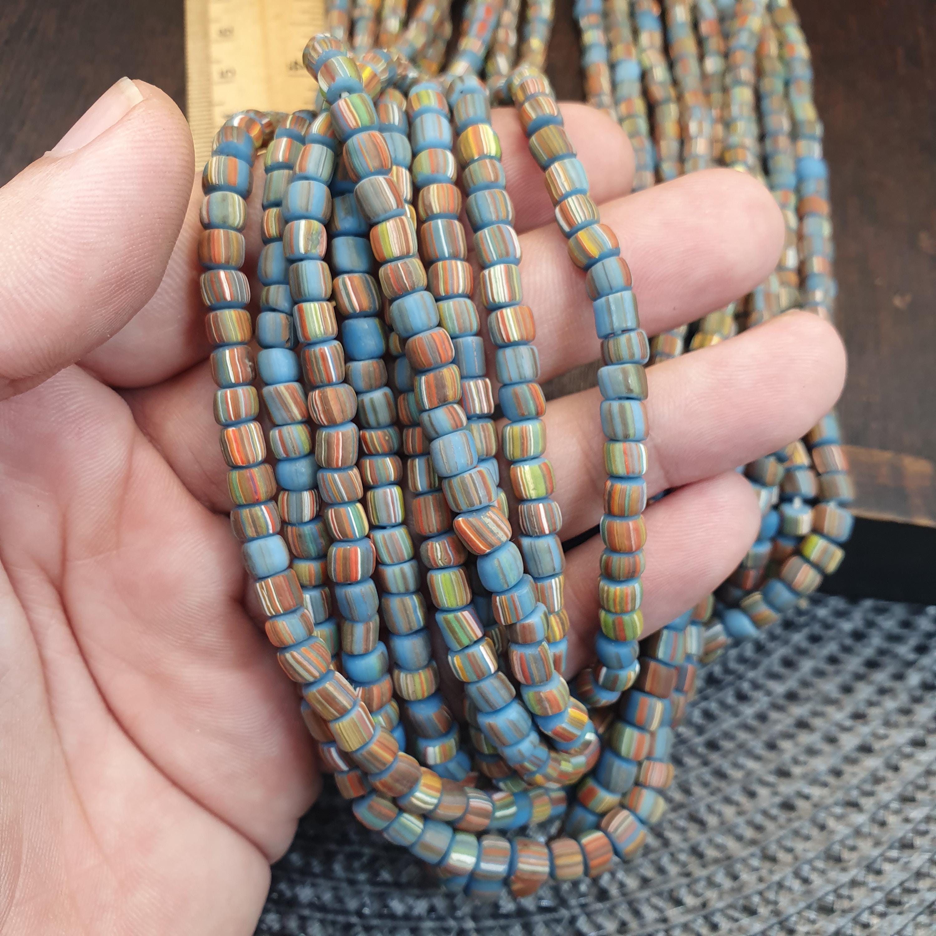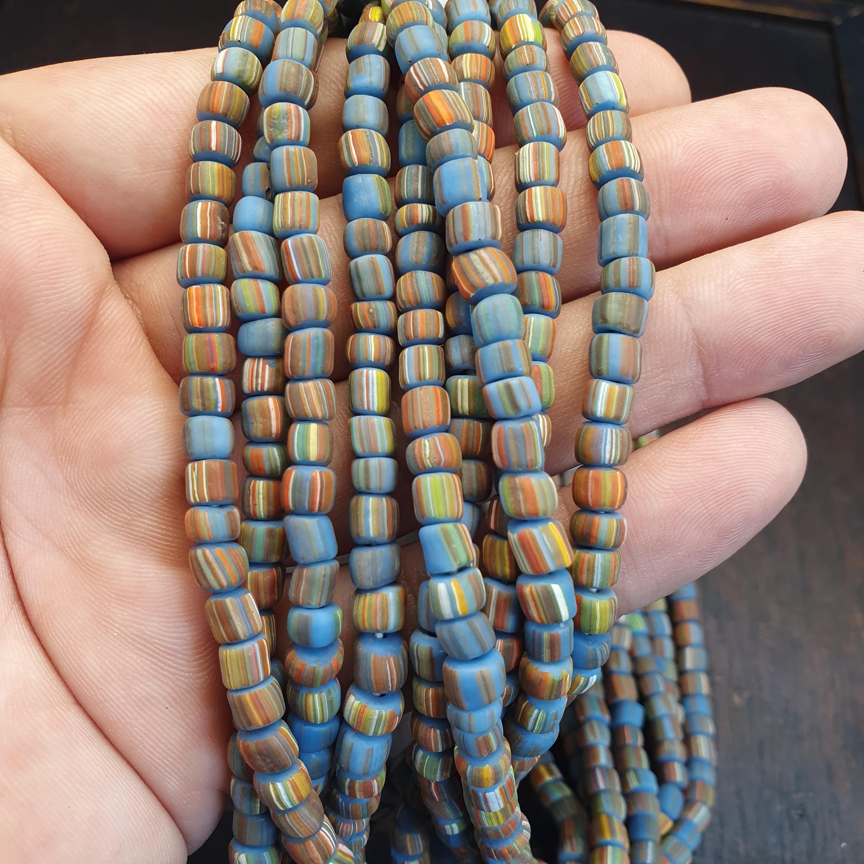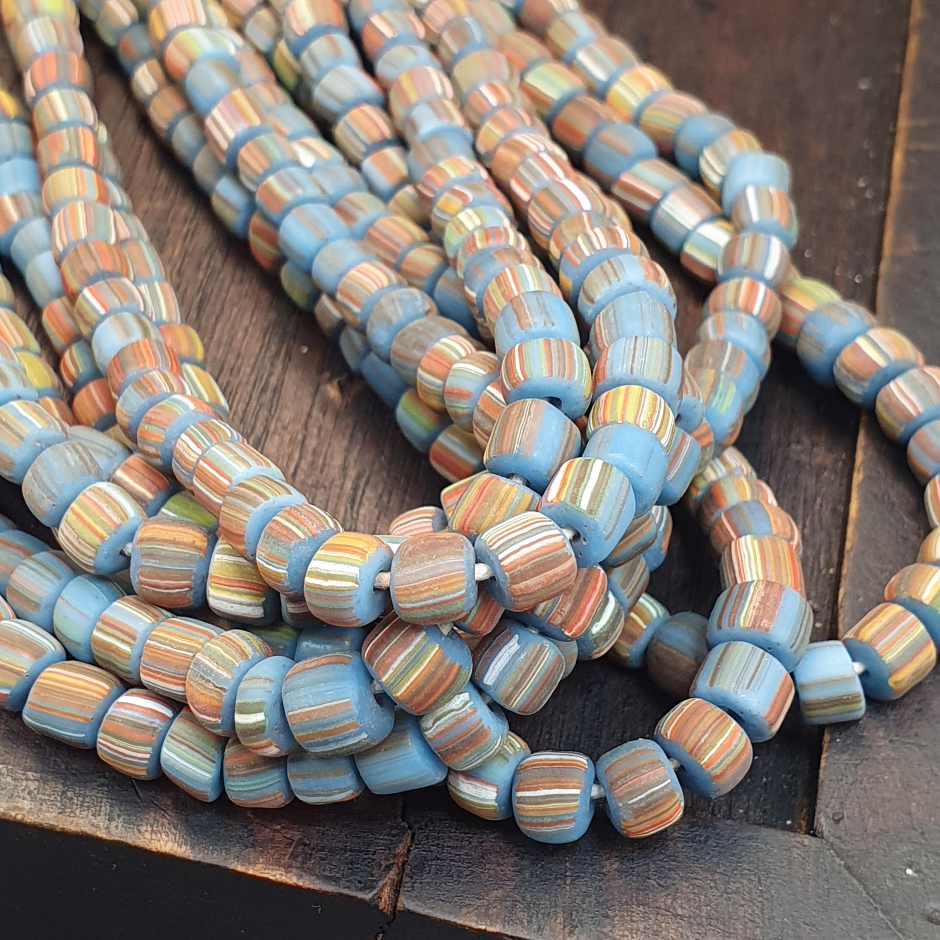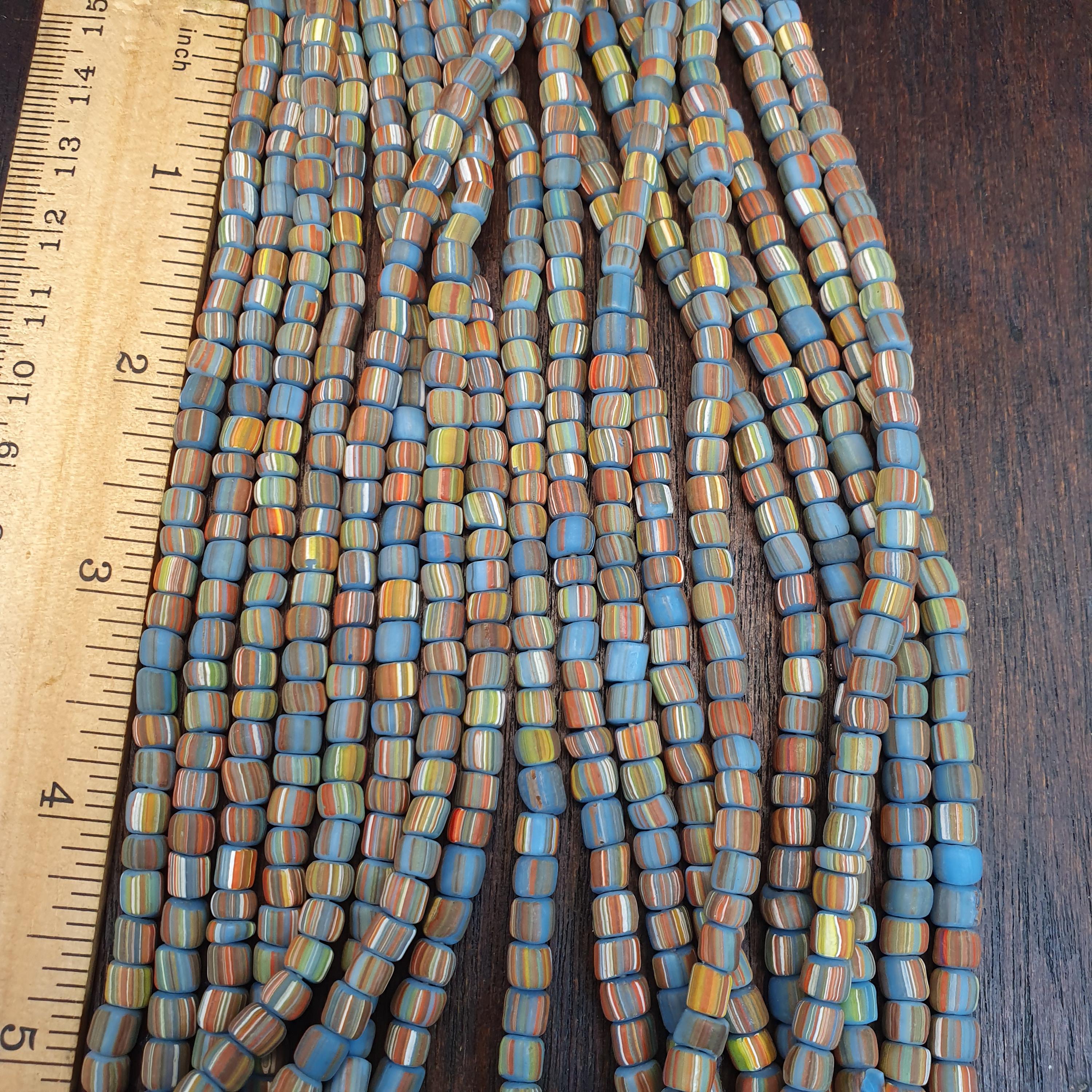 This beautiful strand of Venetian Millefiori "Gooseberry" Trade Beads features a vibrant turquoise-blue base accented with delicate multi-color stripes. At approximately 5.6mm to 5.7mm, these beads are the ideal "small" or "seed" size, making them a rare find for jewelry designers looking to create delicate earrings, layered bracelets, or intricate tribal-style necklaces.