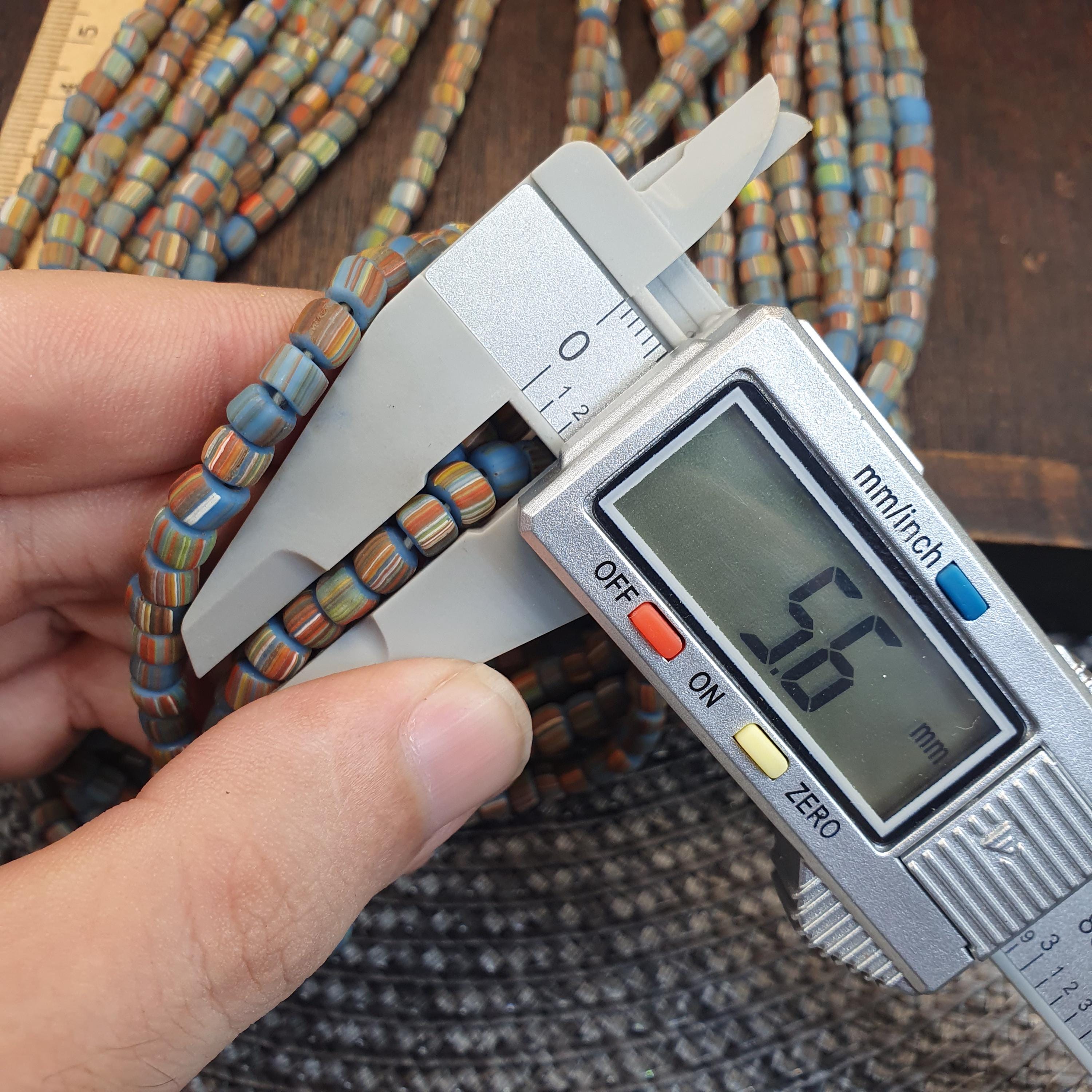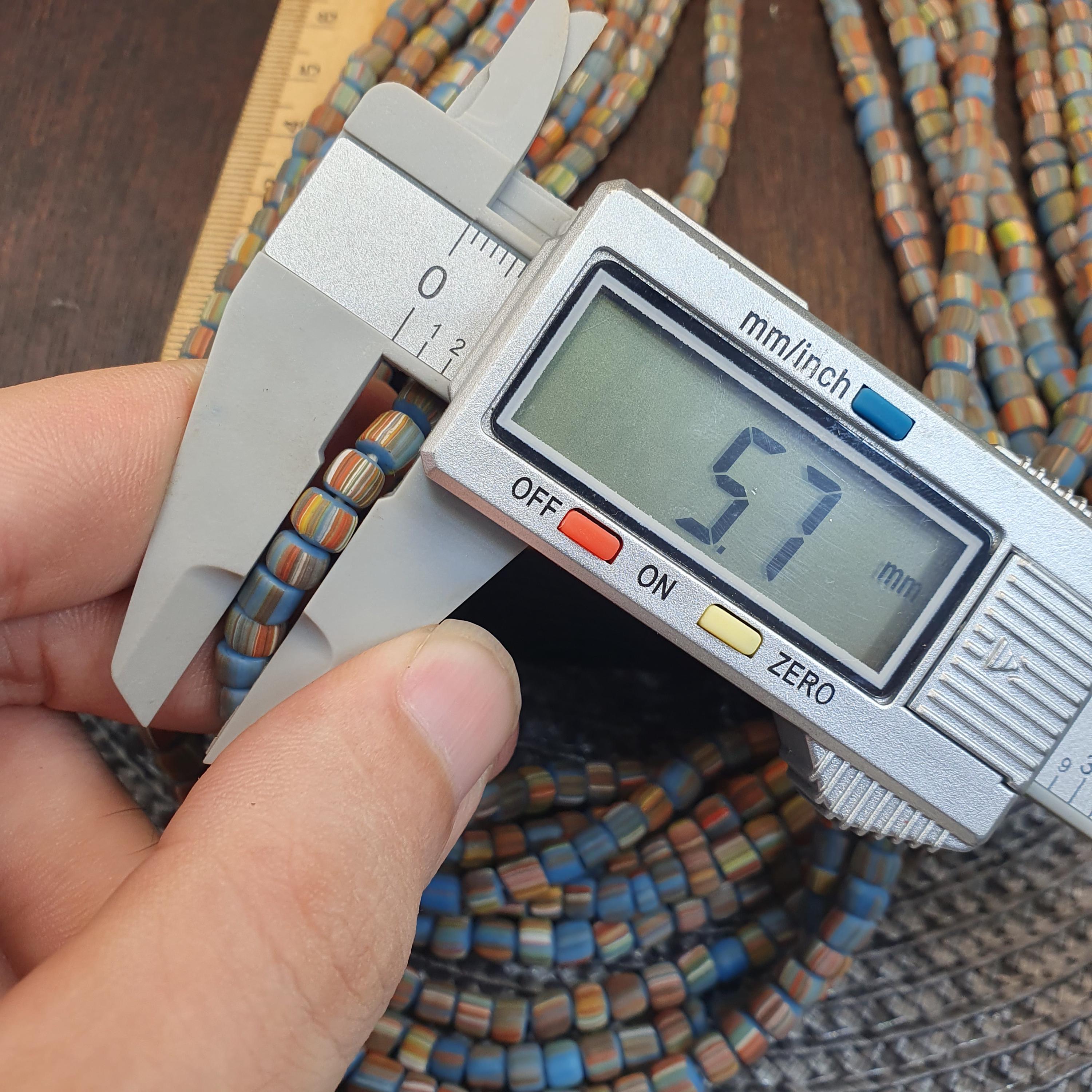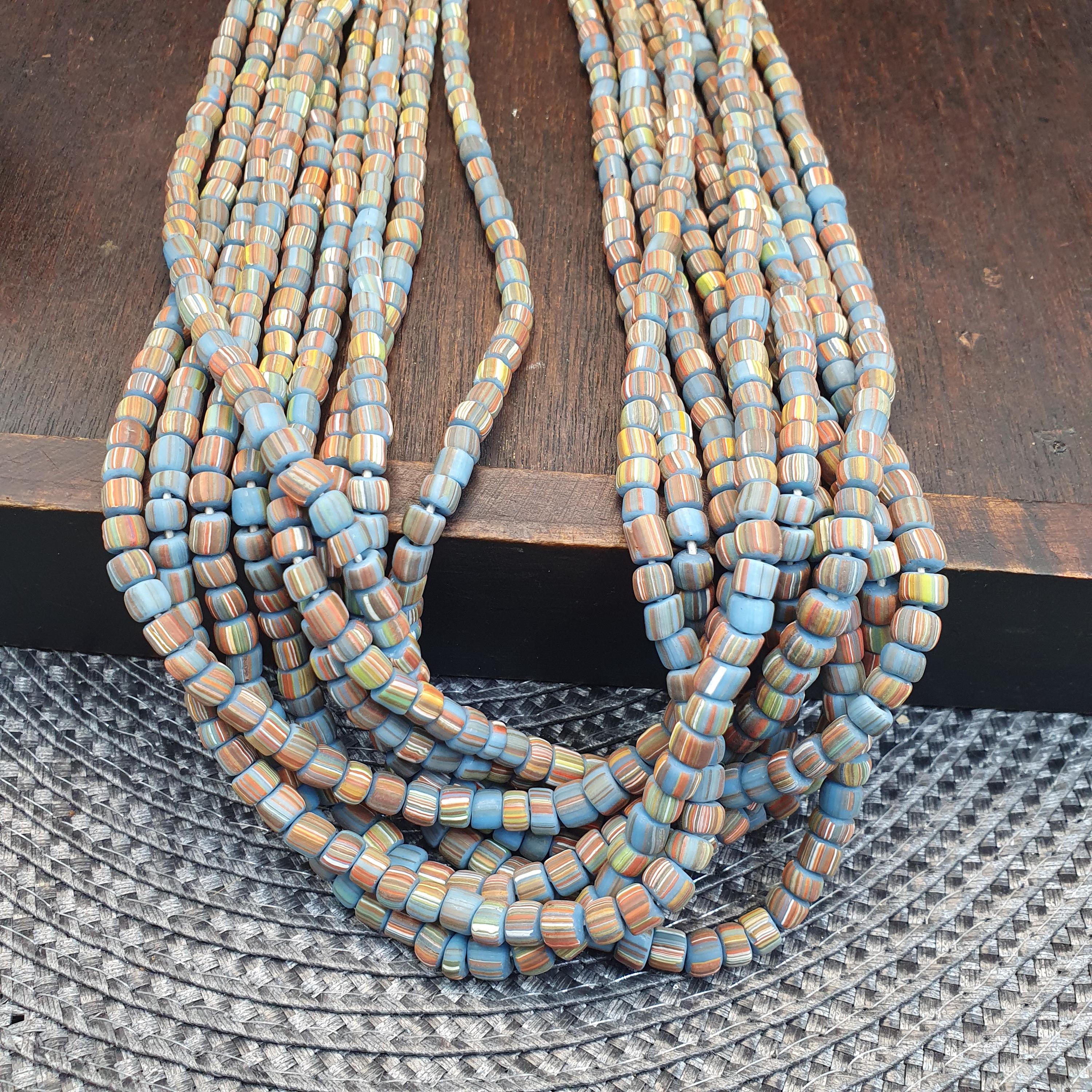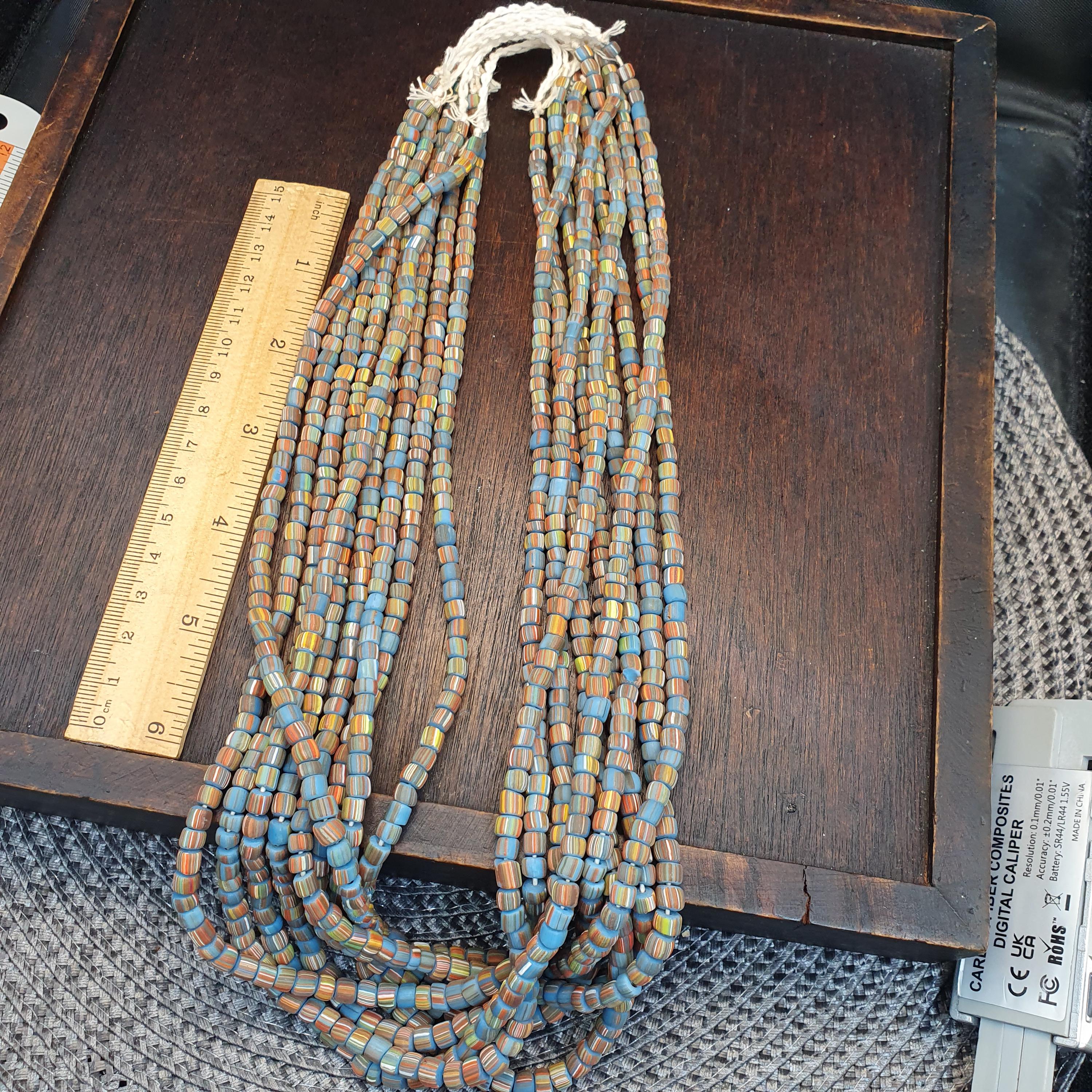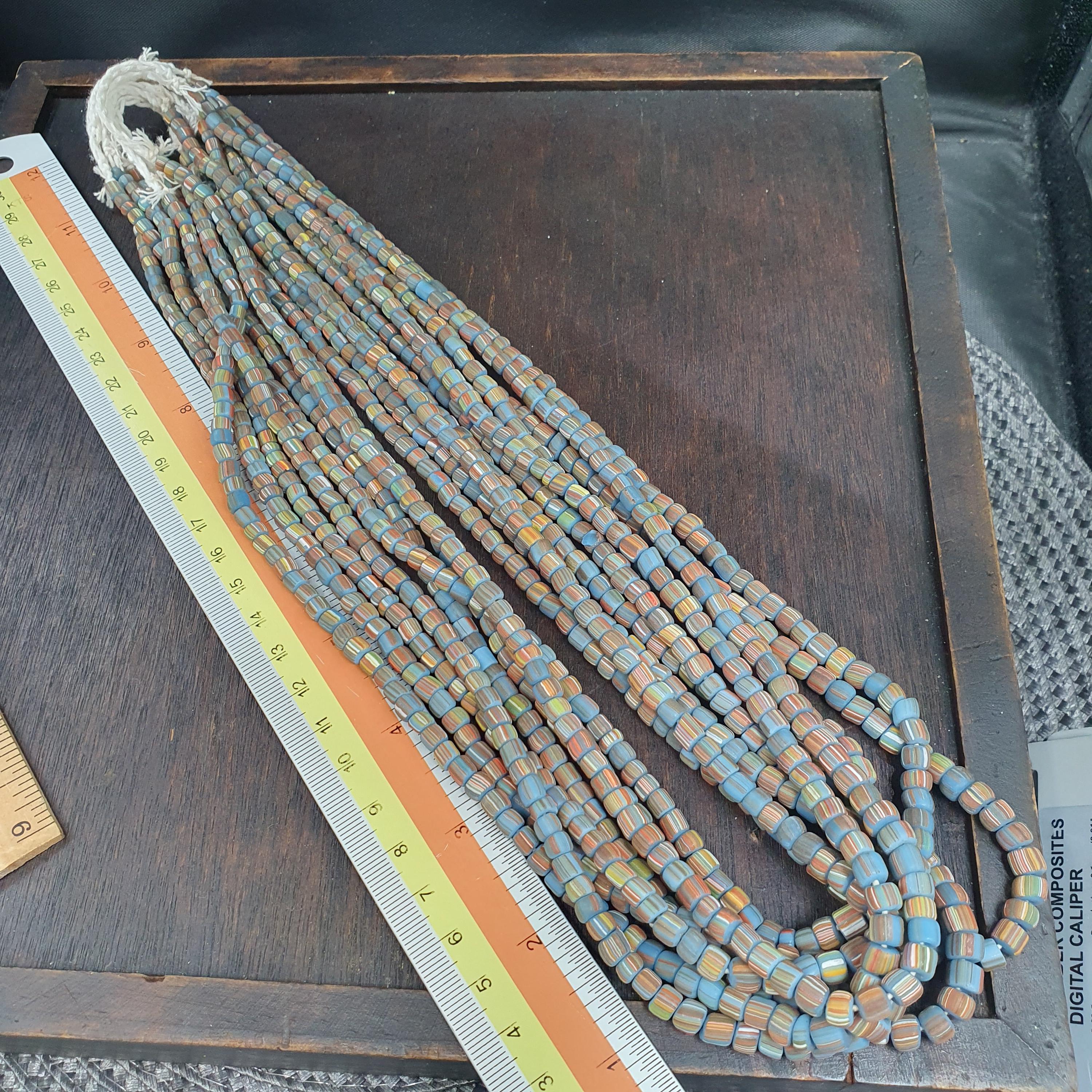 This beautiful strand of Venetian Millefiori "Gooseberry" Trade Beads features a vibrant turquoise-blue base accented with delicate multi-color stripes. At approximately 5.6mm to 5.7mm, these beads are the ideal "small" or "seed" size, making them a rare find for jewelry designers looking to create delicate earrings, layered bracelets, or intricate tribal-style necklaces.
